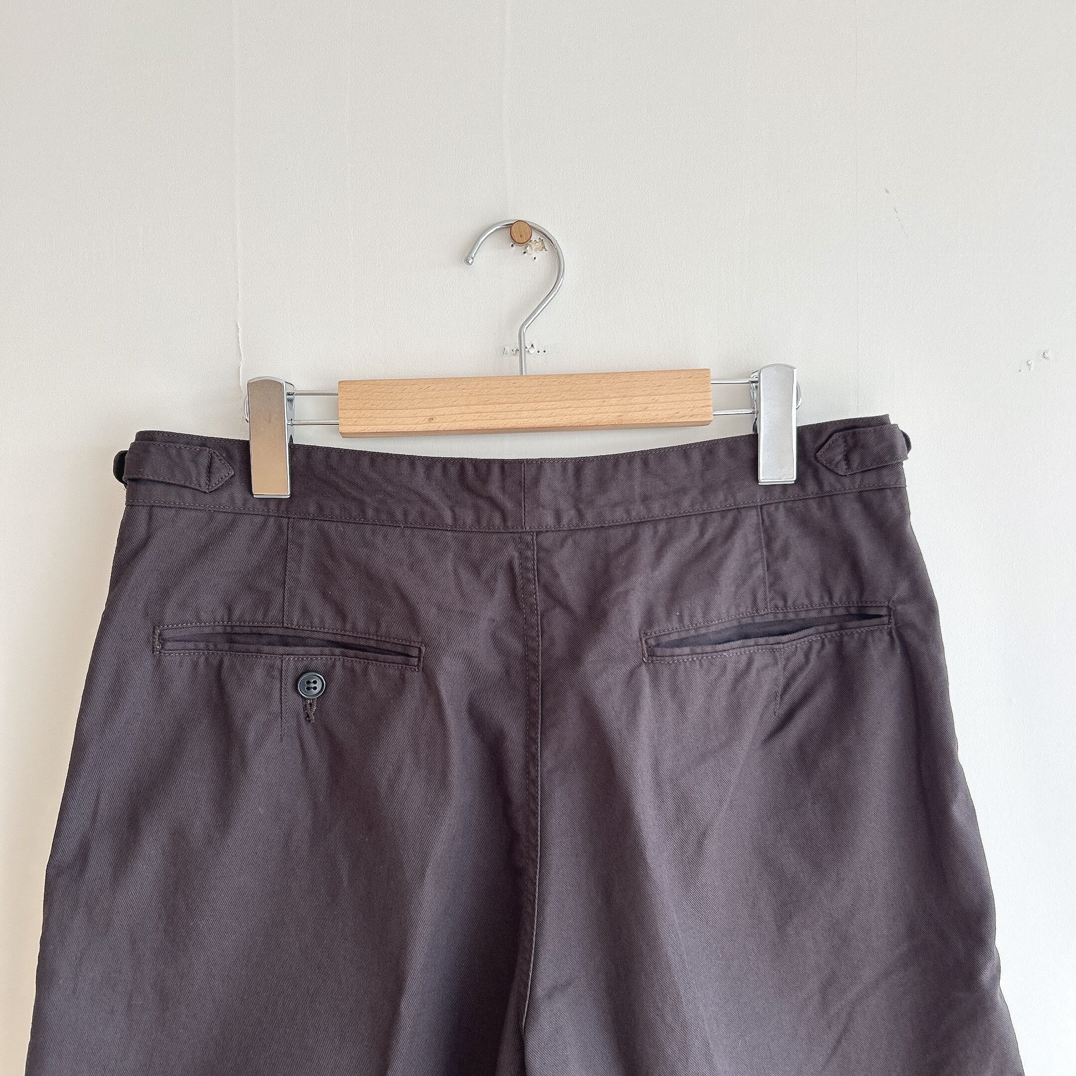 フロントには1タック、サイドにはウエスト調整の出来るアジャスターを、フロントボタンは2ボタンで、内側にも2ボタン。しっかり閉める事によってウエストラインの綺麗な見せ方に。