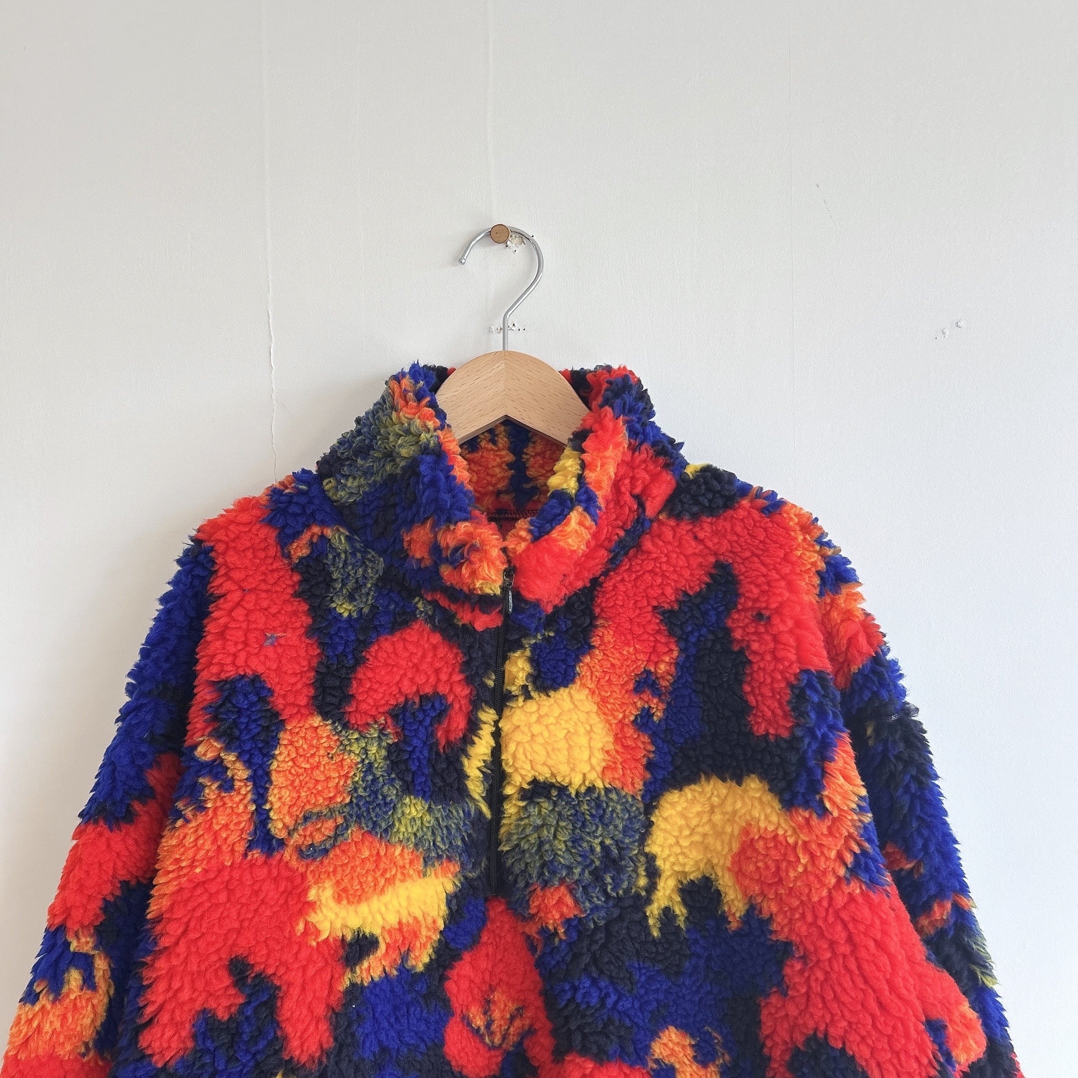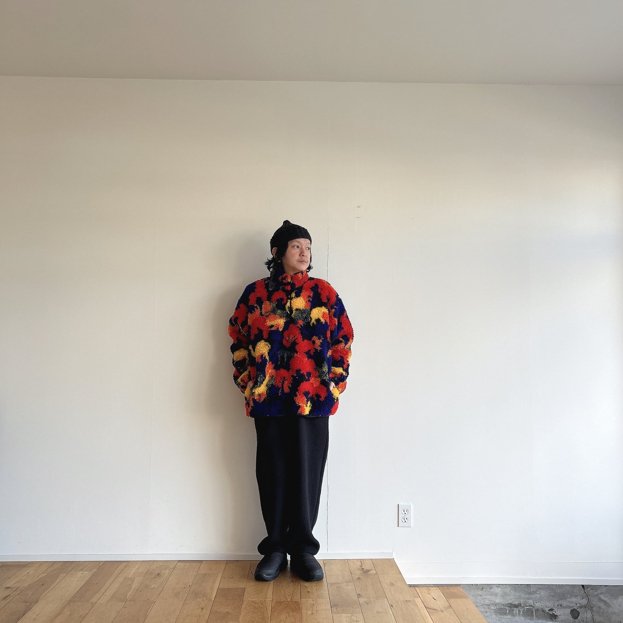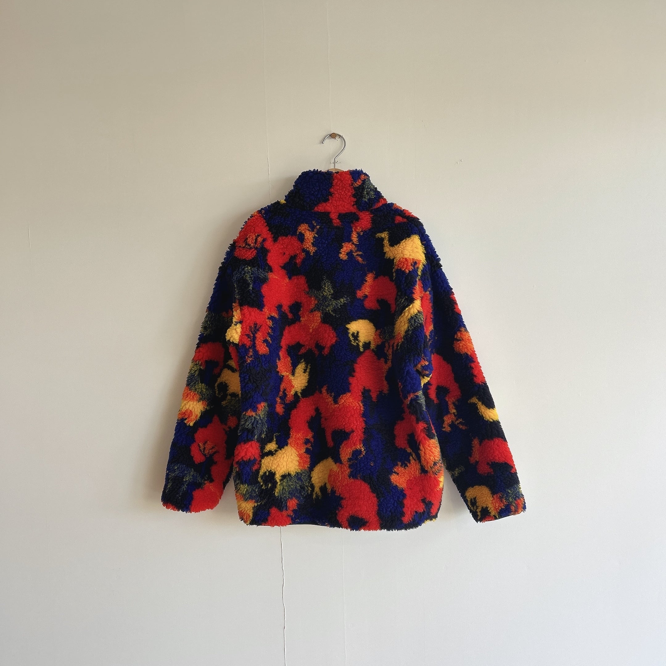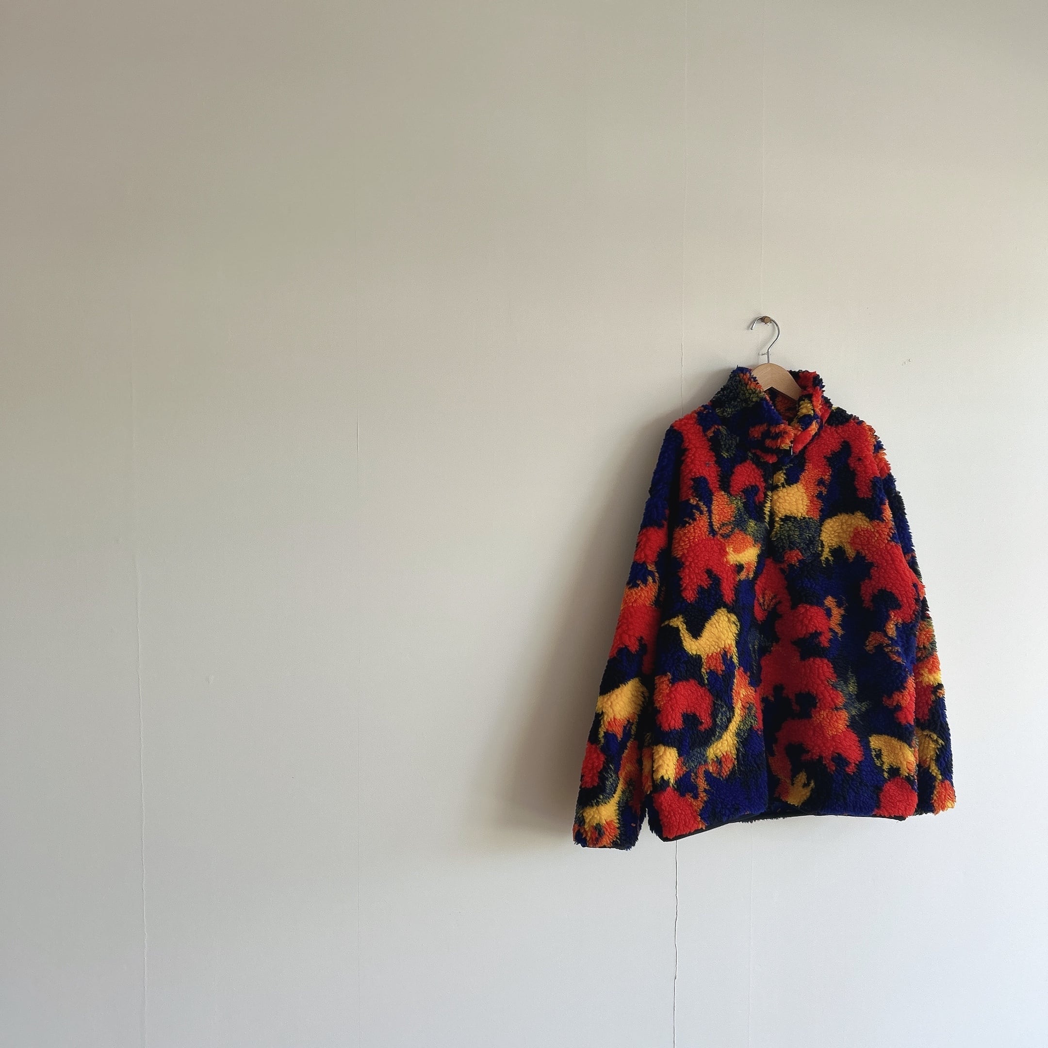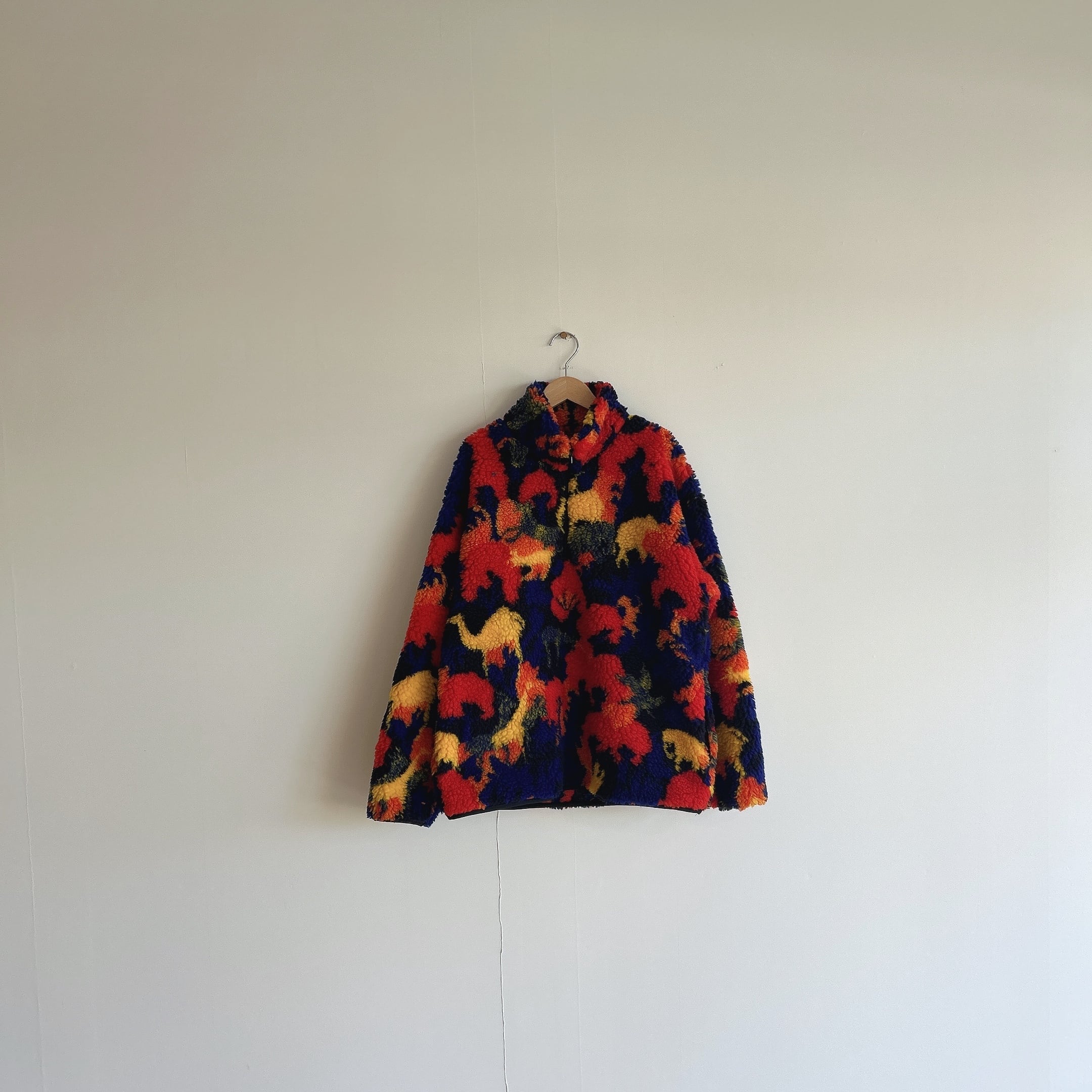型は柄のイメージとは違い、シンプルなスタンドカラー、表地は毛足の長いボア素材ですが、裏地は起毛させず、腕通りの良い仕上がりになっています。
