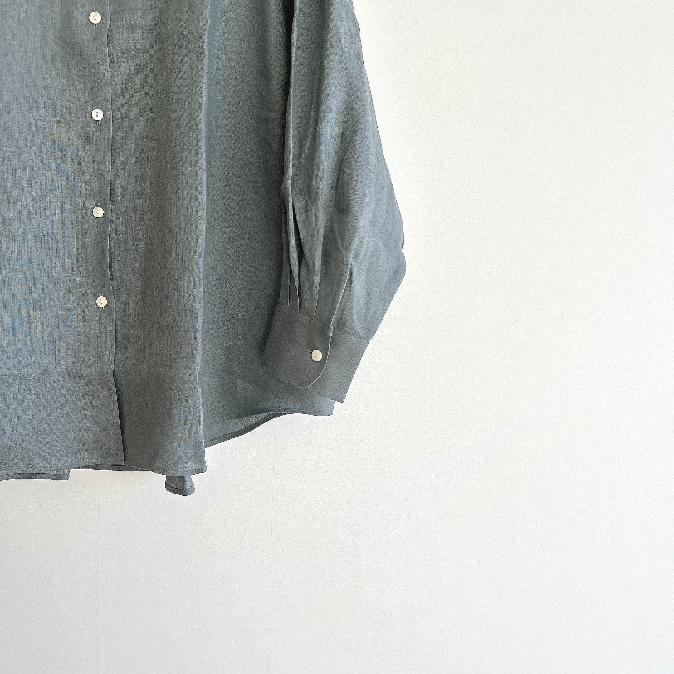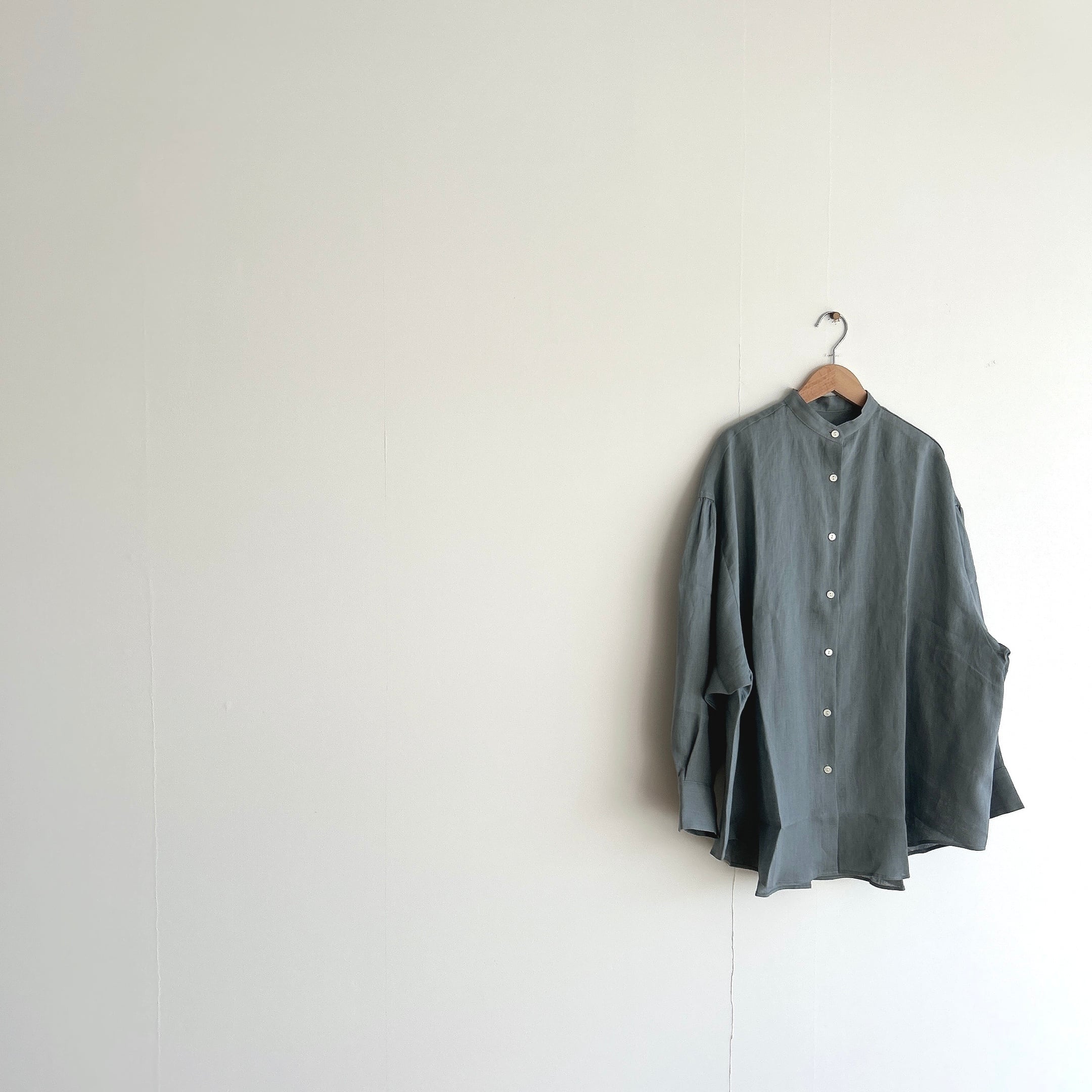 柔らかさを失わないよう、リネン特有の透け感を最小限に抑えるように尾州の旧織機でゆっくりと織り上げたシンプルなスタンドカラーのオーバーサイズシャツです。