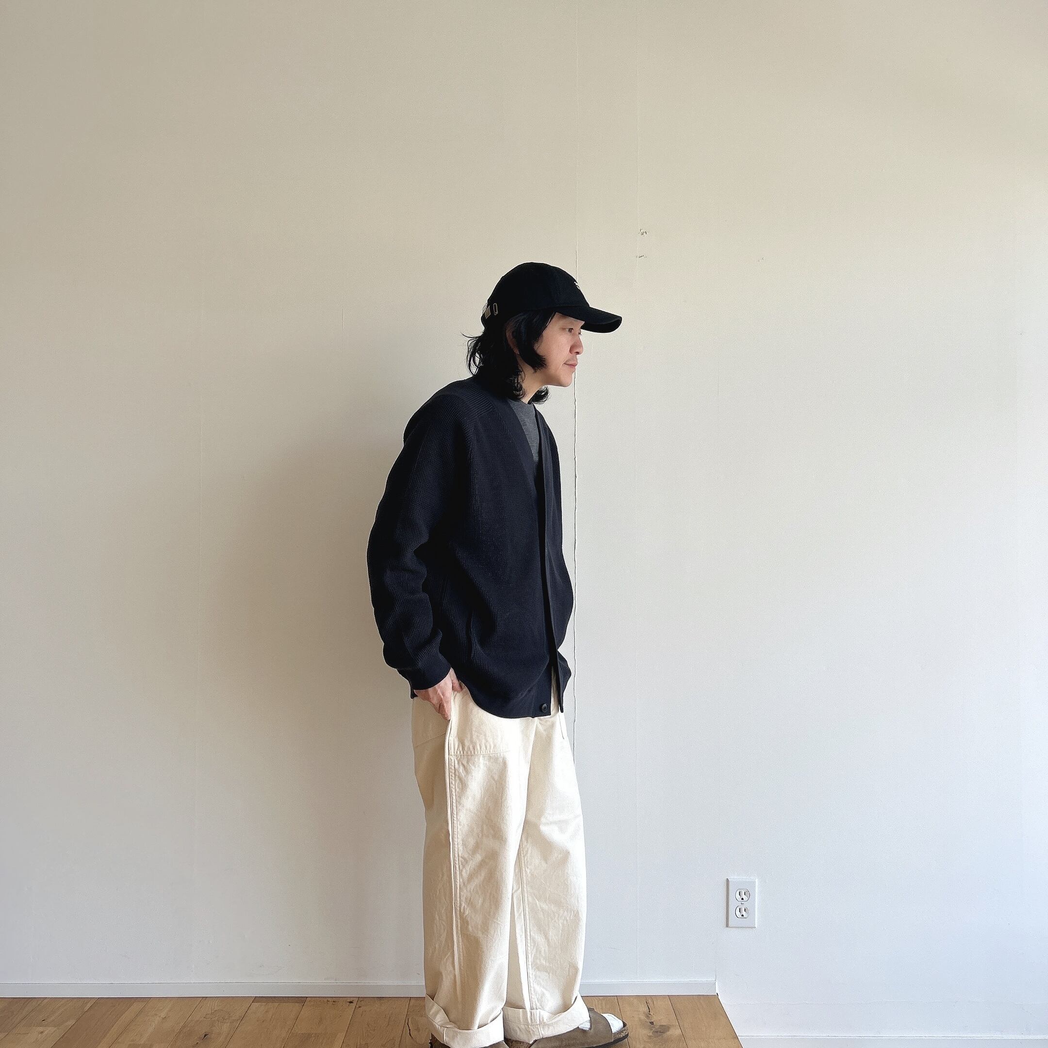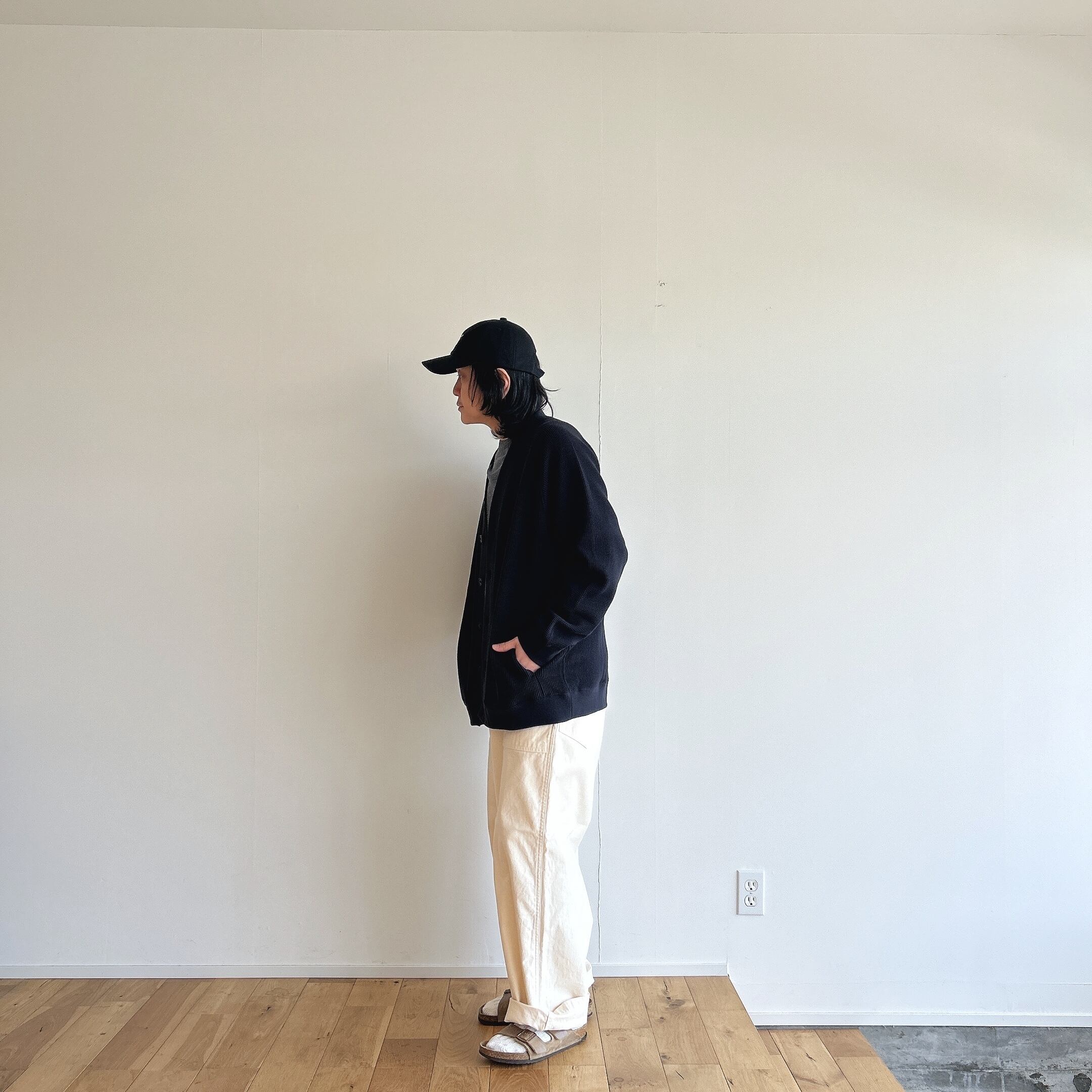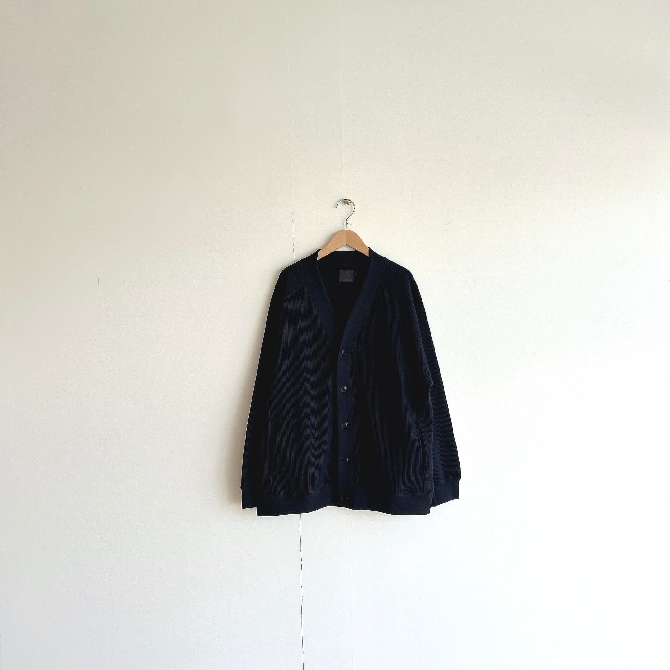 その綿を少し甘めに撚糸した糸を使用し、タイト目なワッフル生地を編みました、その為、触感は柔らかいのに、型崩れしづらく安心感のあるカーディガンの仕上がりに。