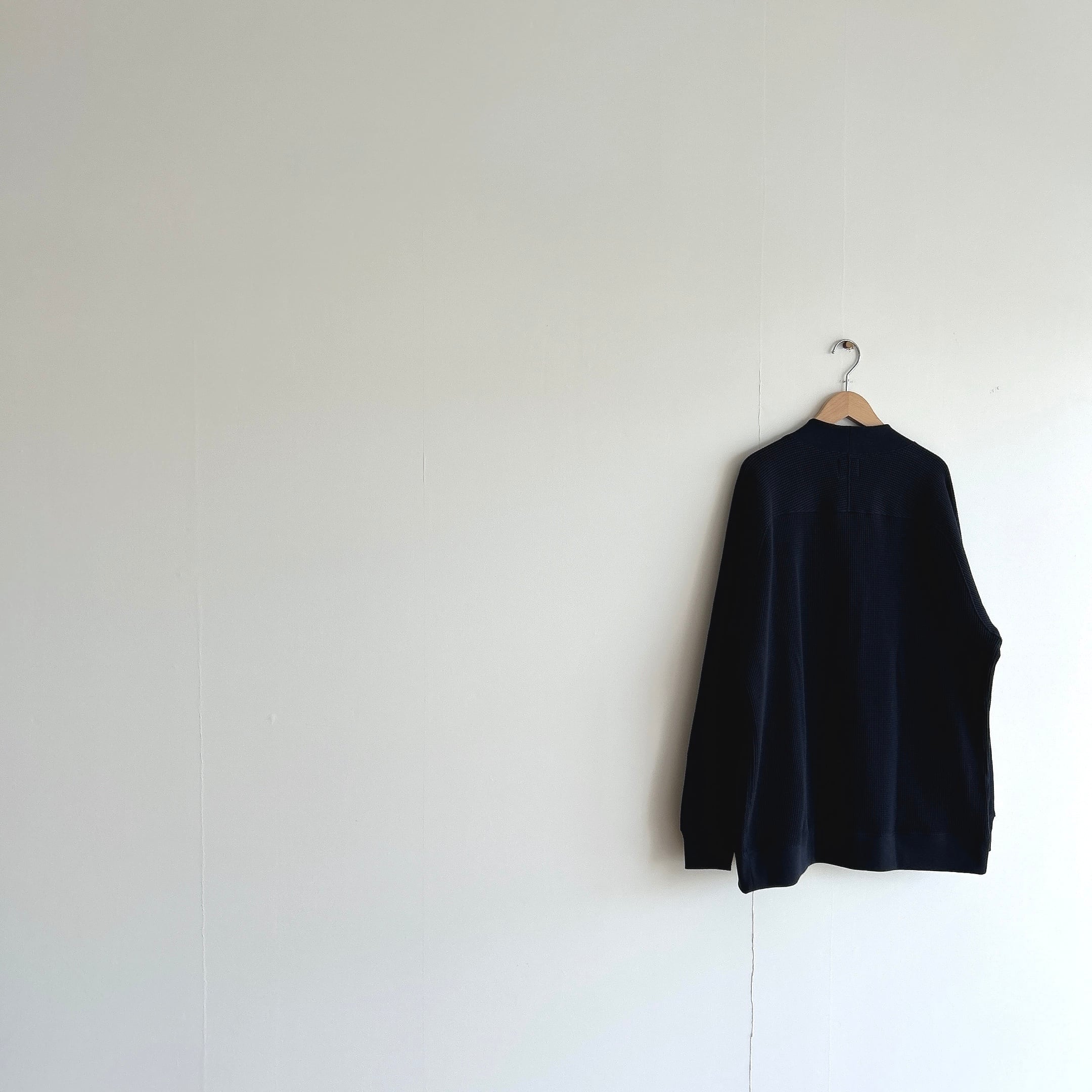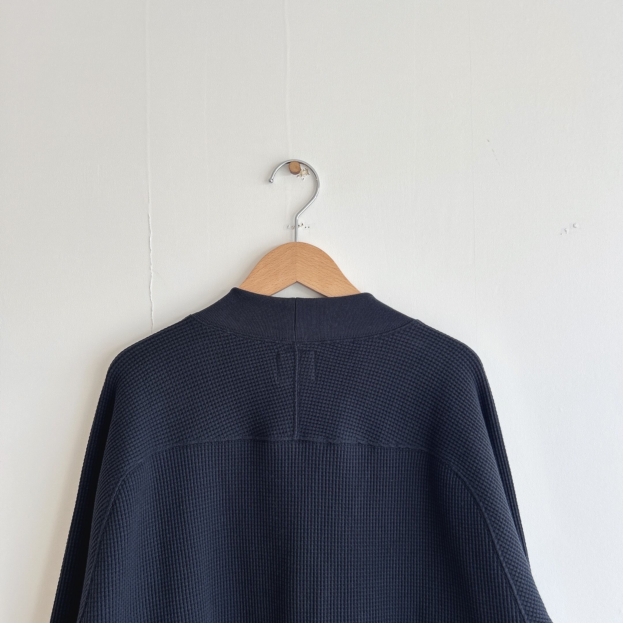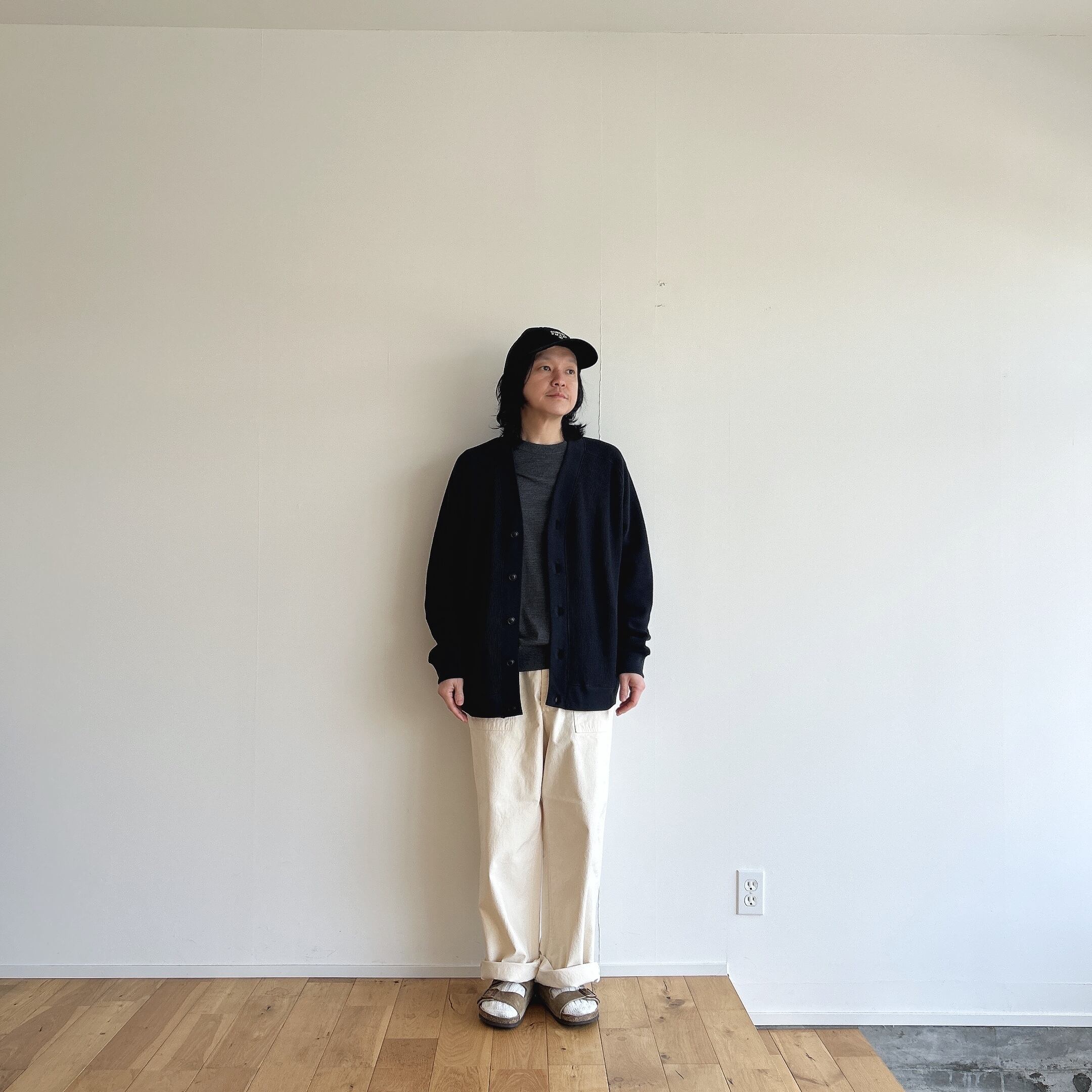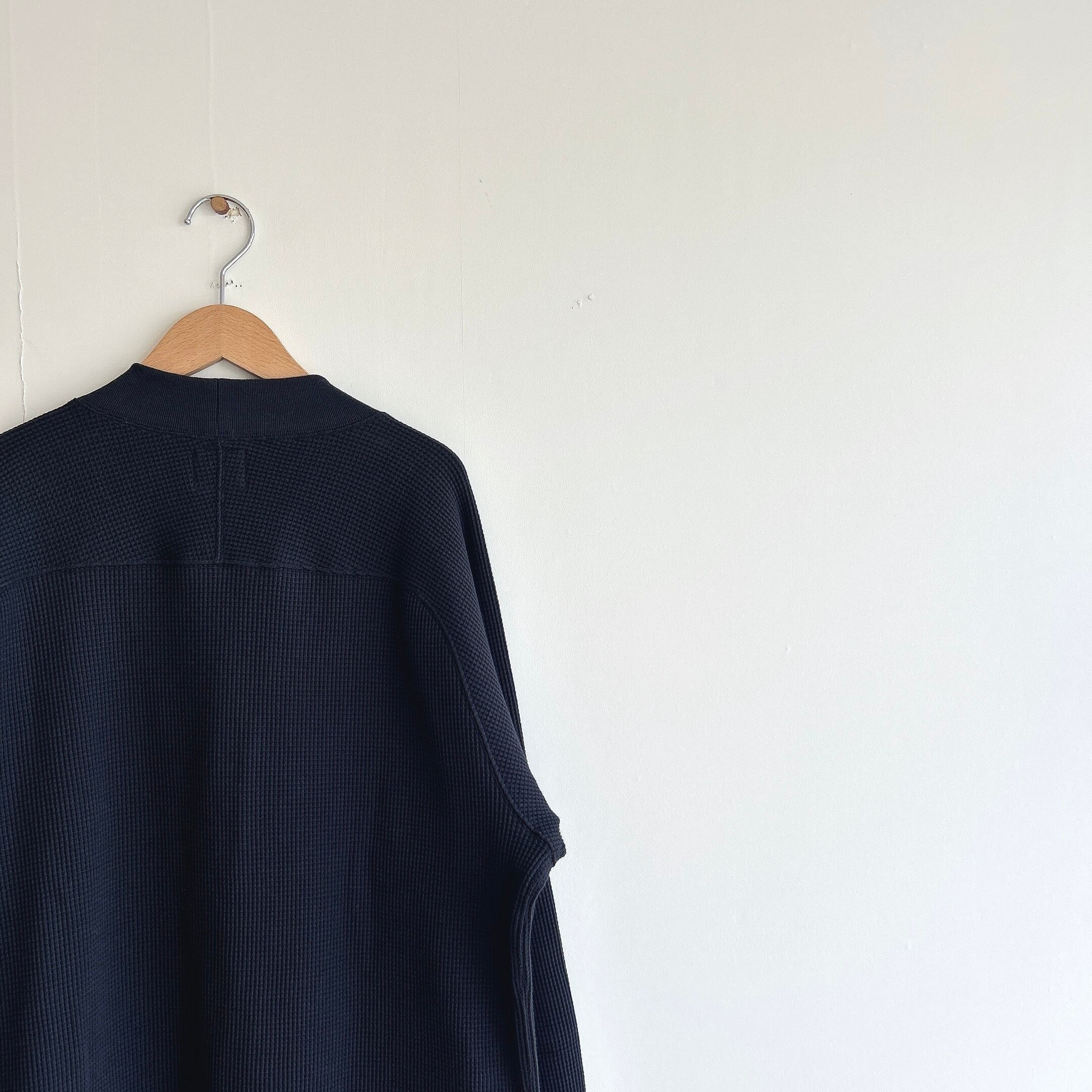 その綿を少し甘めに撚糸した糸を使用し、タイト目なワッフル生地を編みました、その為、触感は柔らかいのに、型崩れしづらく安心感のあるカーディガンの仕上がりに。