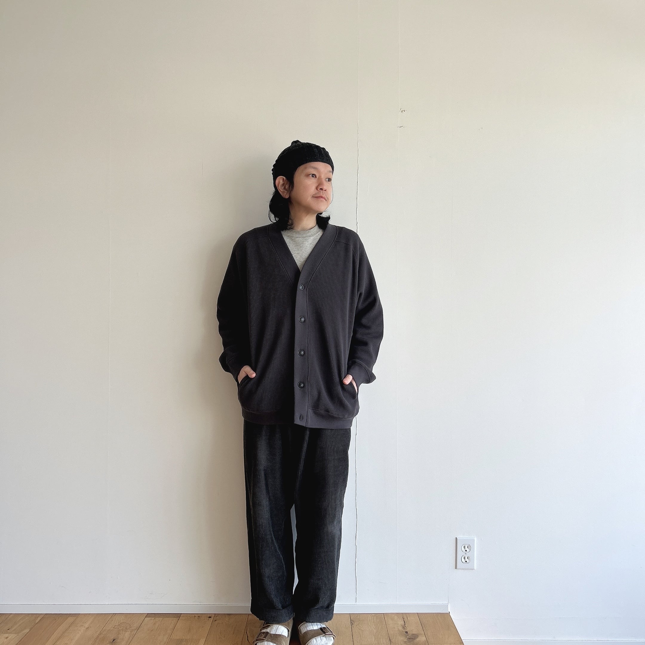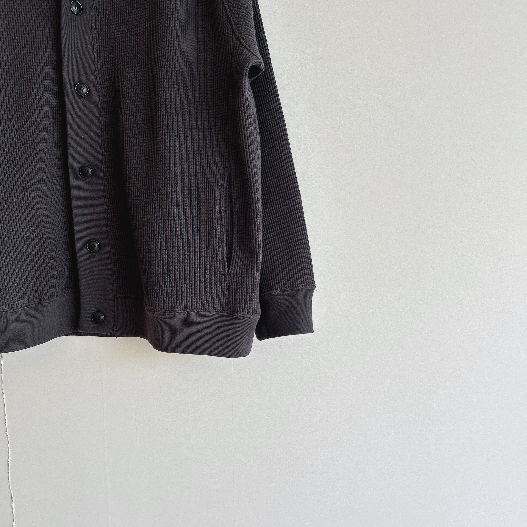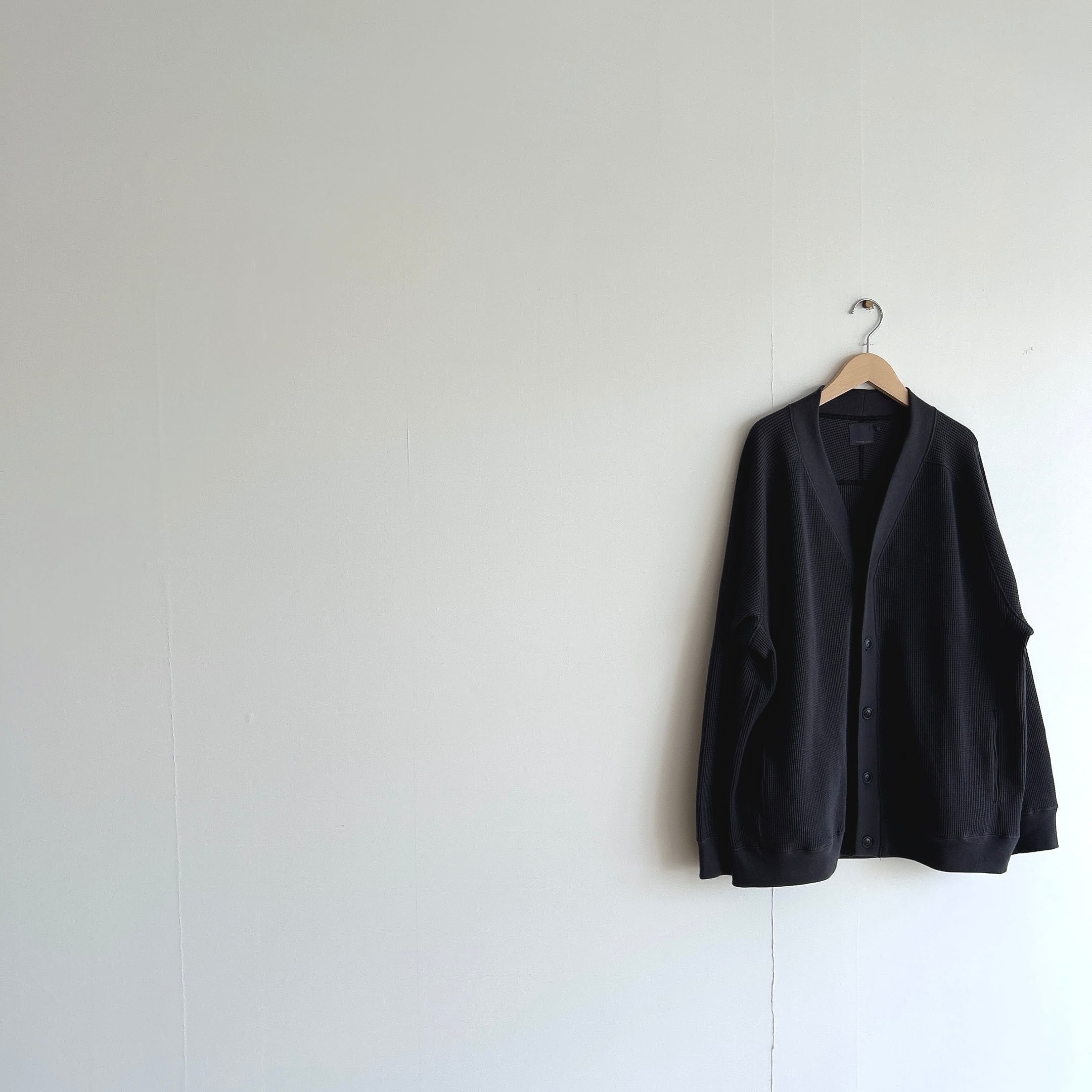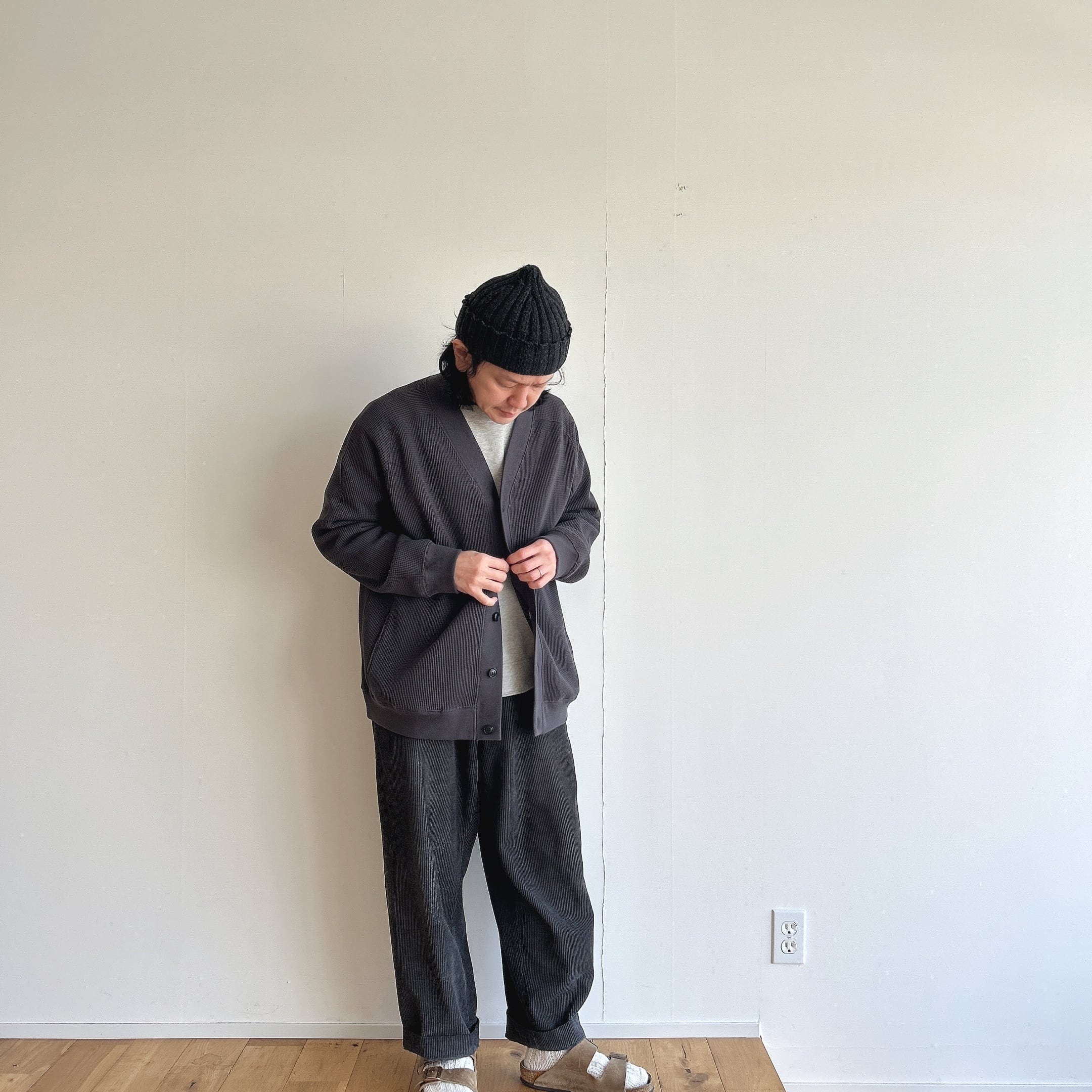 その綿を少し甘めに撚糸した糸を使用し、タイト目なワッフル生地を編みました、その為、触感は柔らかいのに、型崩れしづらく安心感のあるカーディガンの仕上がりに。