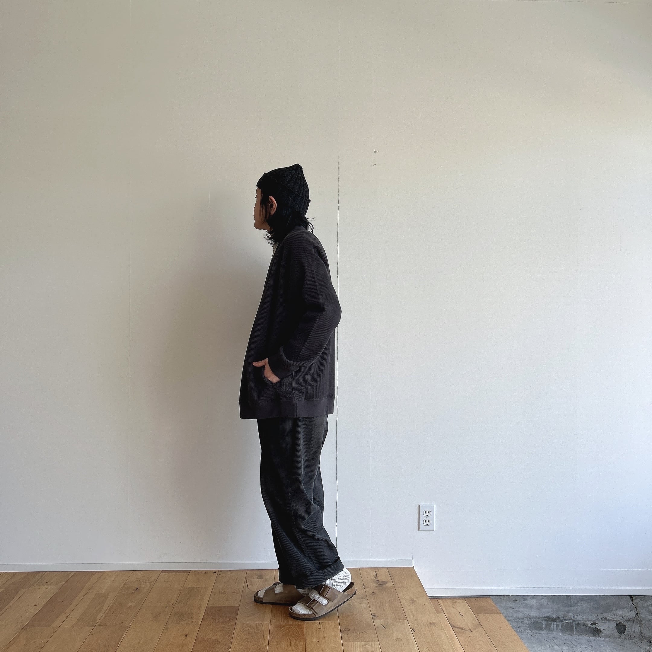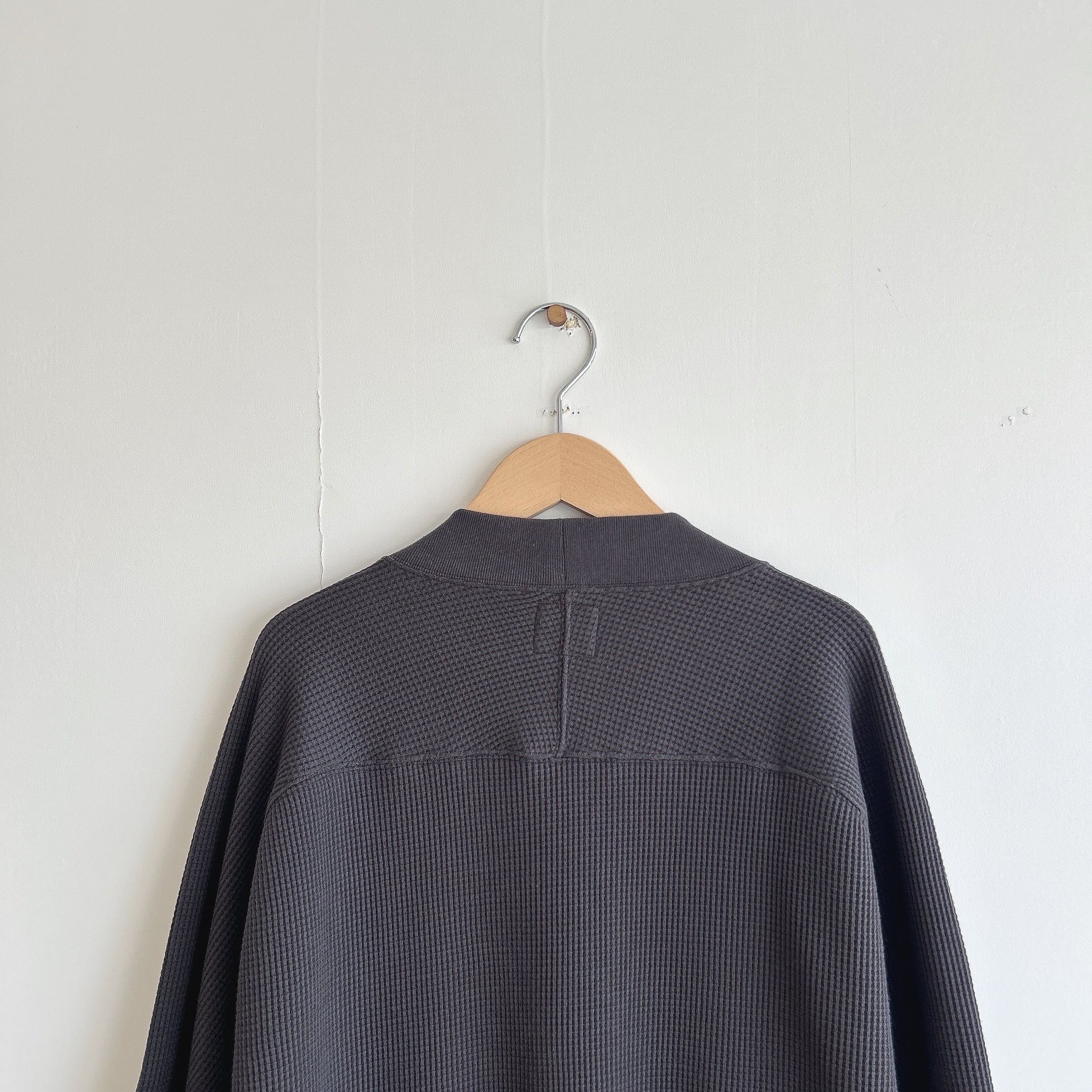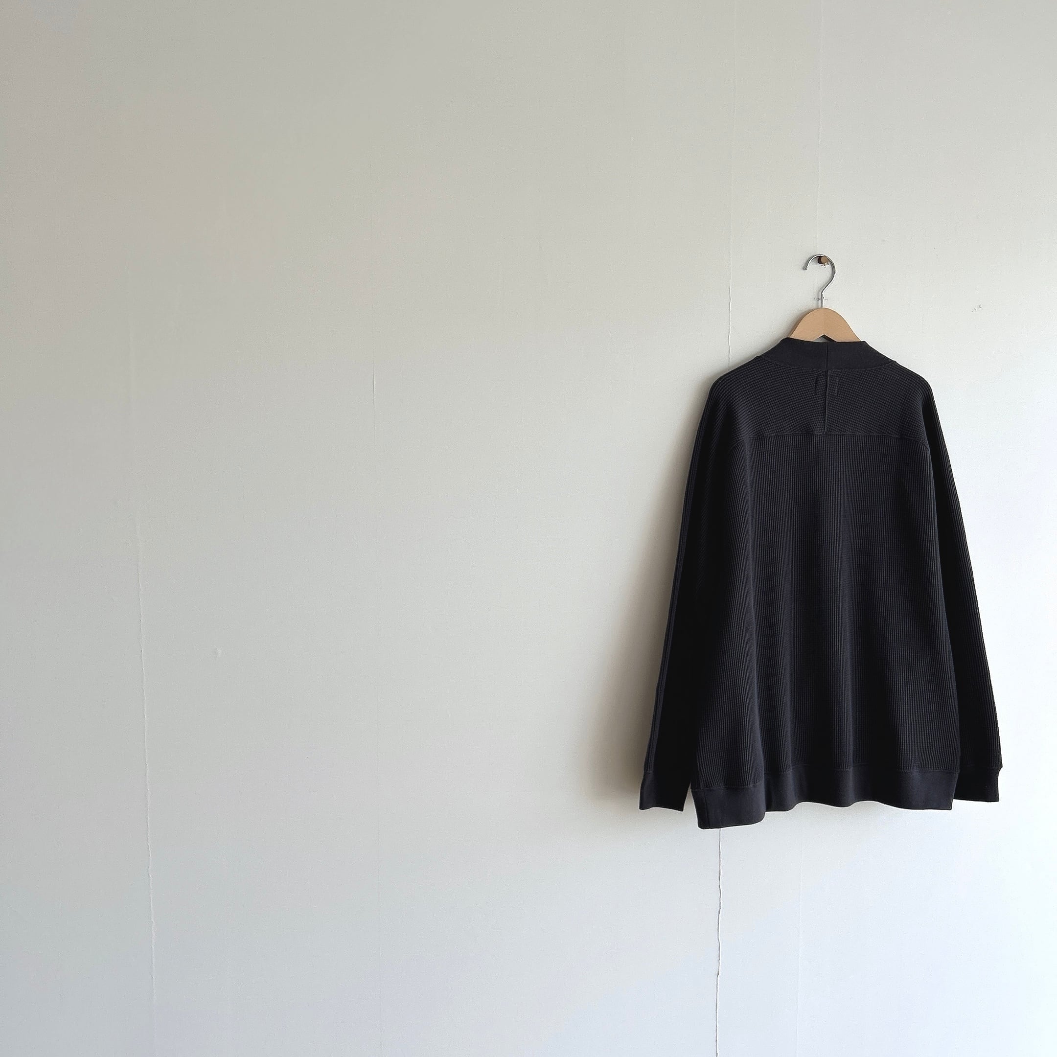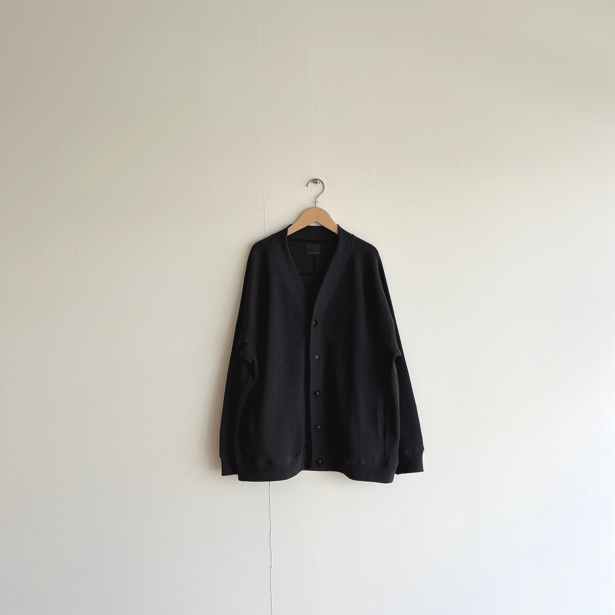 その綿を少し甘めに撚糸した糸を使用し、タイト目なワッフル生地を編みました、その為、触感は柔らかいのに、型崩れしづらく安心感のあるカーディガンの仕上がりに。
