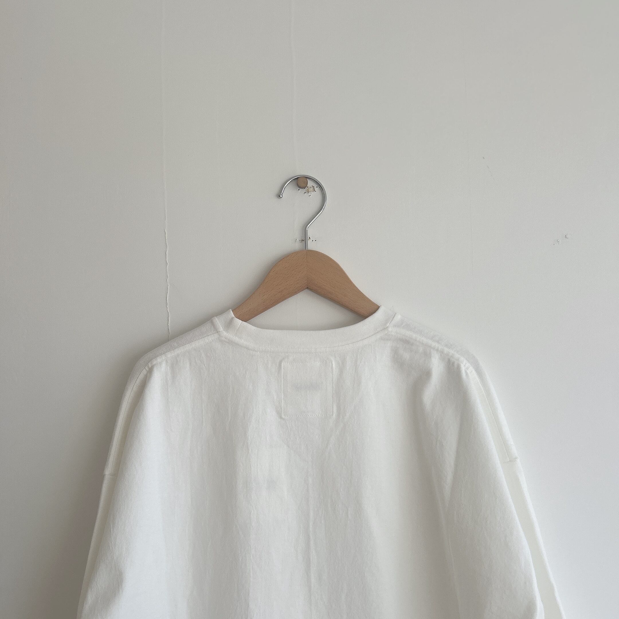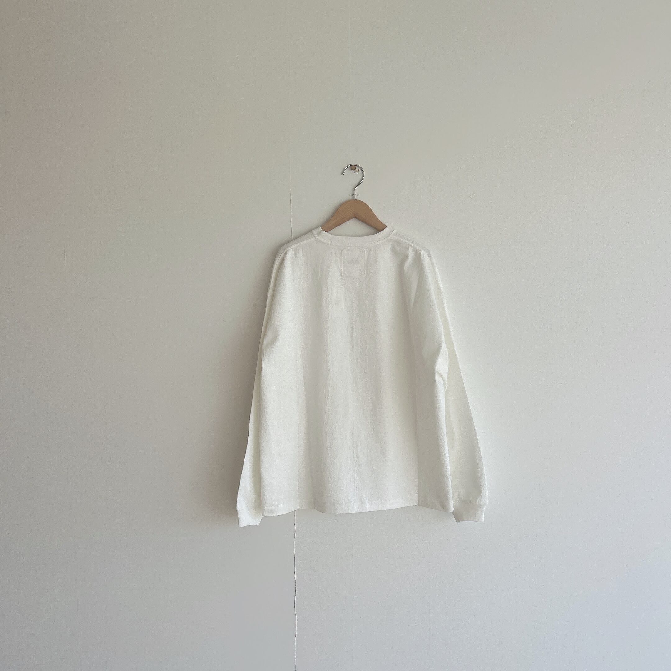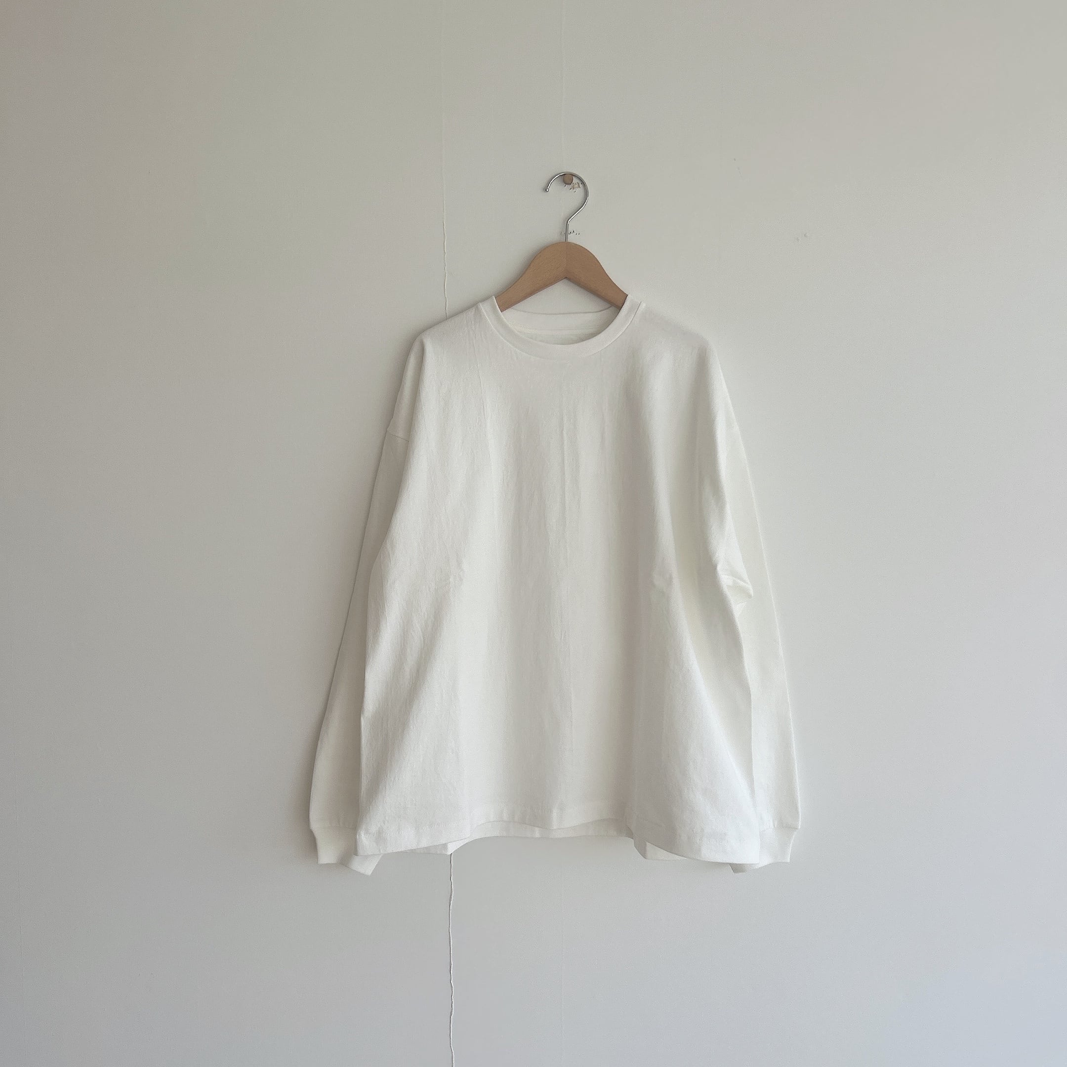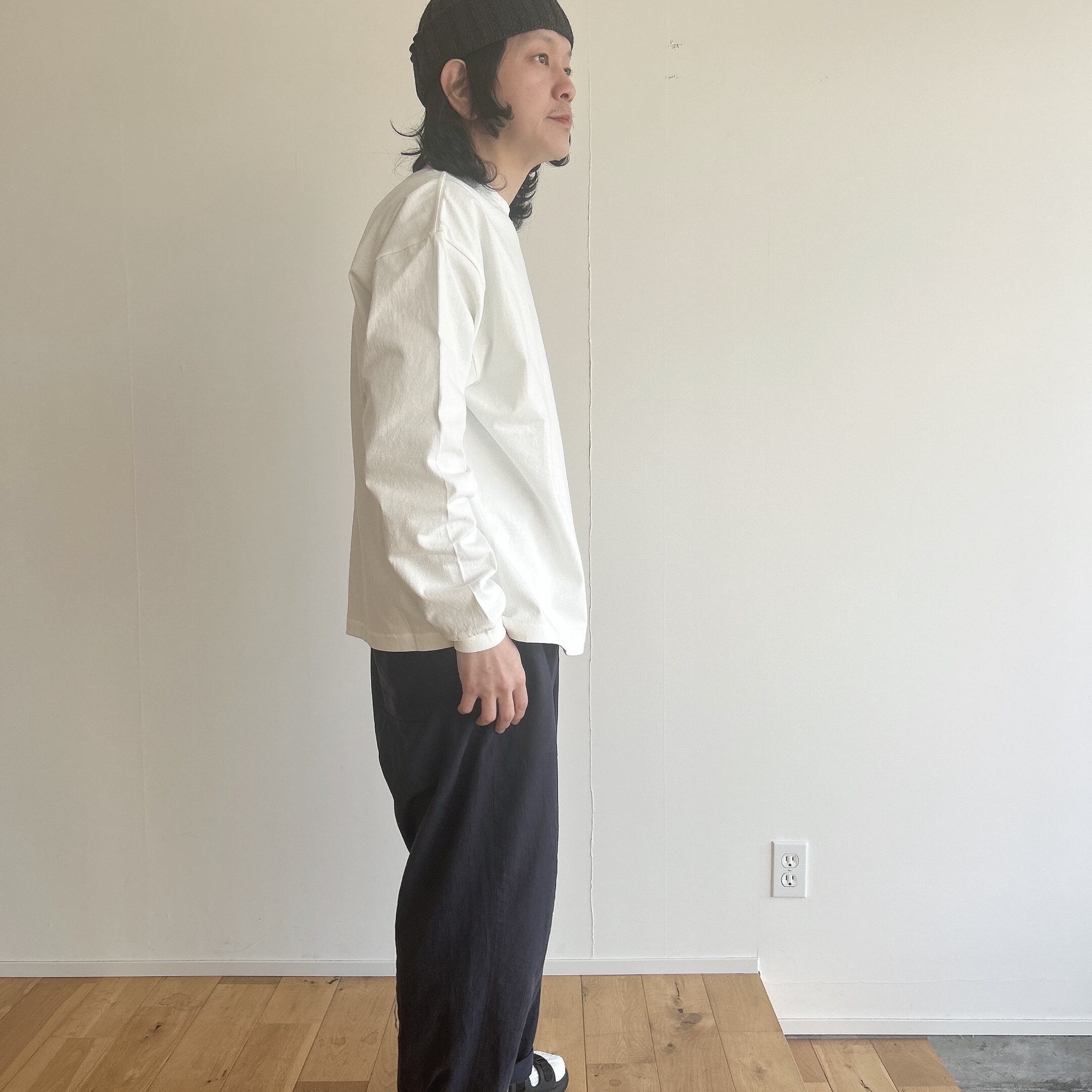 ヘビーウェイトなコットンで、Tシャツとスウェットの間くらいな肉厚感、丸胴仕様によってゆったりとリラックスして着れるようなサイズ感です。