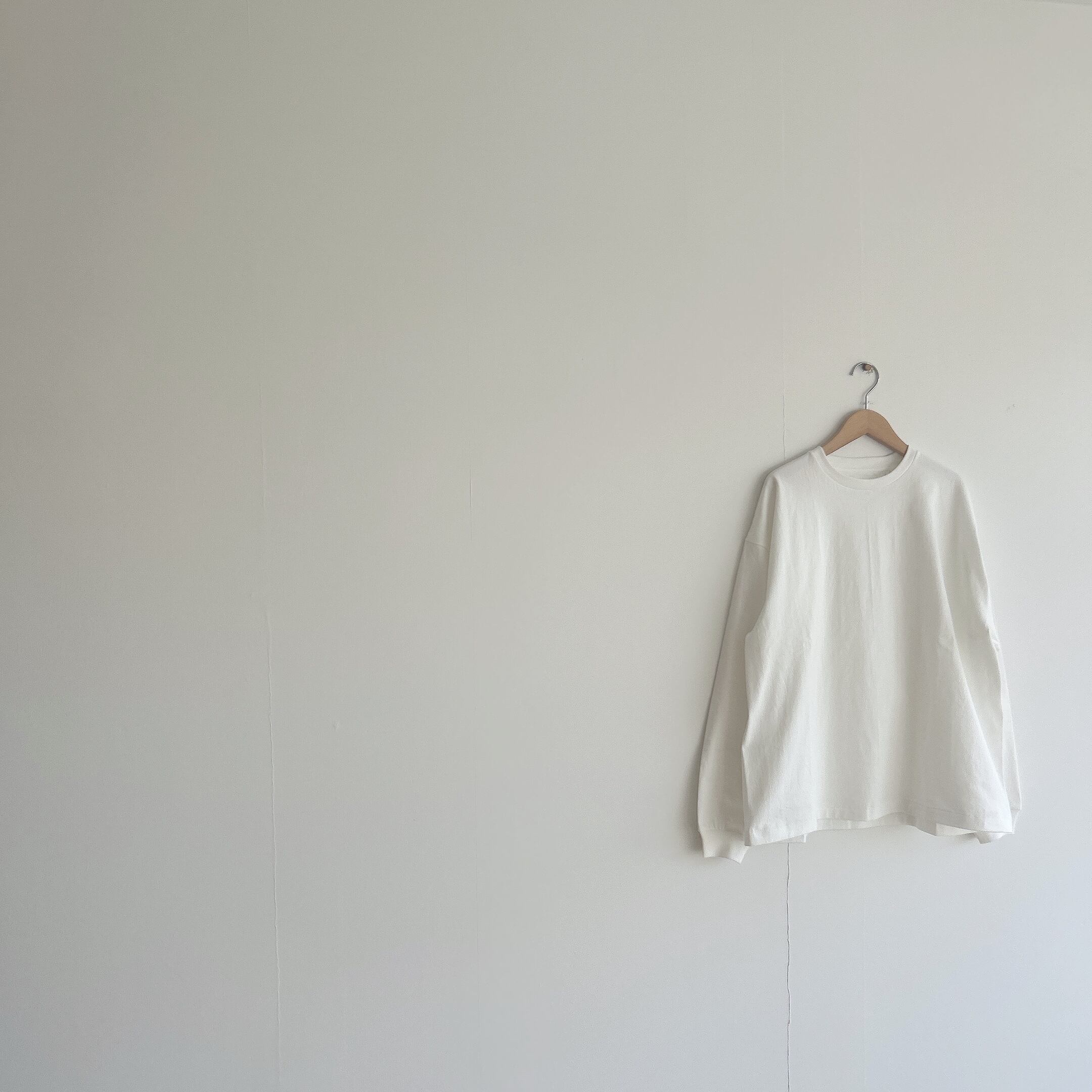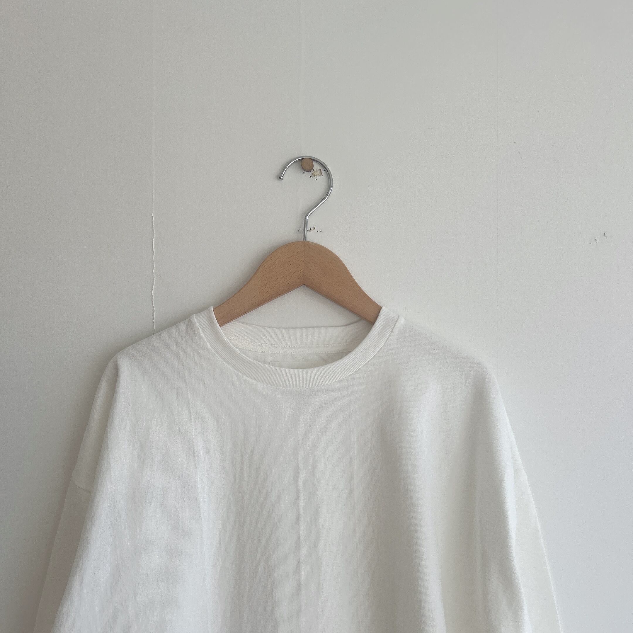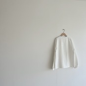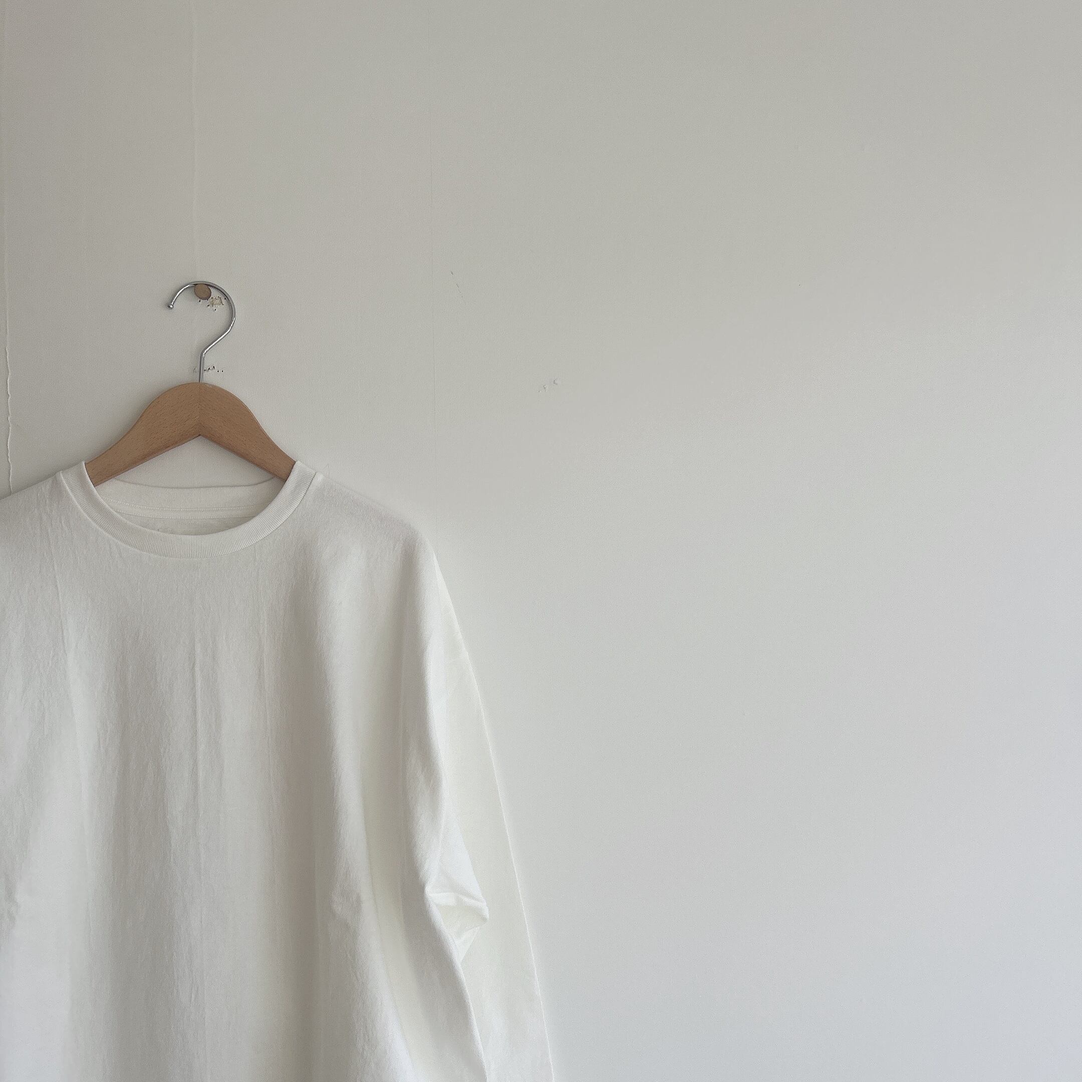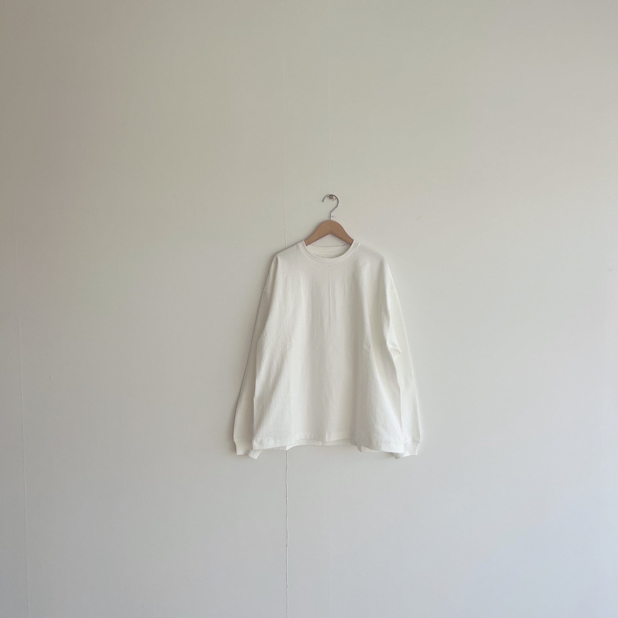 ヘビーウェイトなコットンで、Tシャツとスウェットの間くらいな肉厚感、丸胴仕様によってゆったりとリラックスして着れるようなサイズ感です。