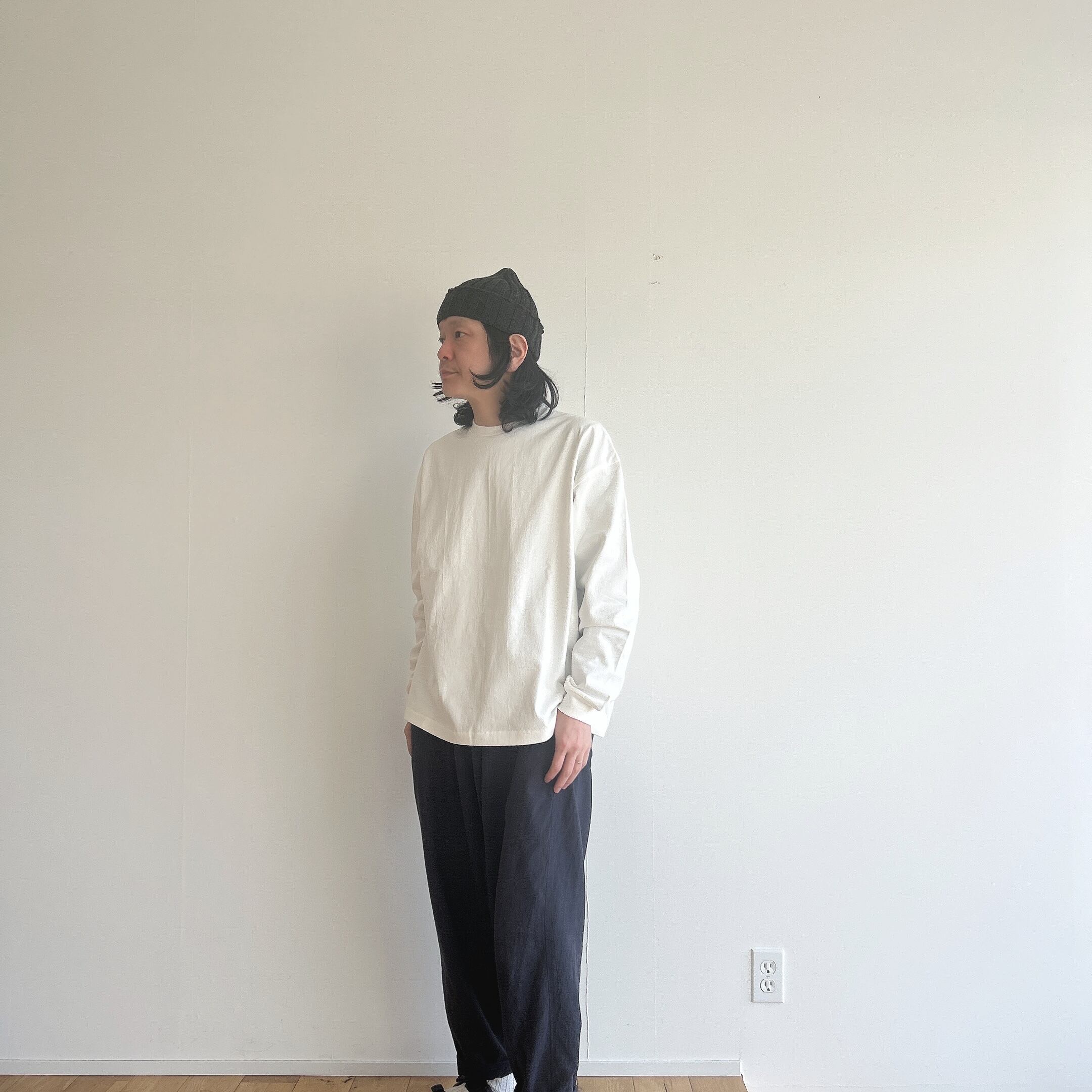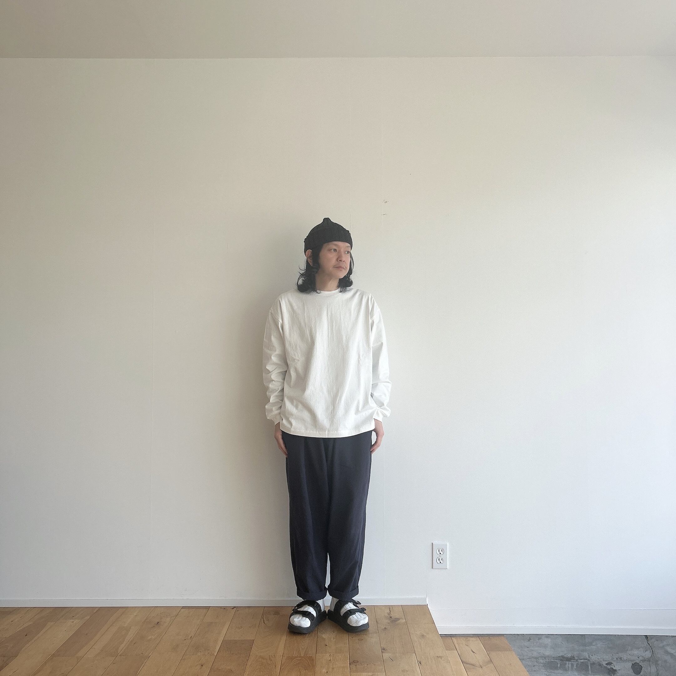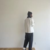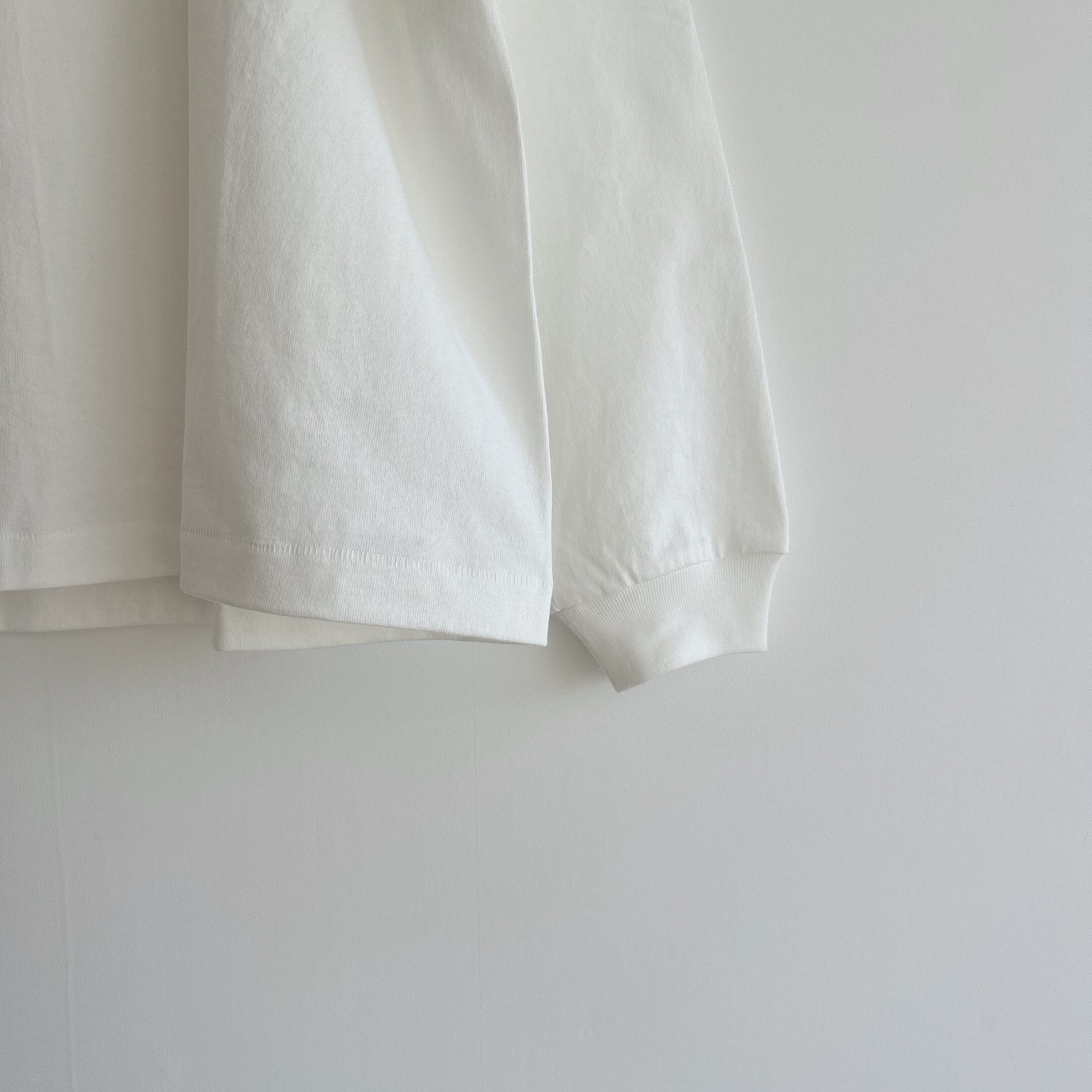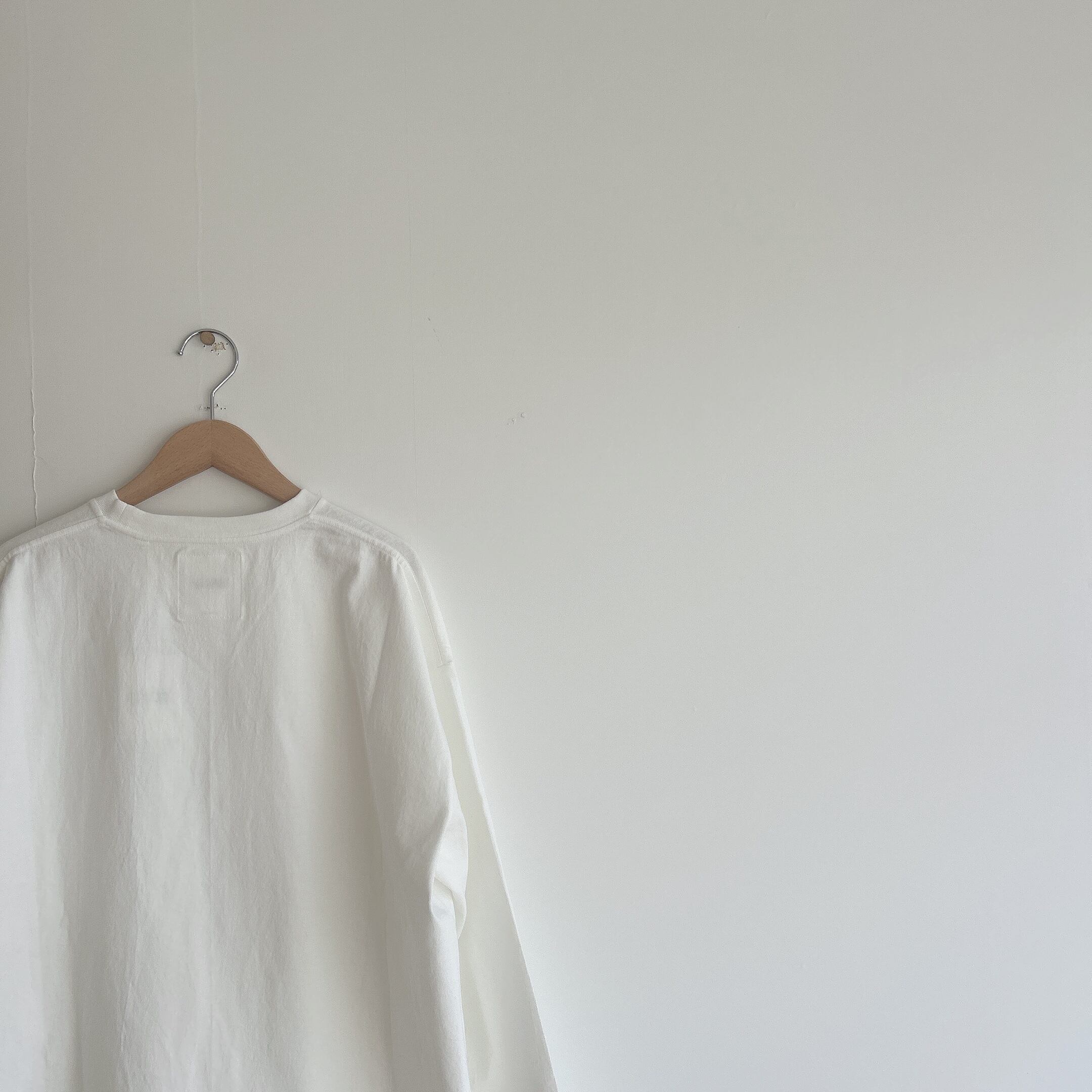 ヘビーウェイトなコットンで、Tシャツとスウェットの間くらいな肉厚感、丸胴仕様によってゆったりとリラックスして着れるようなサイズ感です。