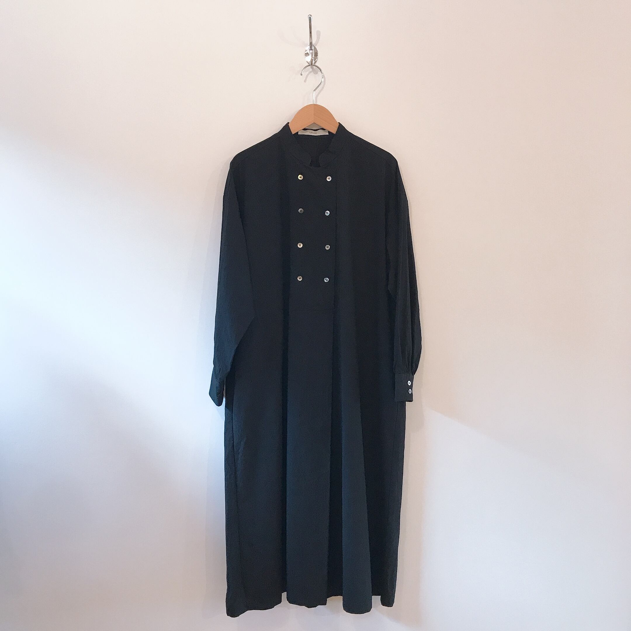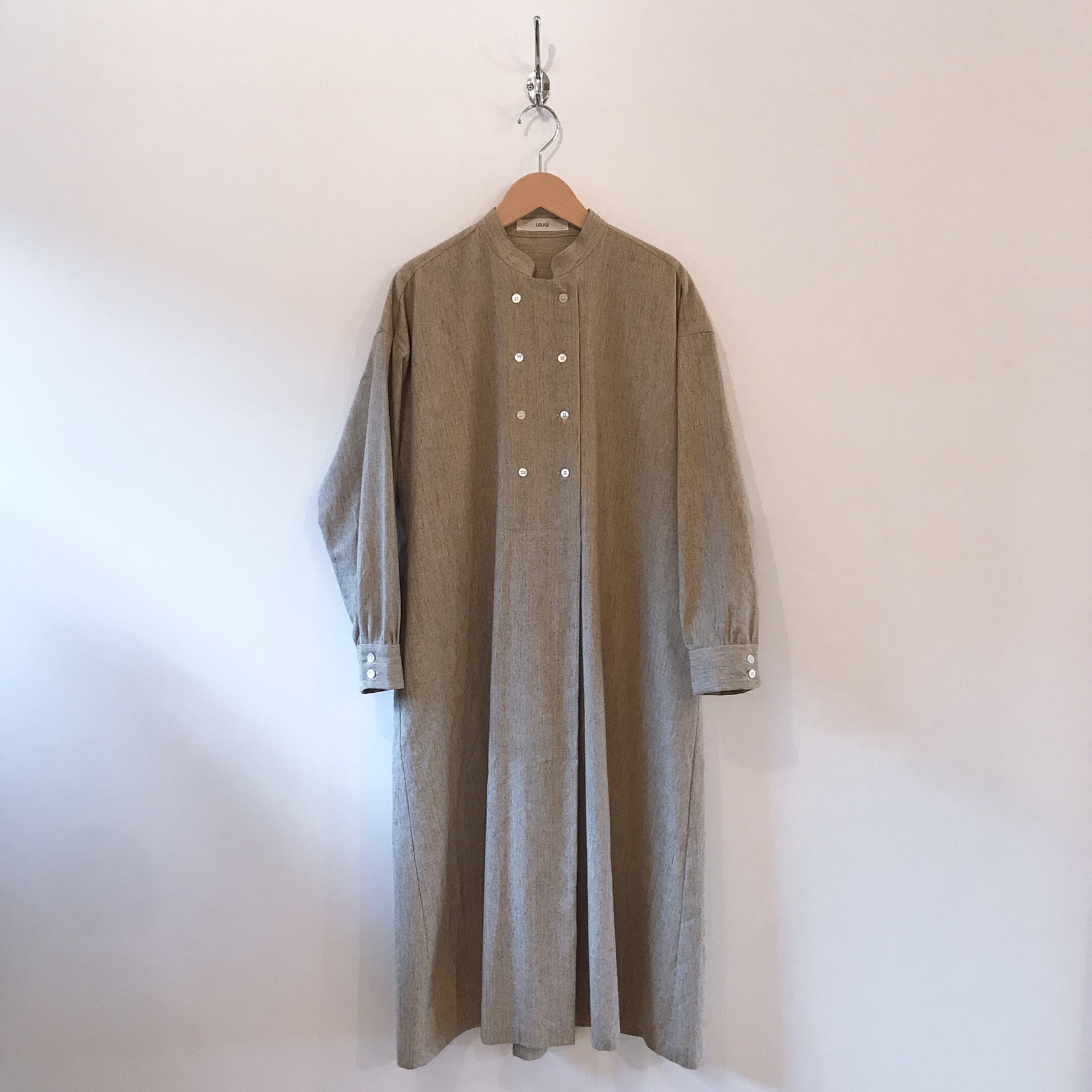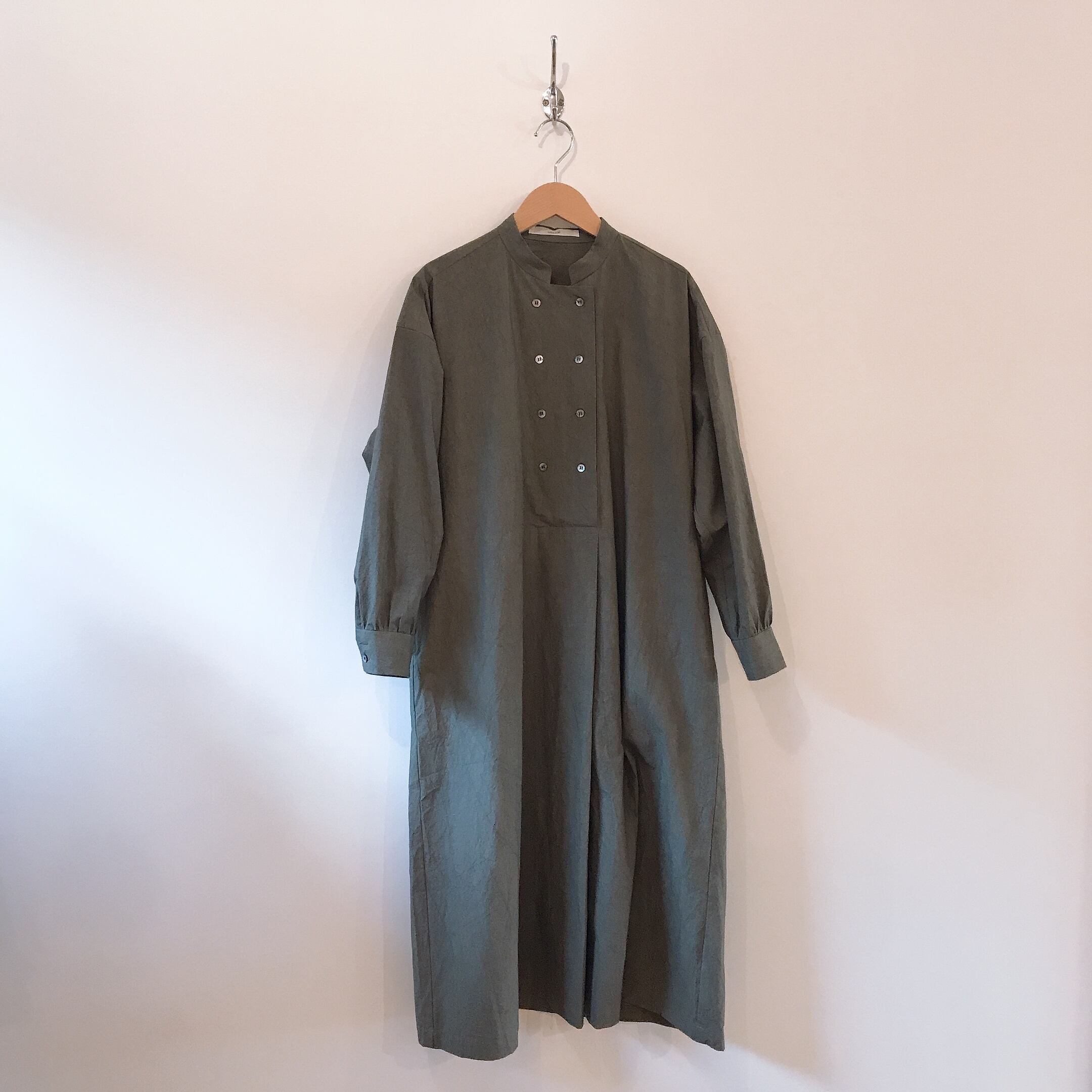 型はダブルボタンのゆったりしたプルオーバータイプのワンピース、少し高めのマオカラーが特徴。透け感はないので1枚だったり、レギンスやタイツと合わせていただいても。