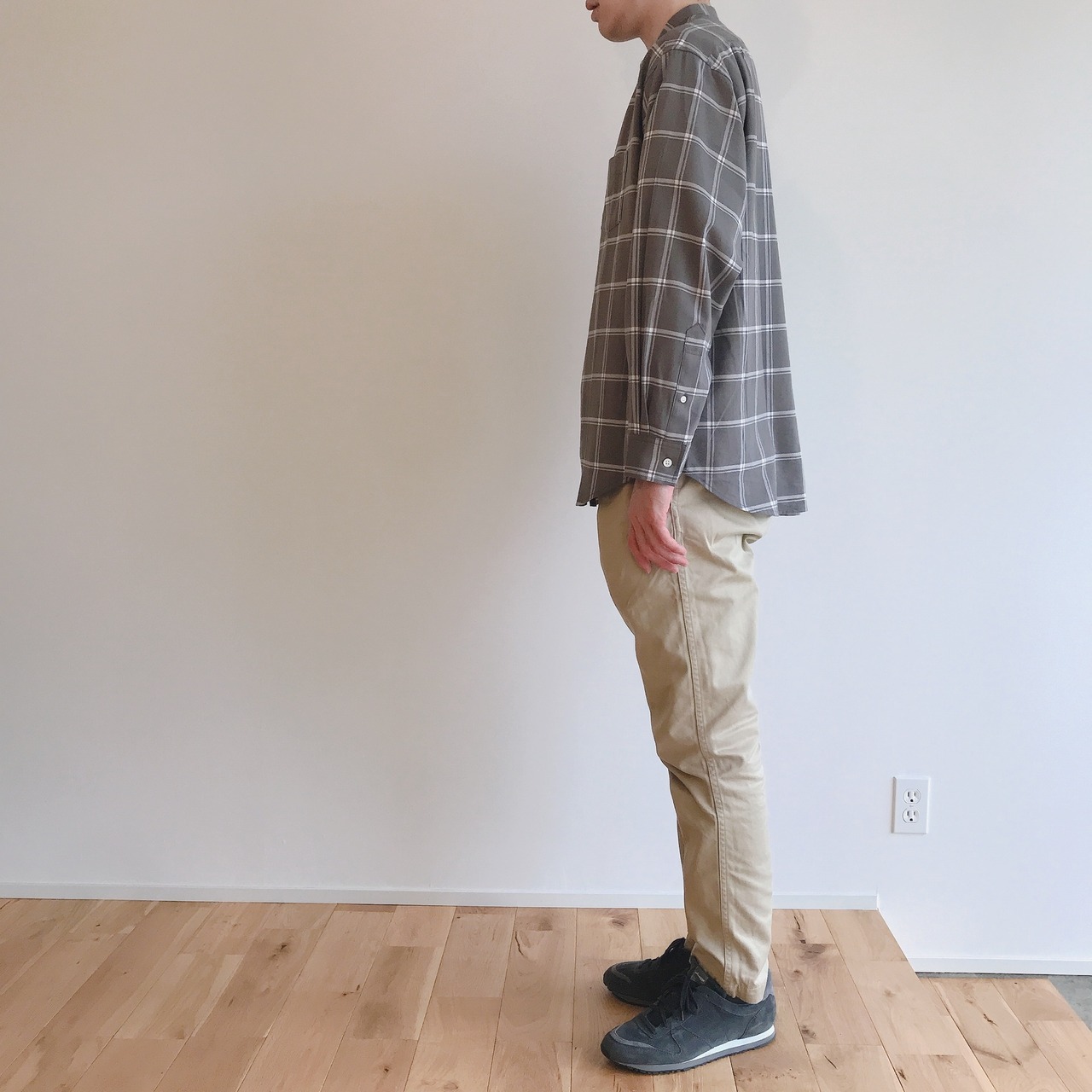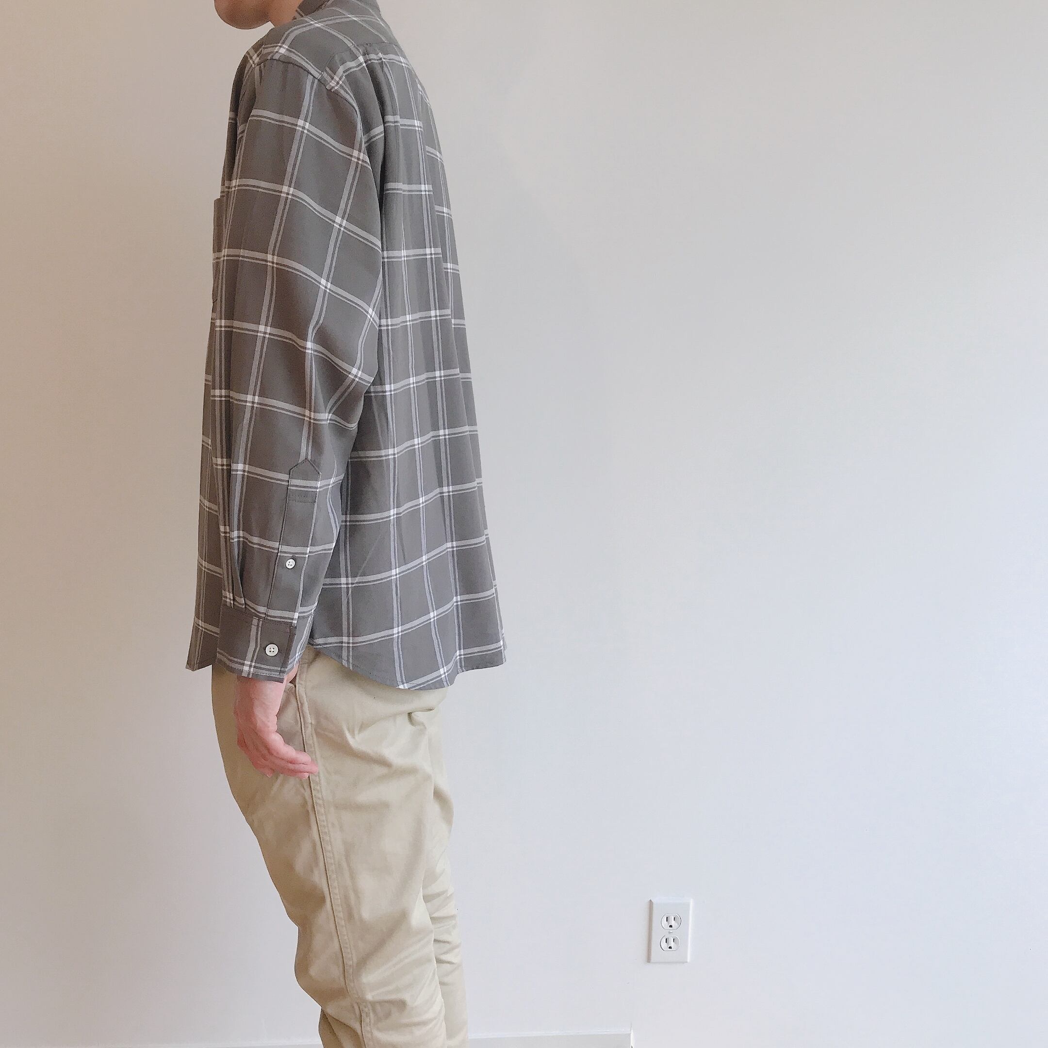 襟はスッキリとしたバンドカラーに落ち着いたグレーチェック柄。