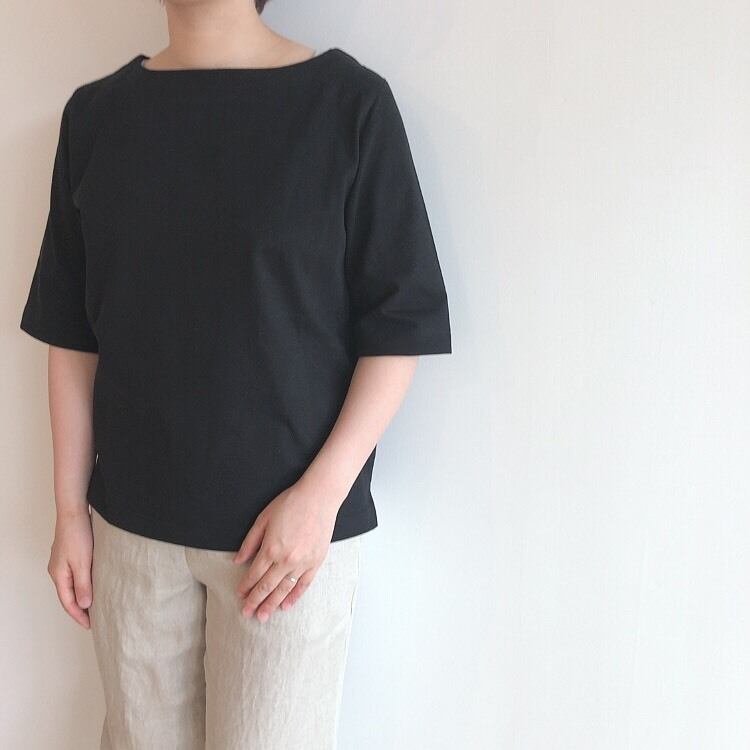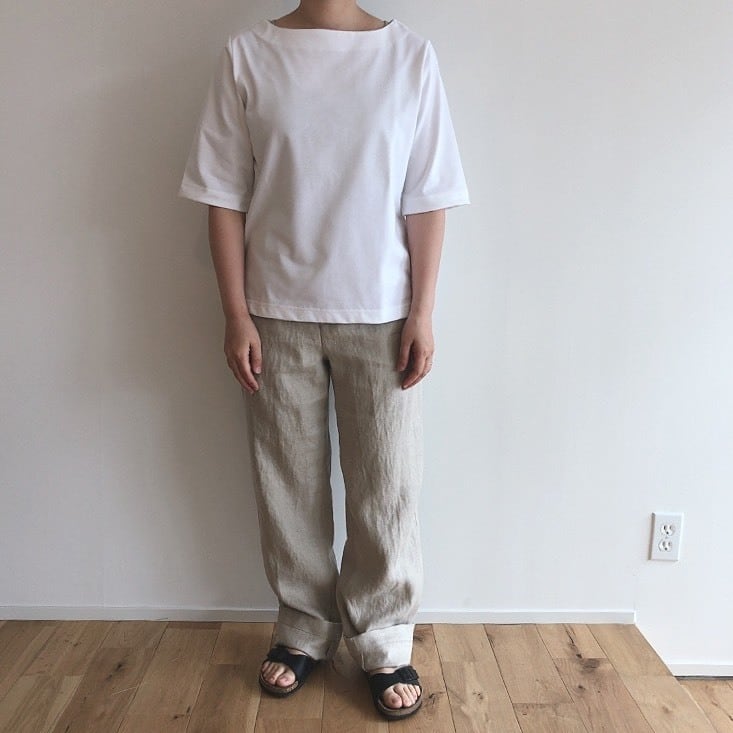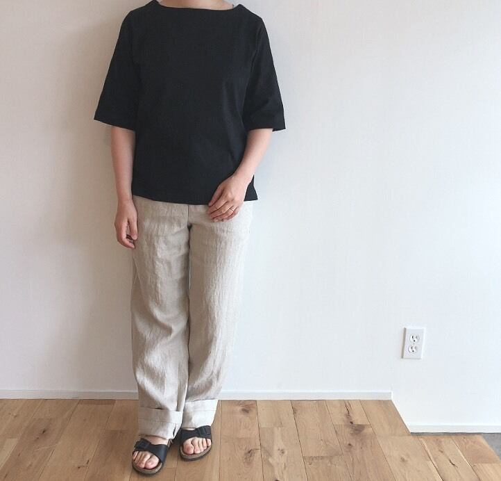 型はシンプルなボートネックですが、そこまでラフではなく、首元の開きが女性らしい雰囲気のあるTシャツですね。