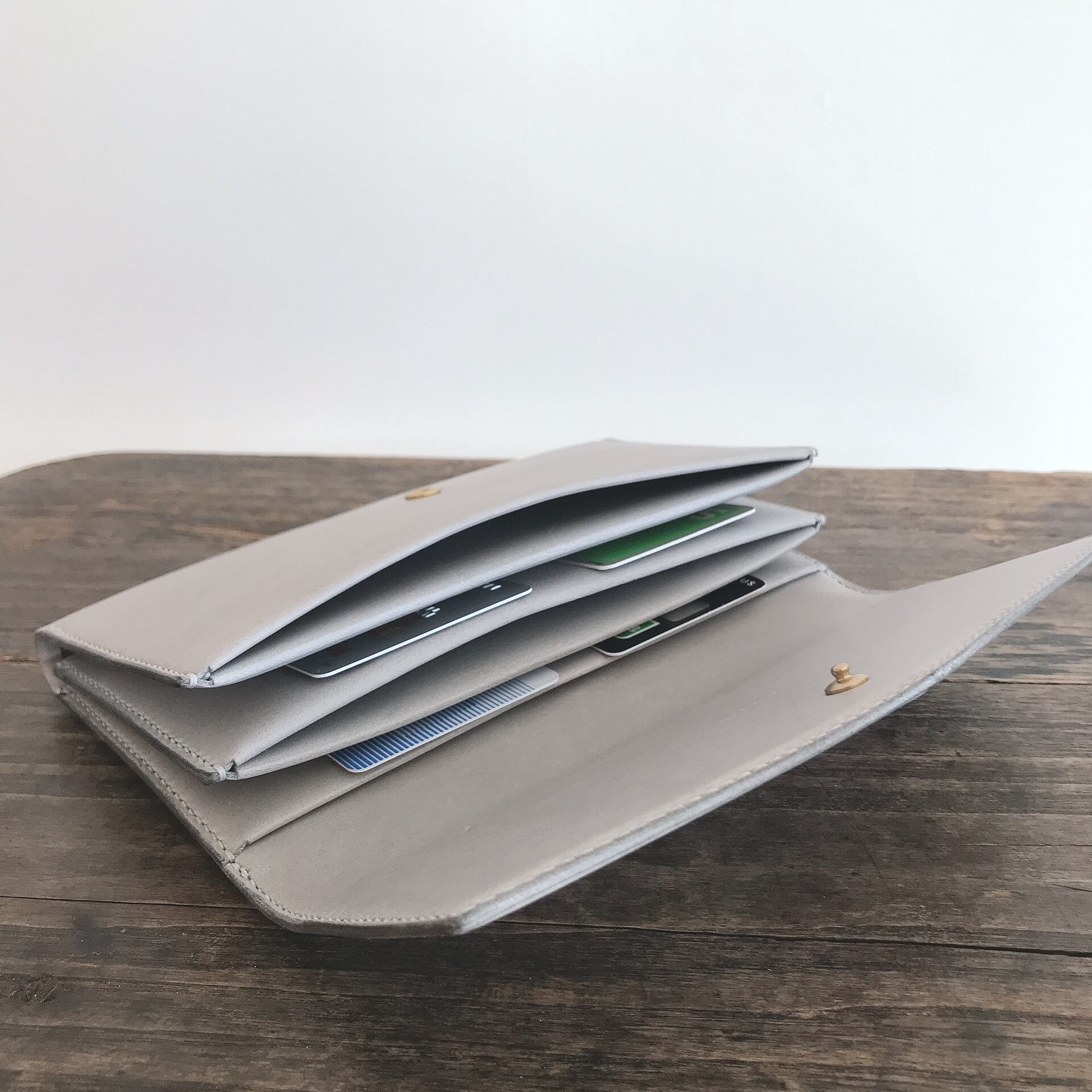 このWALLETは奥から紙幣>カード>コイン>カード>紙幣という順番で収納します。コインをカードで挟むように収納する事で、本体表面にコインの凸凹などが出にくい設計となっています。