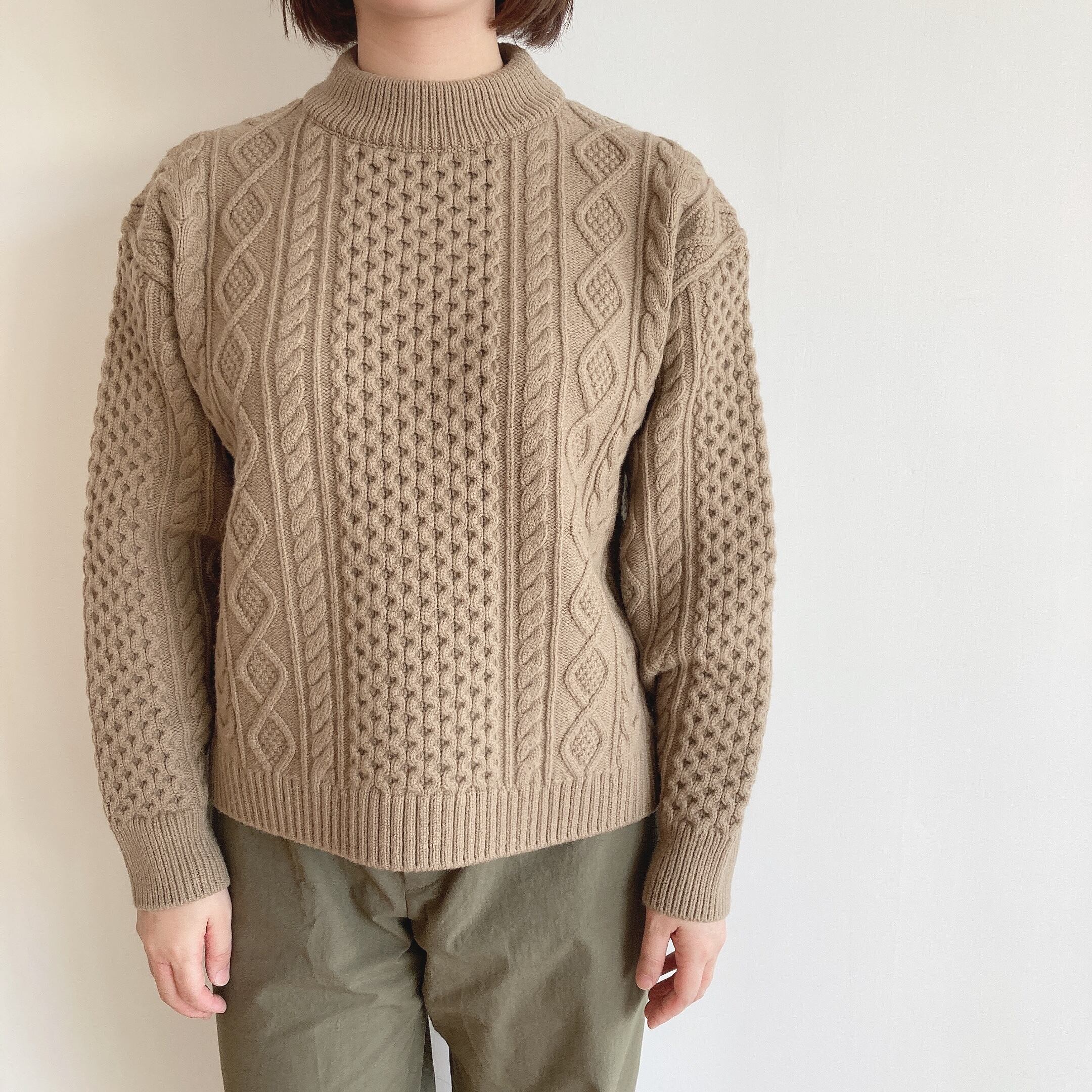 その膨らみを活かし、複雑な縄編みを編む事で凹凸のあるフィッシャーマンニットに。