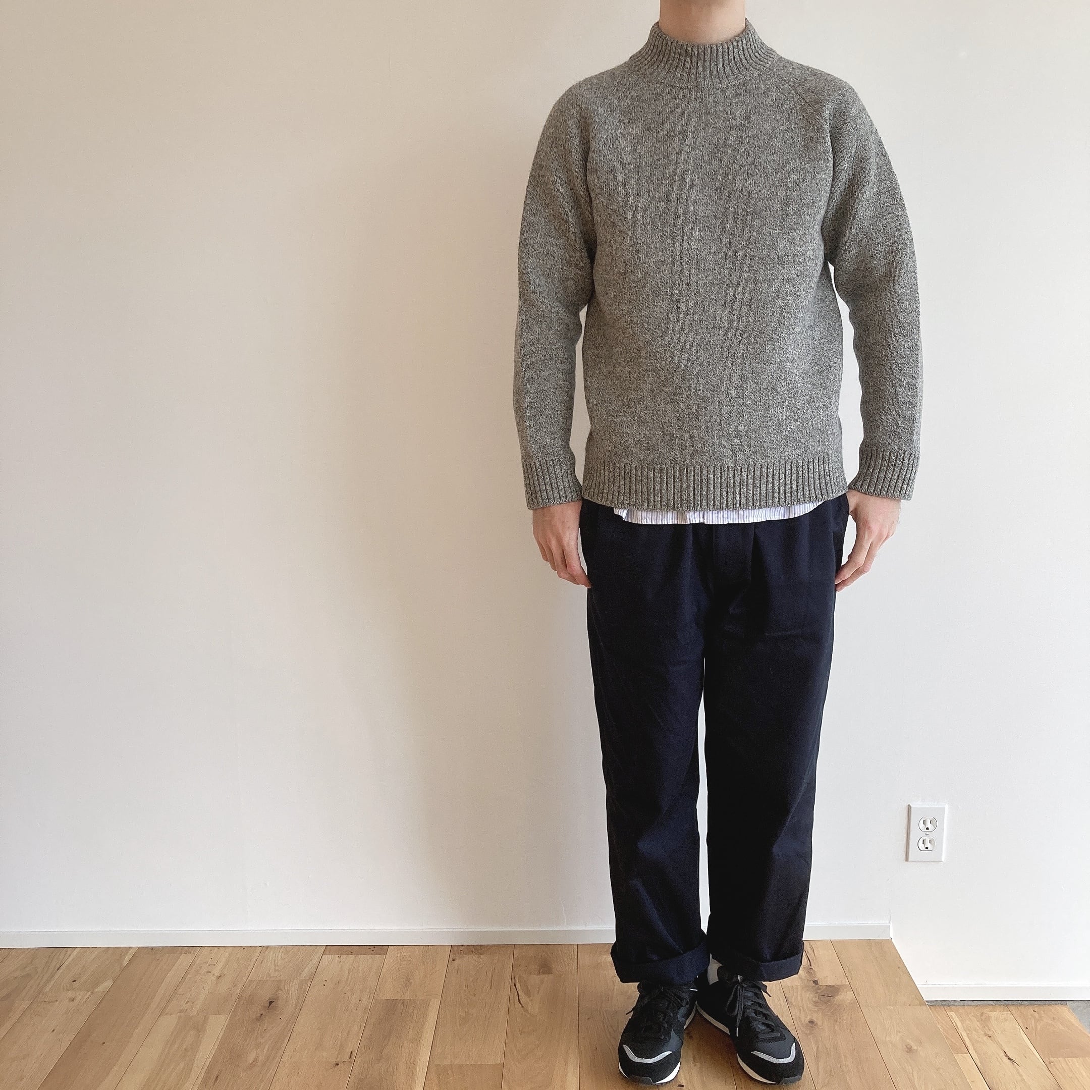 ハイネックとは言ってもそこまでネックが高くないので、首の詰まった印象は避けれるかと思います。