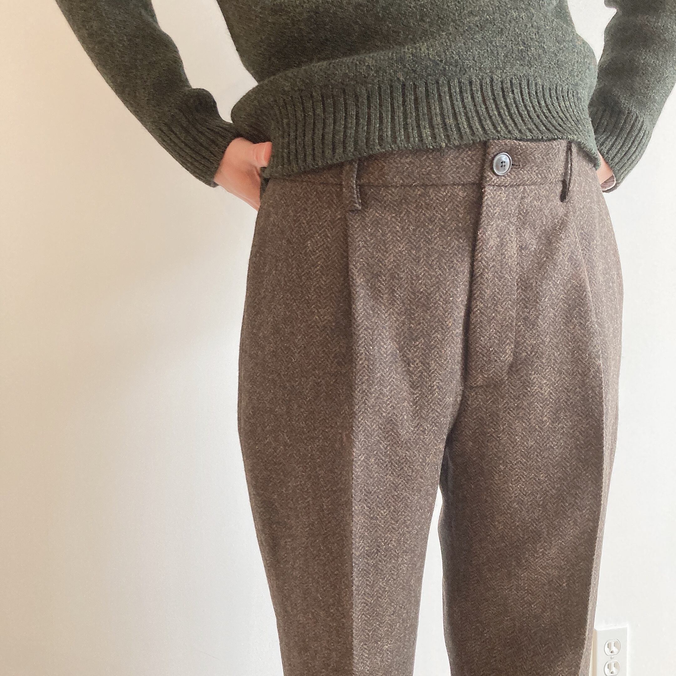 MOONのツイード生地のボトムスって贅沢ですよね。創業以来、羊毛から染色、紡績、織り、仕上げまでを全て自家工場内で一貫して行い、その古き良き物作りの仕事がツイード生地に、深い味わいを添えています。