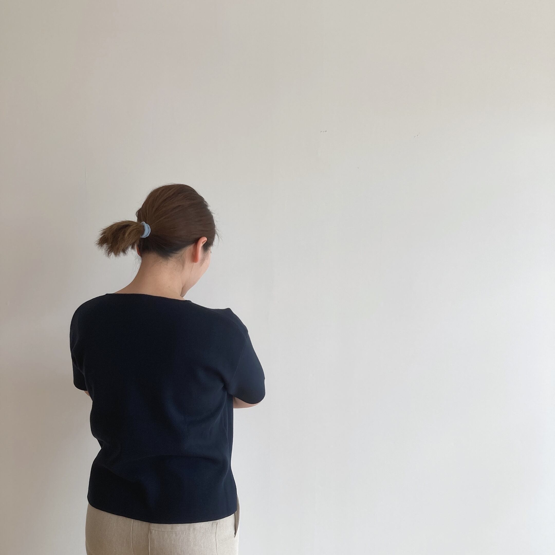 その生地をミラノリブ組織(袋編みとゴム編みを交互に組み合わせた編地)で編み、袖口、裾に一切縫製や付属を付けずにセルヴィッチ(編み端)を使用しました。そのため、スッキリとした落ち着いた雰囲気のある見え方に仕上がっています。