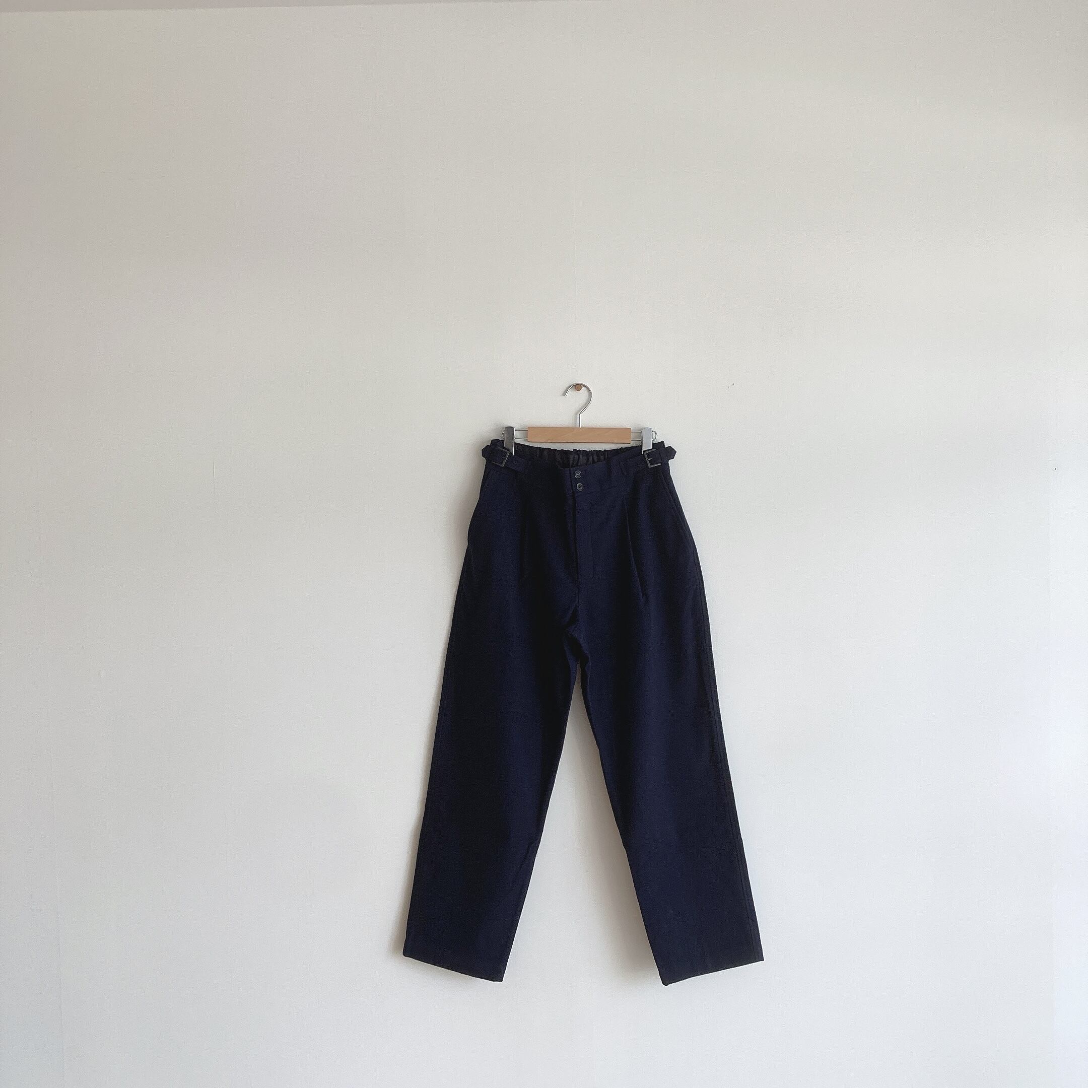 ヒップ、太ももはゆったりとしていて、裾に向かって少し絞りのあるシルエットです。