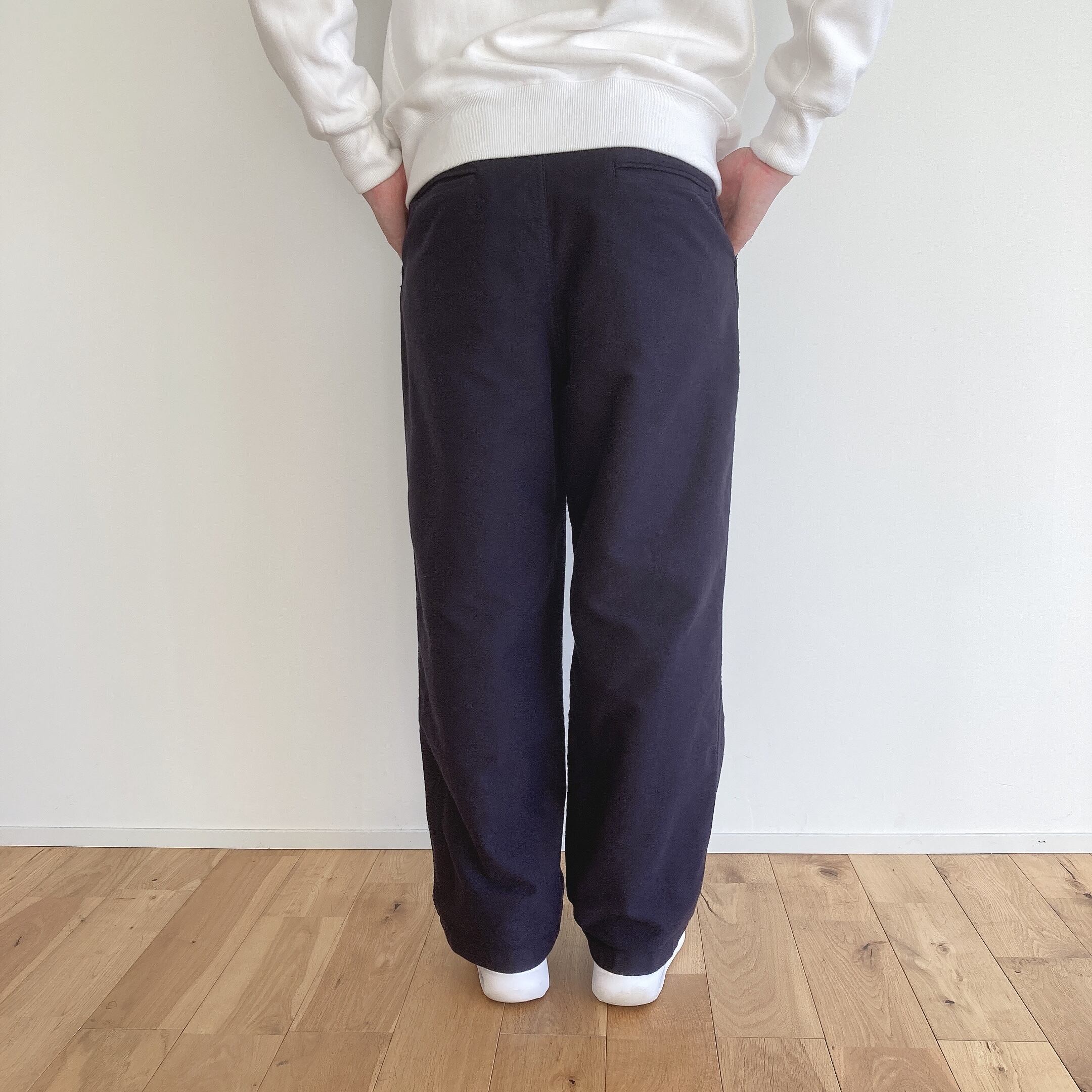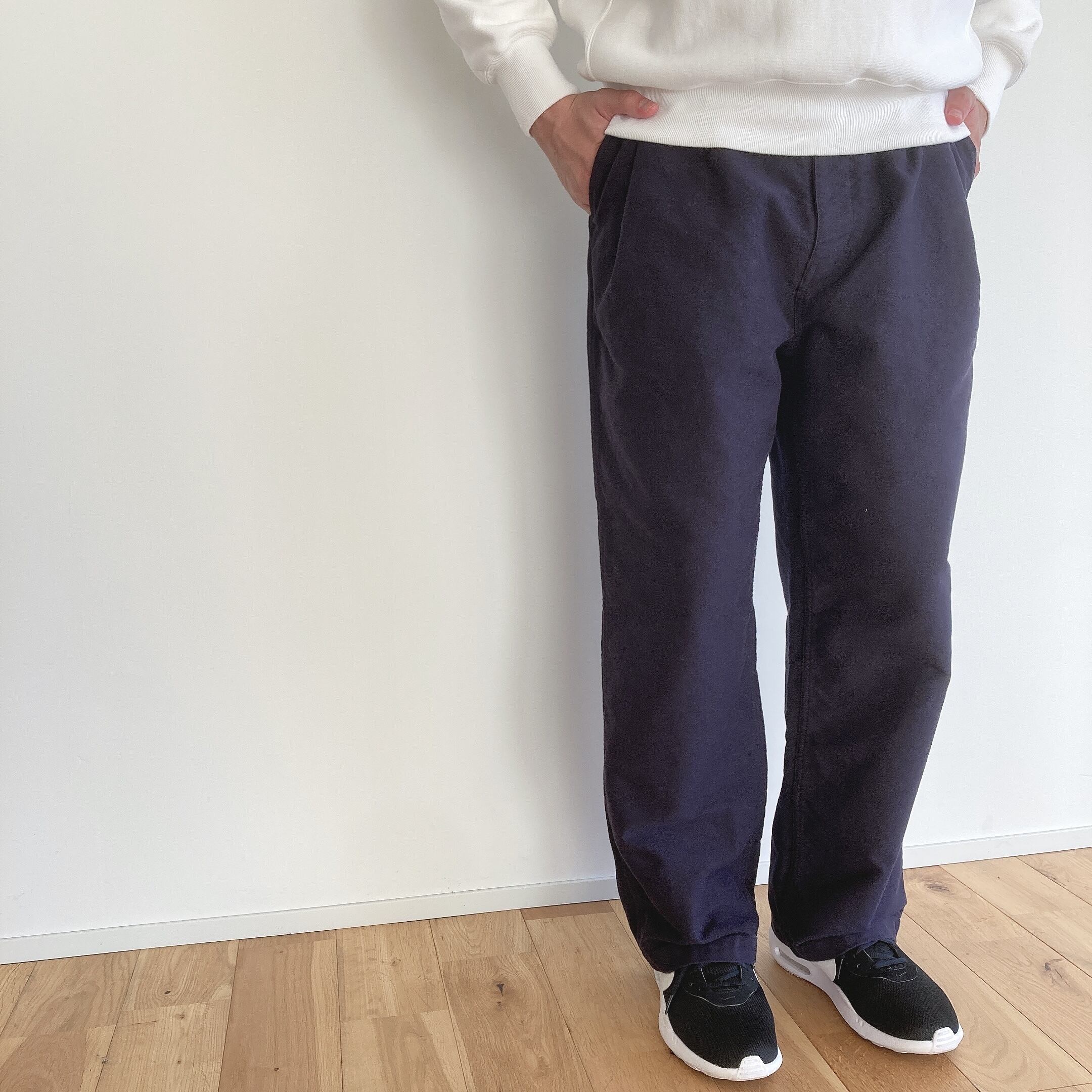 シルエットは2プリーツの股上は深め、ヒップ渡りは太めで、ひざ下から緩やかにテーパードを。