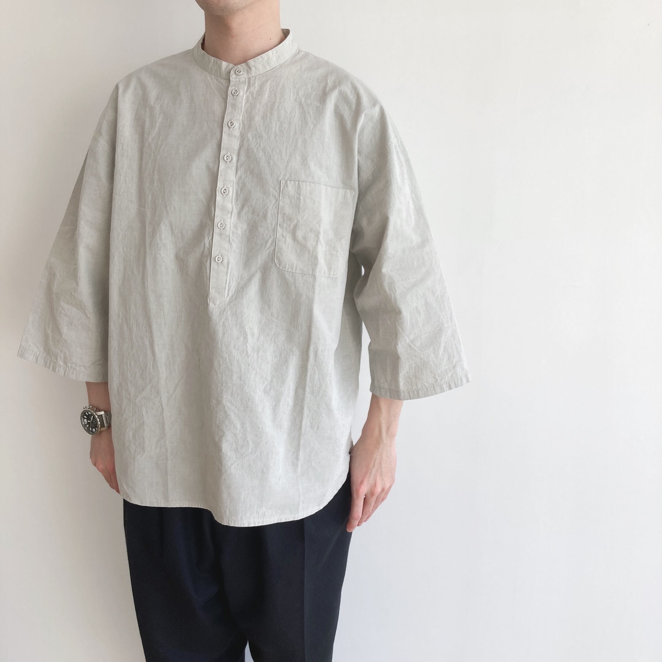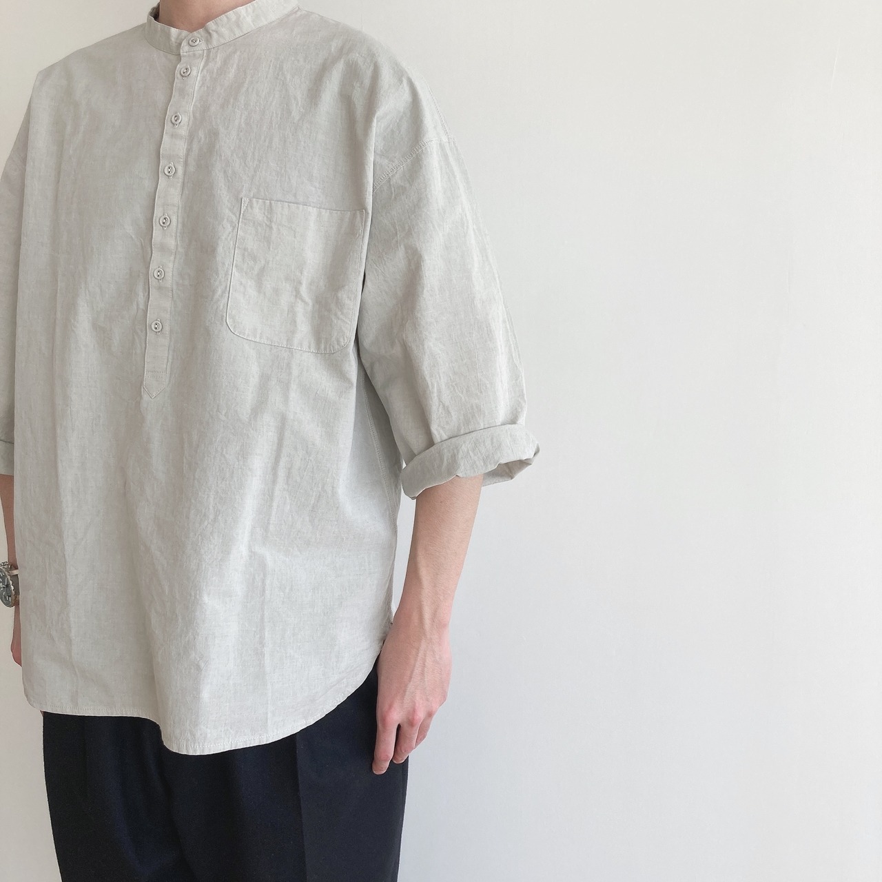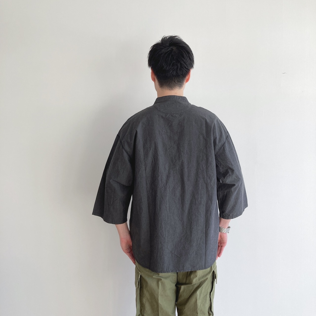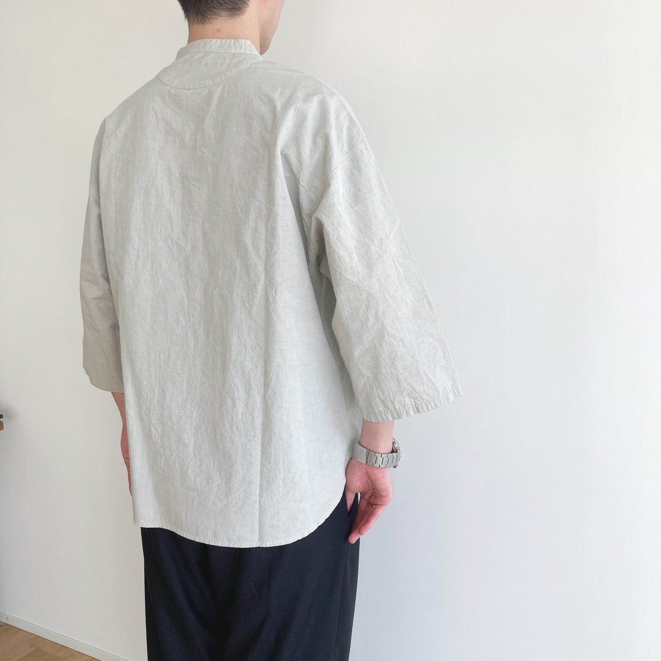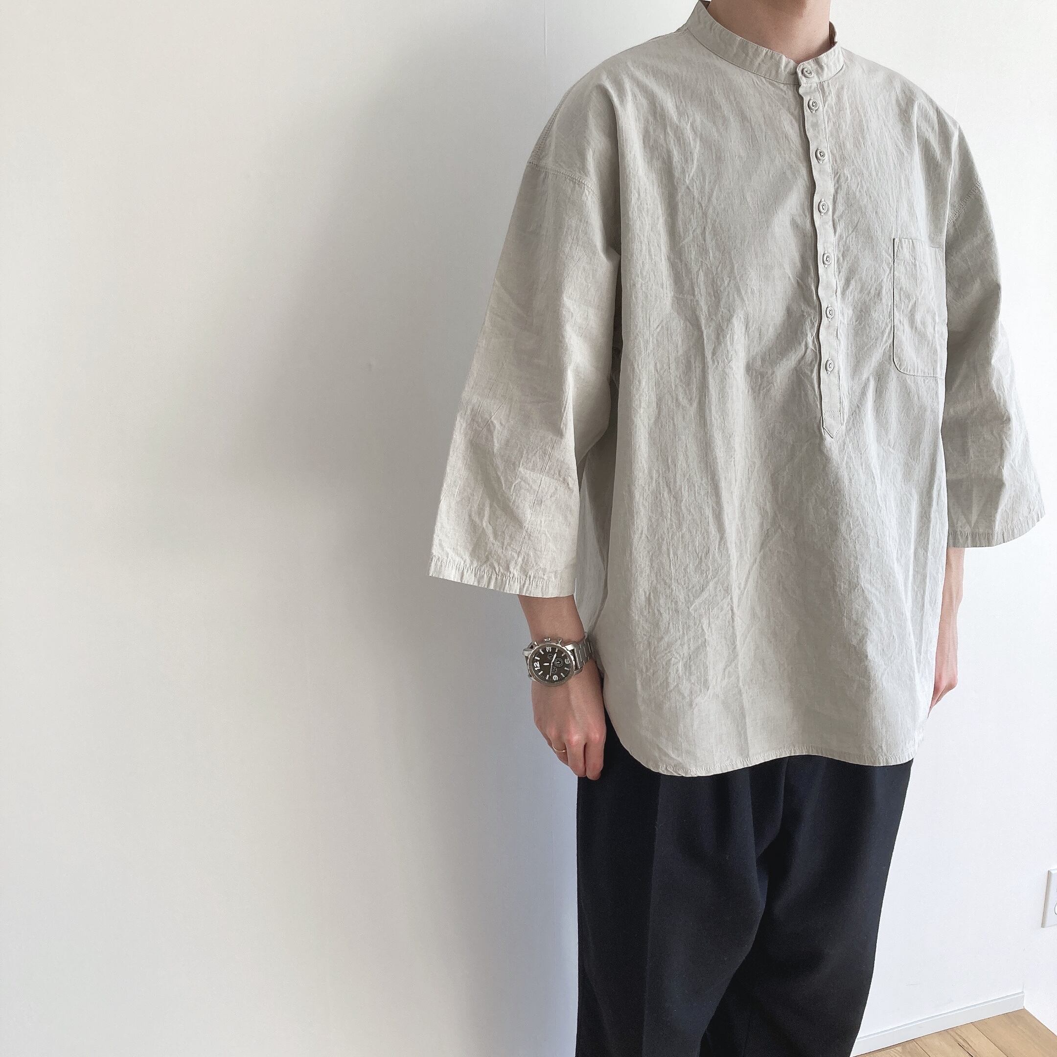 小さめの立ち襟に、肩はドロップしたシルエット、身幅、袖幅と幅を効かせたリラックス感のある7分袖シャツです。