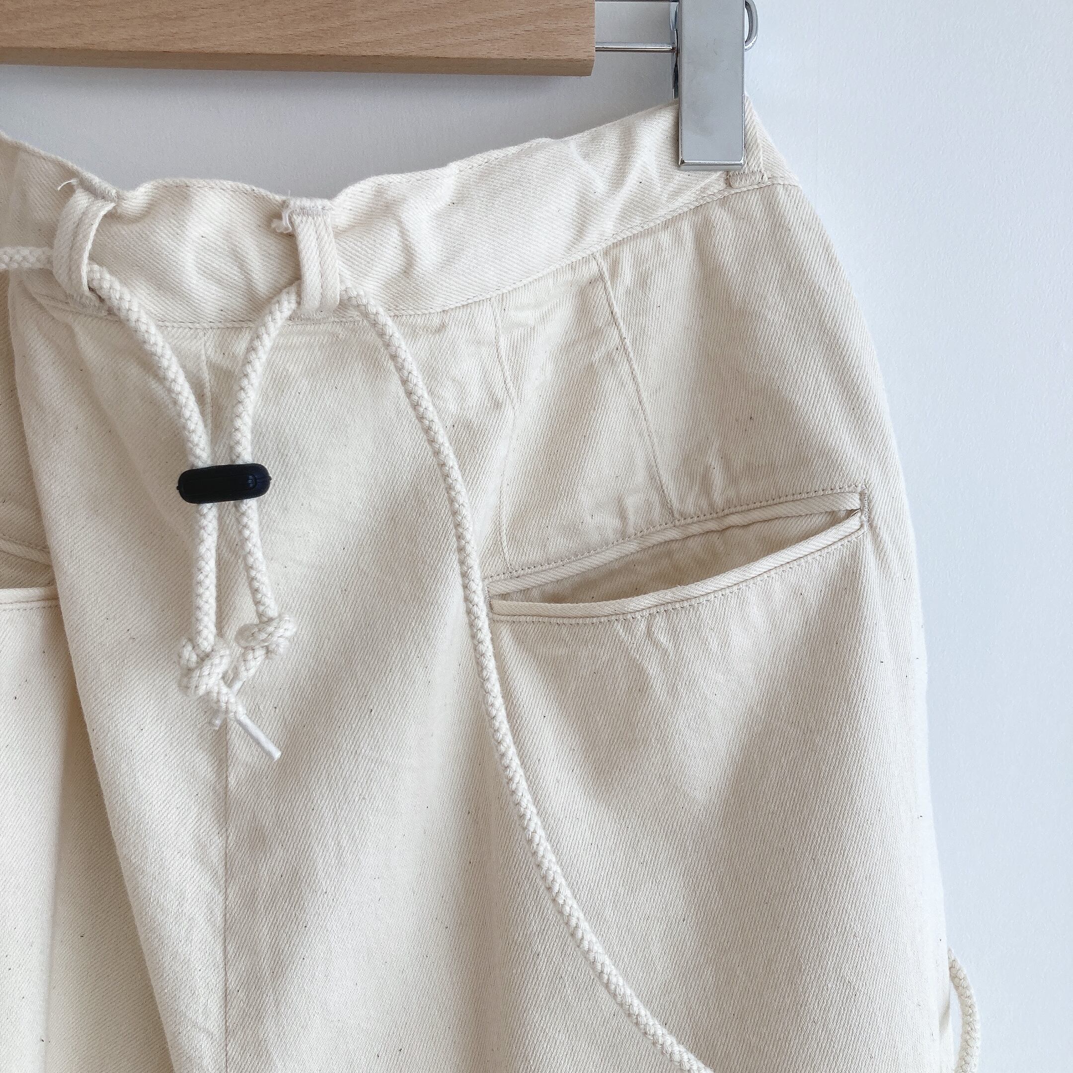 ウエストの後ろのストッパーで丸紐の長さを簡単に調整。