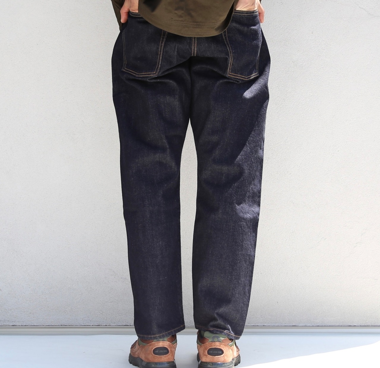 砂浜を散歩していても裾が濡れづらい8分丈のレングス。ウエスト、ヒップはゆったりと丸みのあるシルエットに、裾がテーパードのかかったスッキリとしたデニムです。
