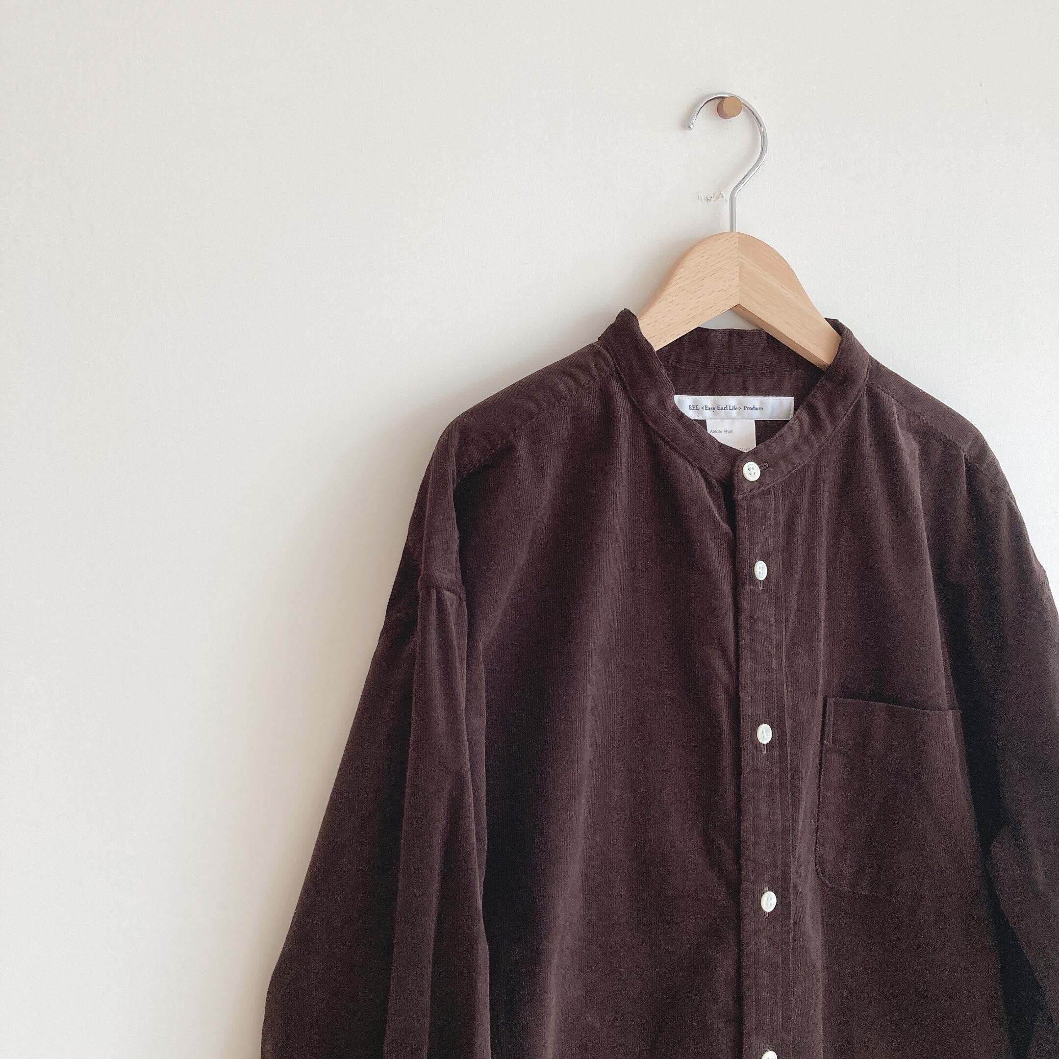 型は変わらずEEL Productsらしい細かな作りは健在で、サイズは身幅はほどよくゆったりと着心地が良く、リラックスして羽織れるシャツですね。