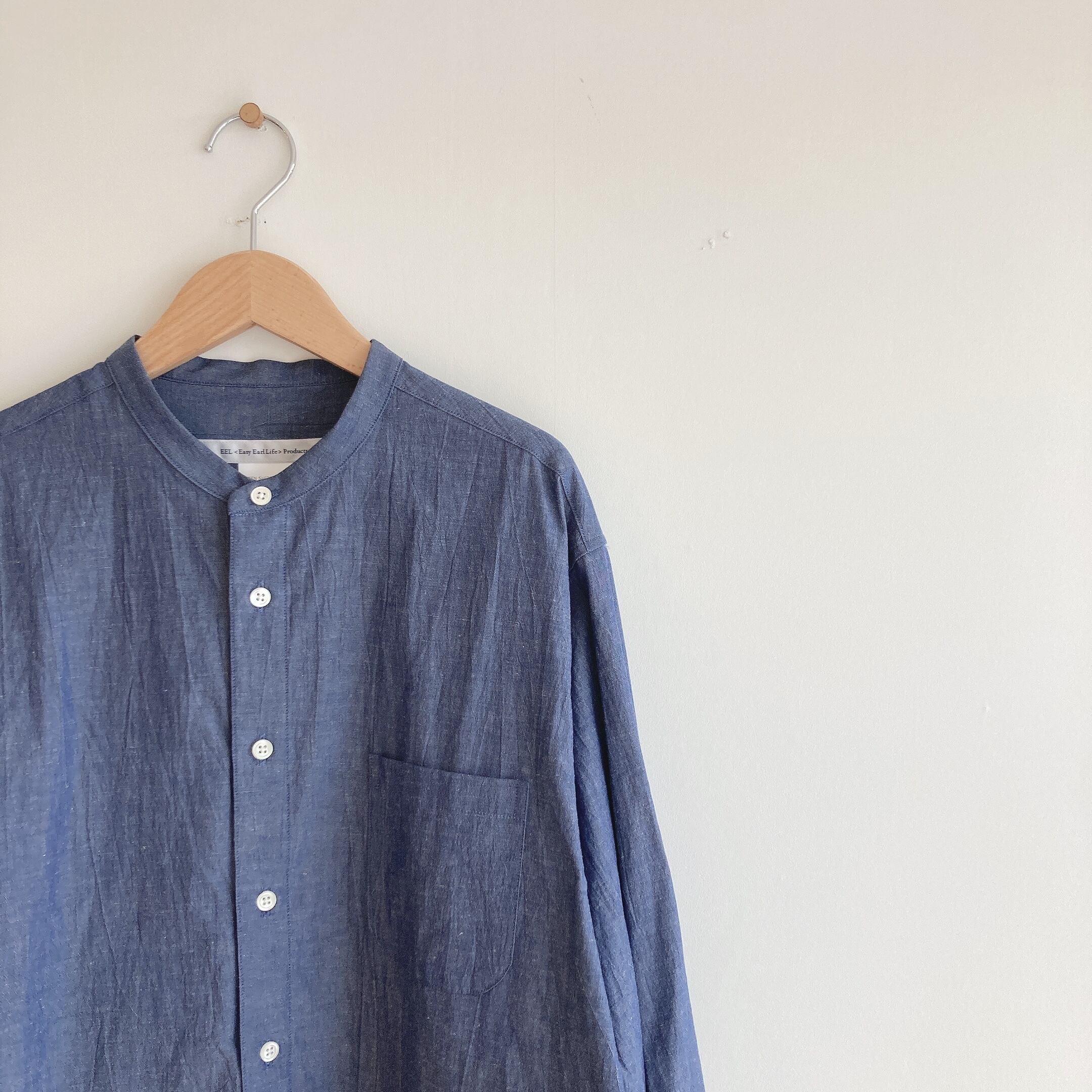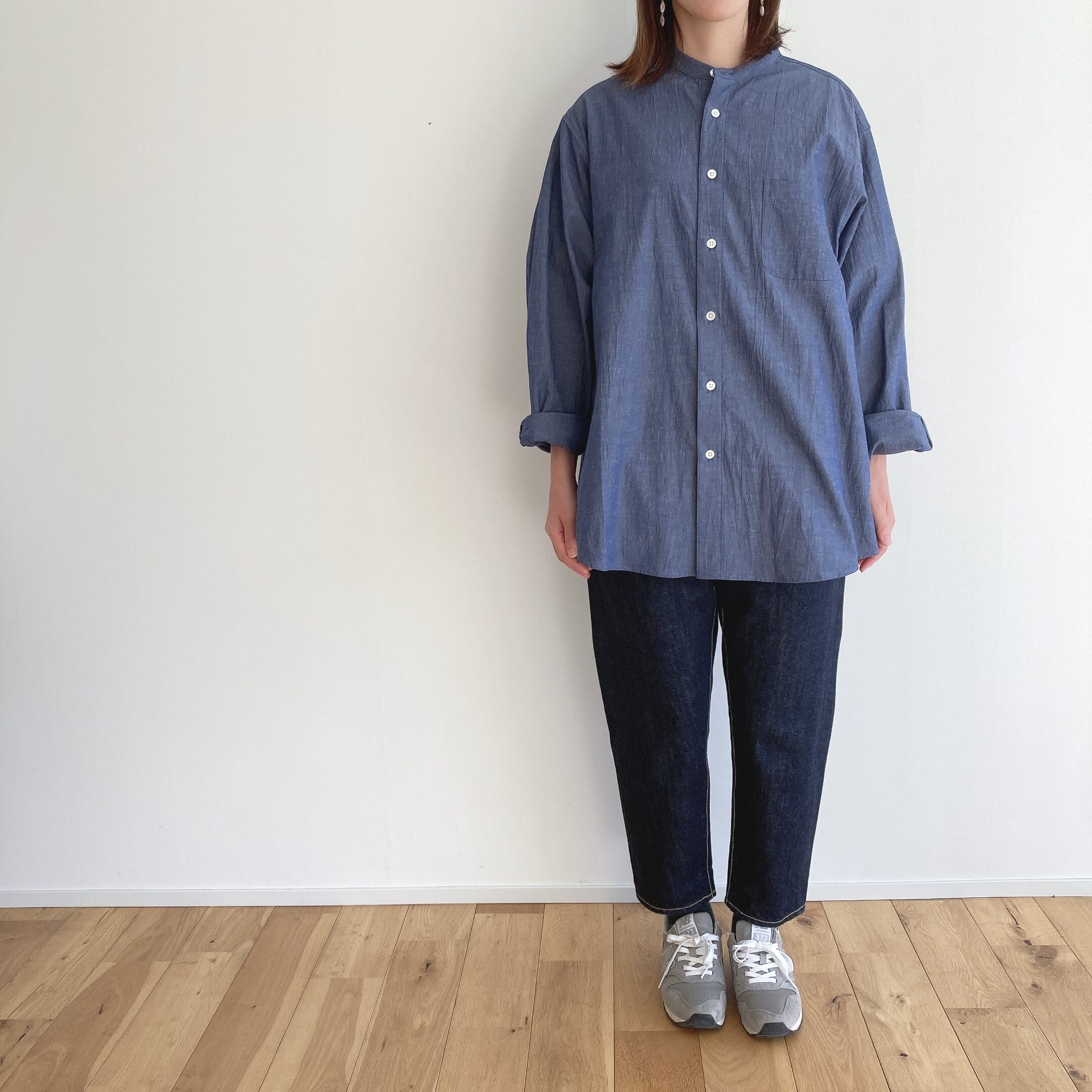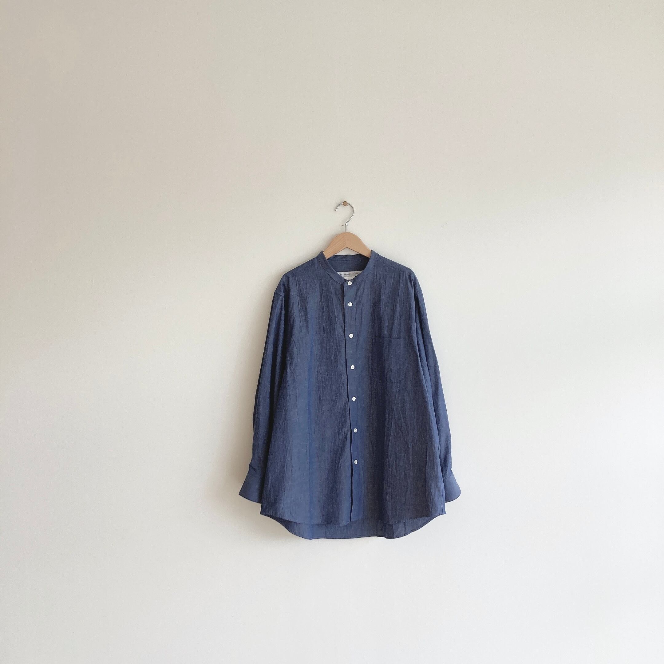 ふんわりとした身幅や袖幅、すっきりとしたバンドカラー、上品な生地と丁寧なドレスシャツ縫製が特徴。