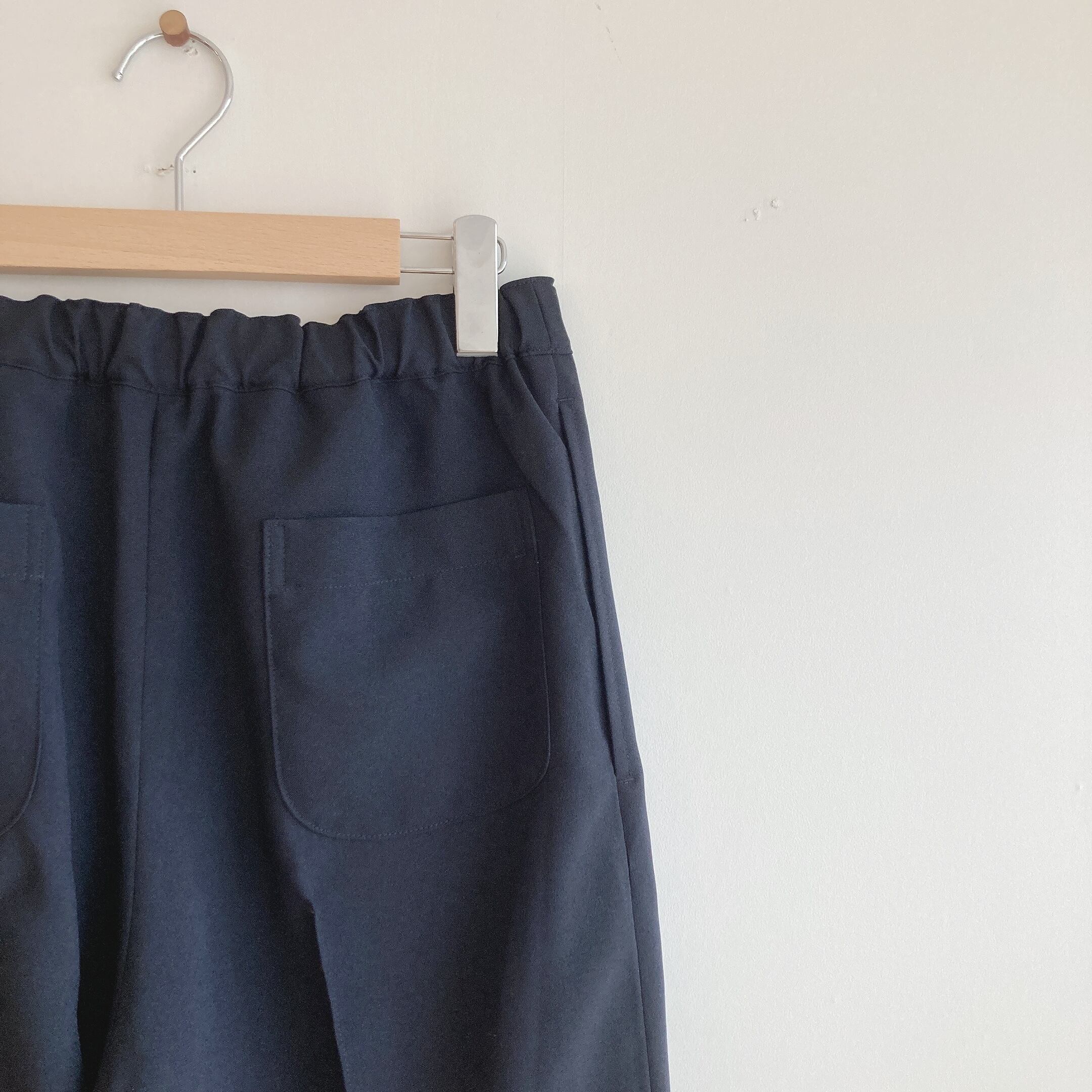ウエスト部分は総ゴムと紐で絞る事が出来るイージーパンツ仕様なので、幅広くリラックスして穿けます。シルエットは裾に向かってテーパードを効かせ、センタークリースにより綺麗な型を作っています。