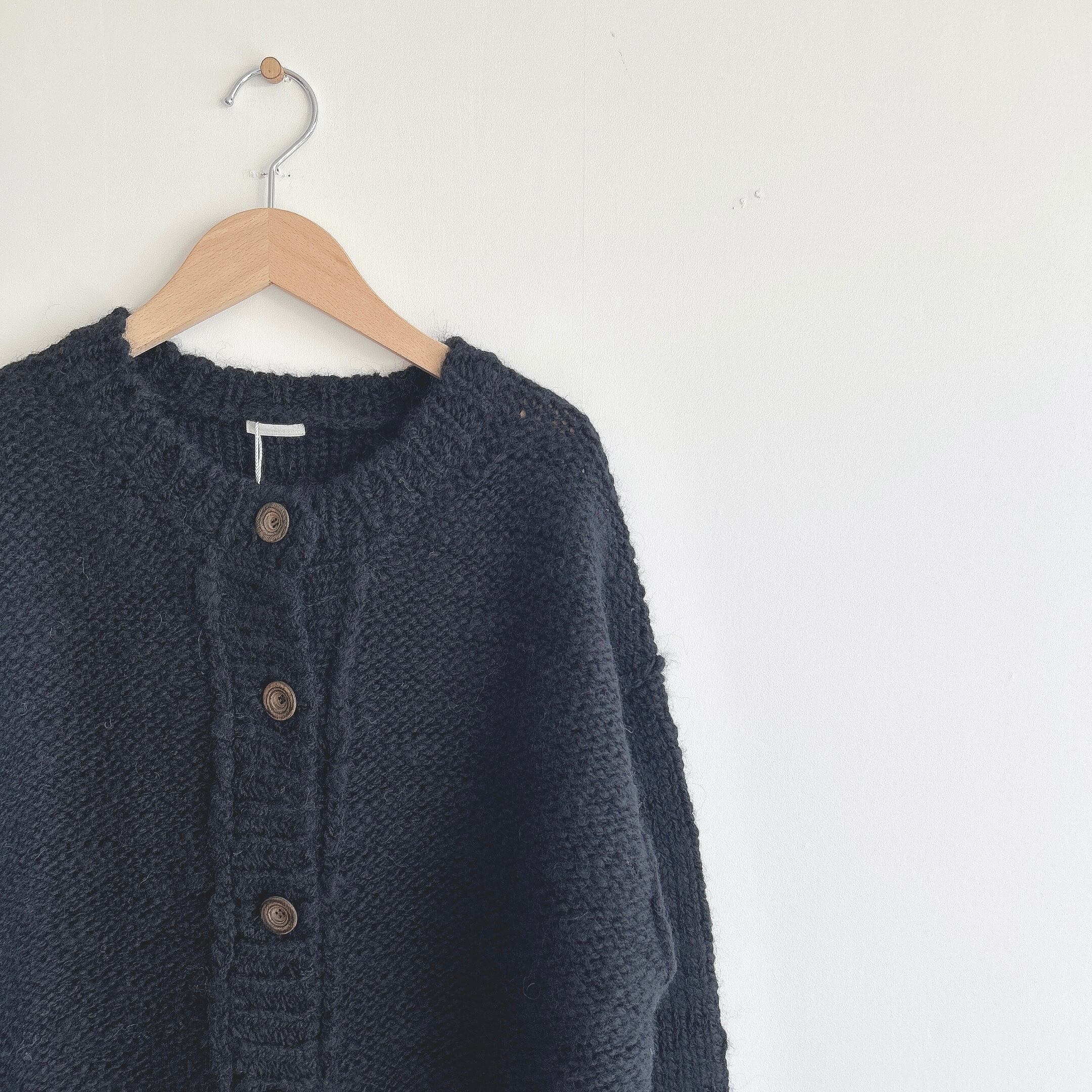 手編みニットに見えるのにとても軽く仕上がっていますし、身幅はゆったりとベーシックな型なのでスタイリングしやすく、楽に羽織っていただけるカーディガンです。