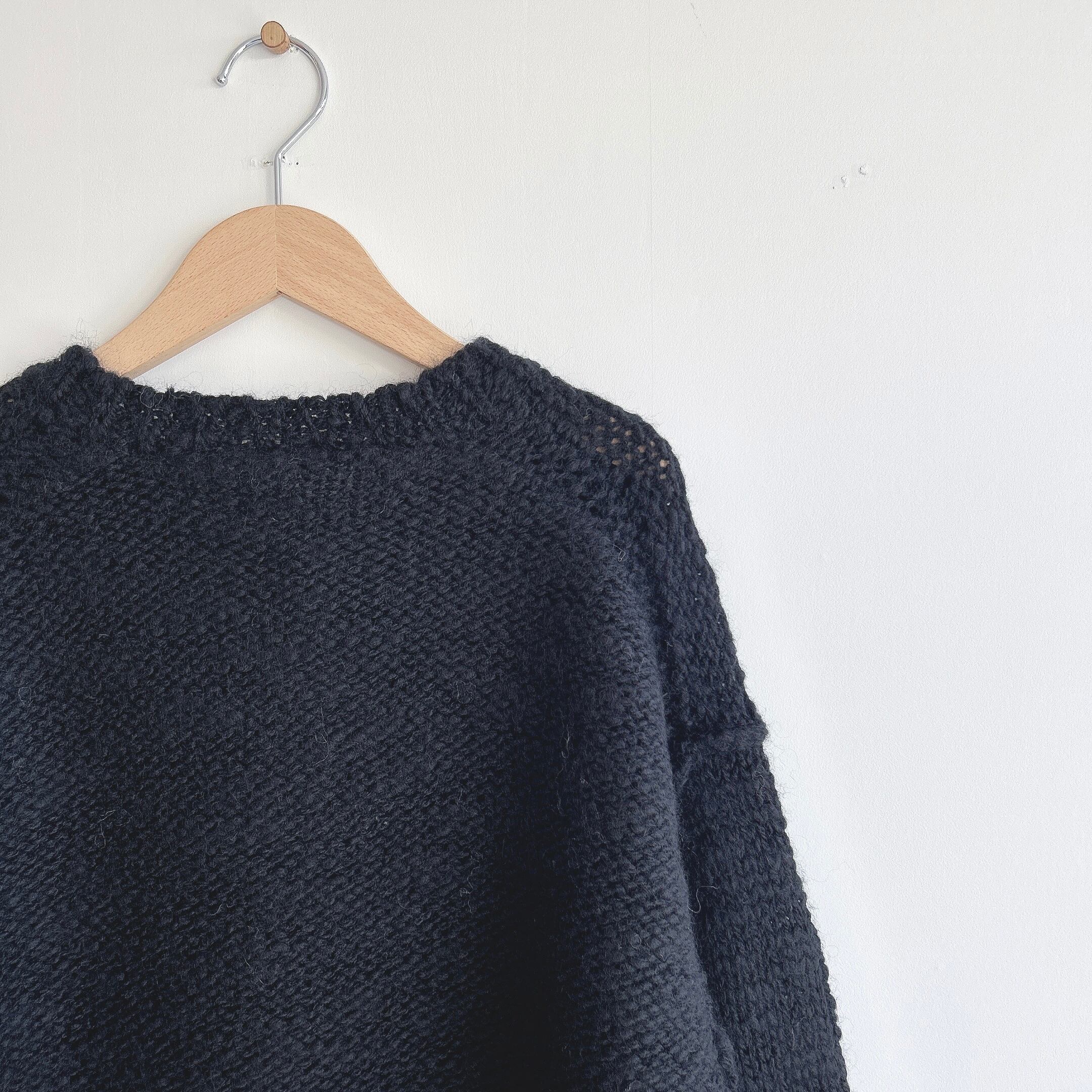 糸の厚さも手横編み機で編む一番ローゲージの1.5ゲージで編んでいて、ハンドリンキング部分(袖や前立て部分などパーツを組み合わせる)がチェーンステッチの様に見えるなどクラフト感を感じるのが特徴的です。