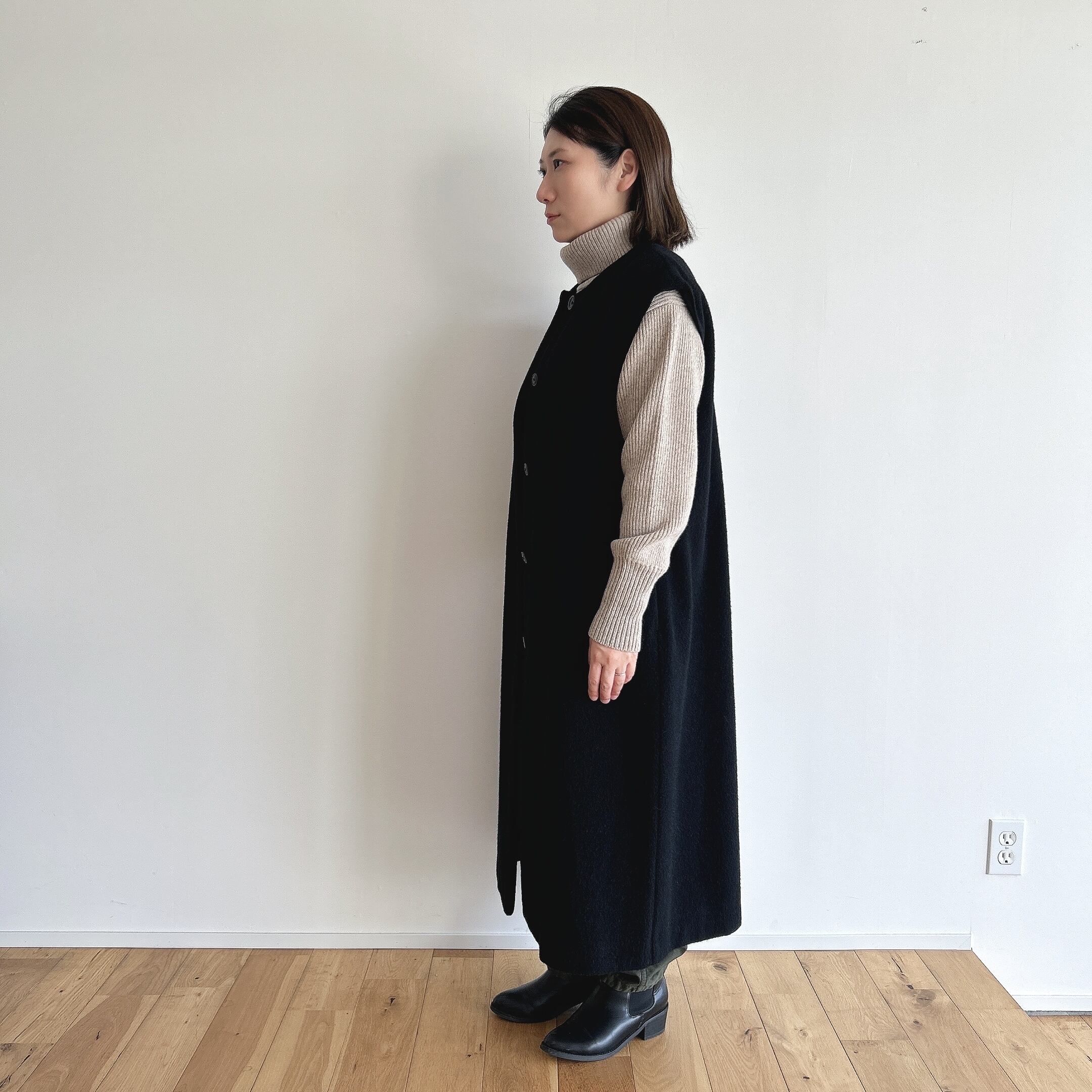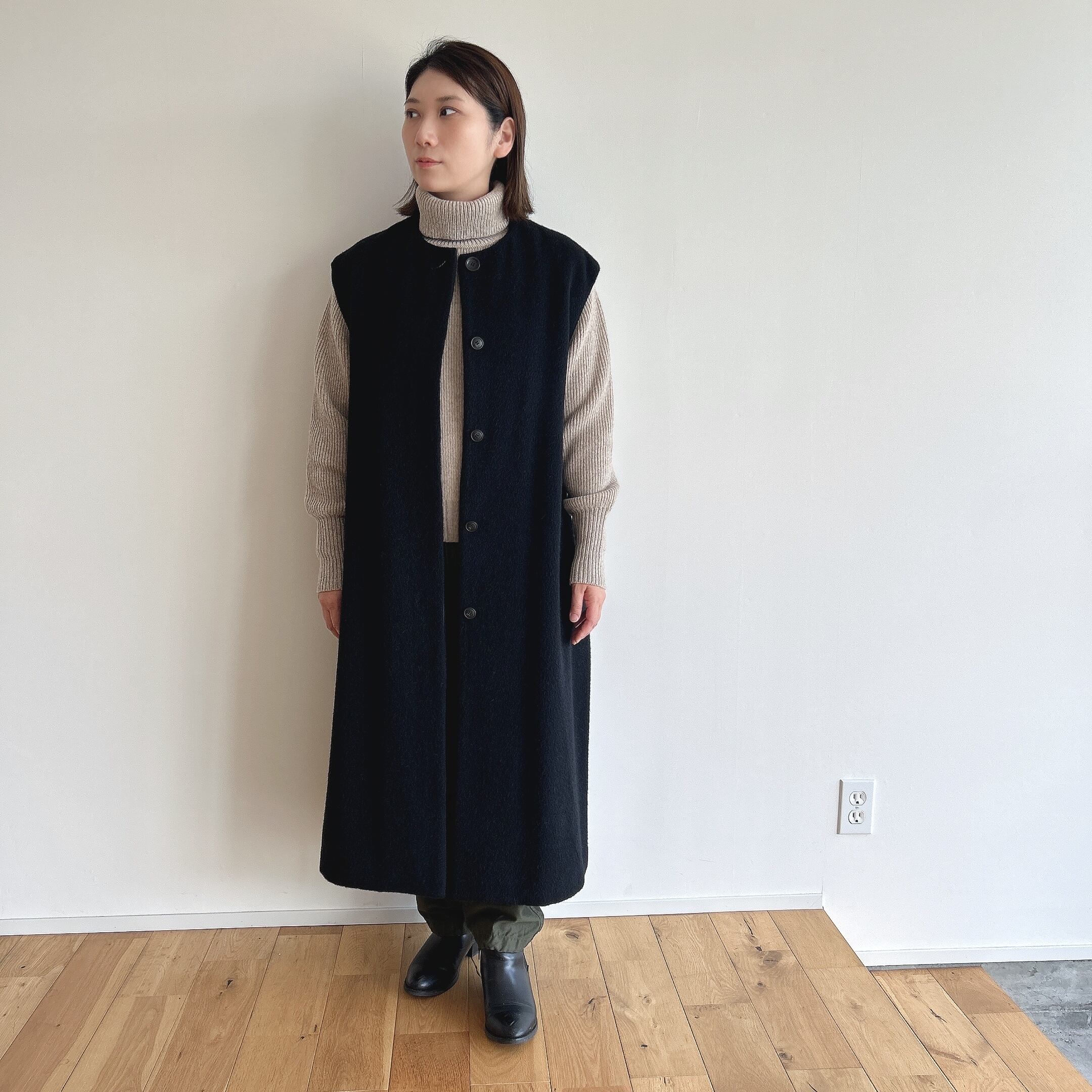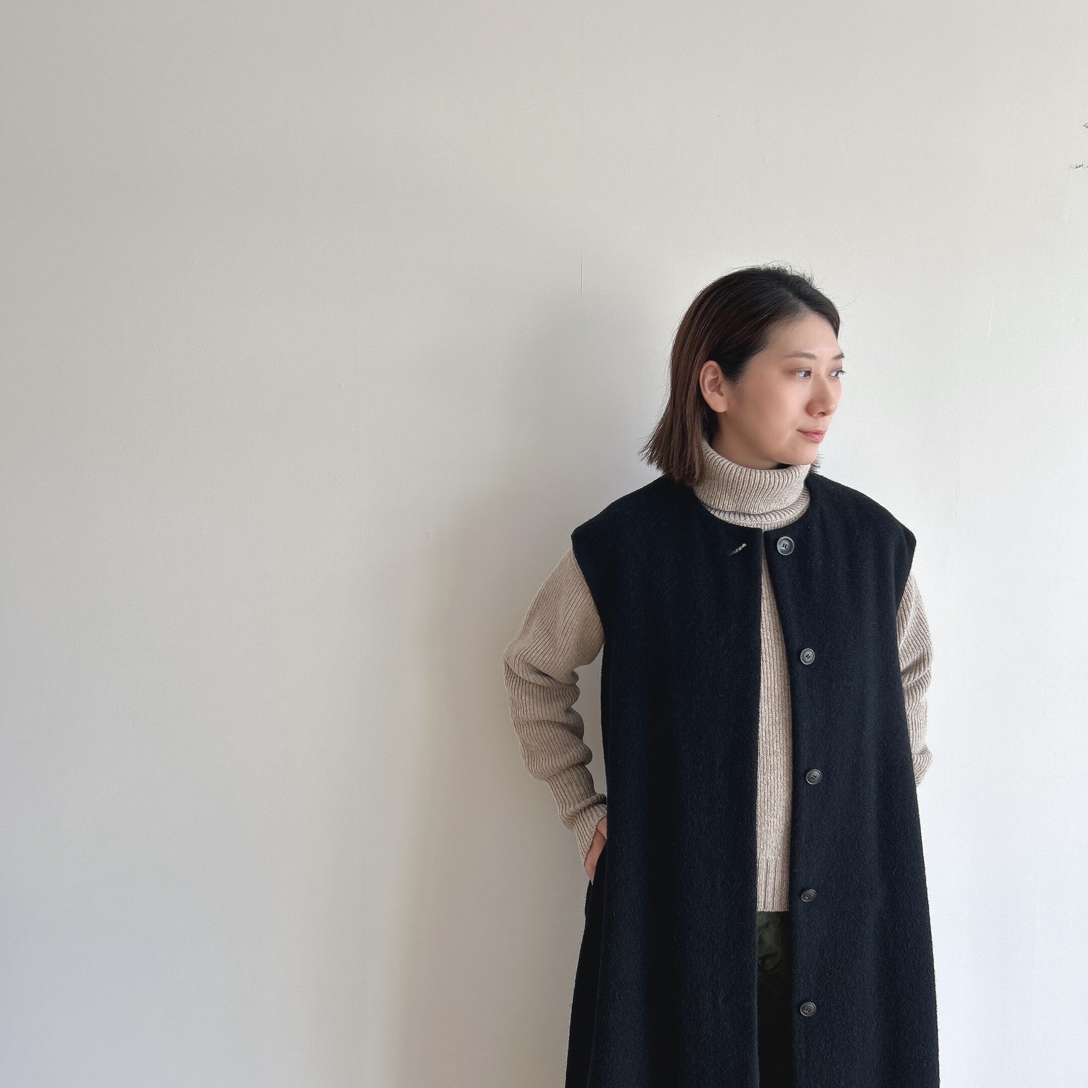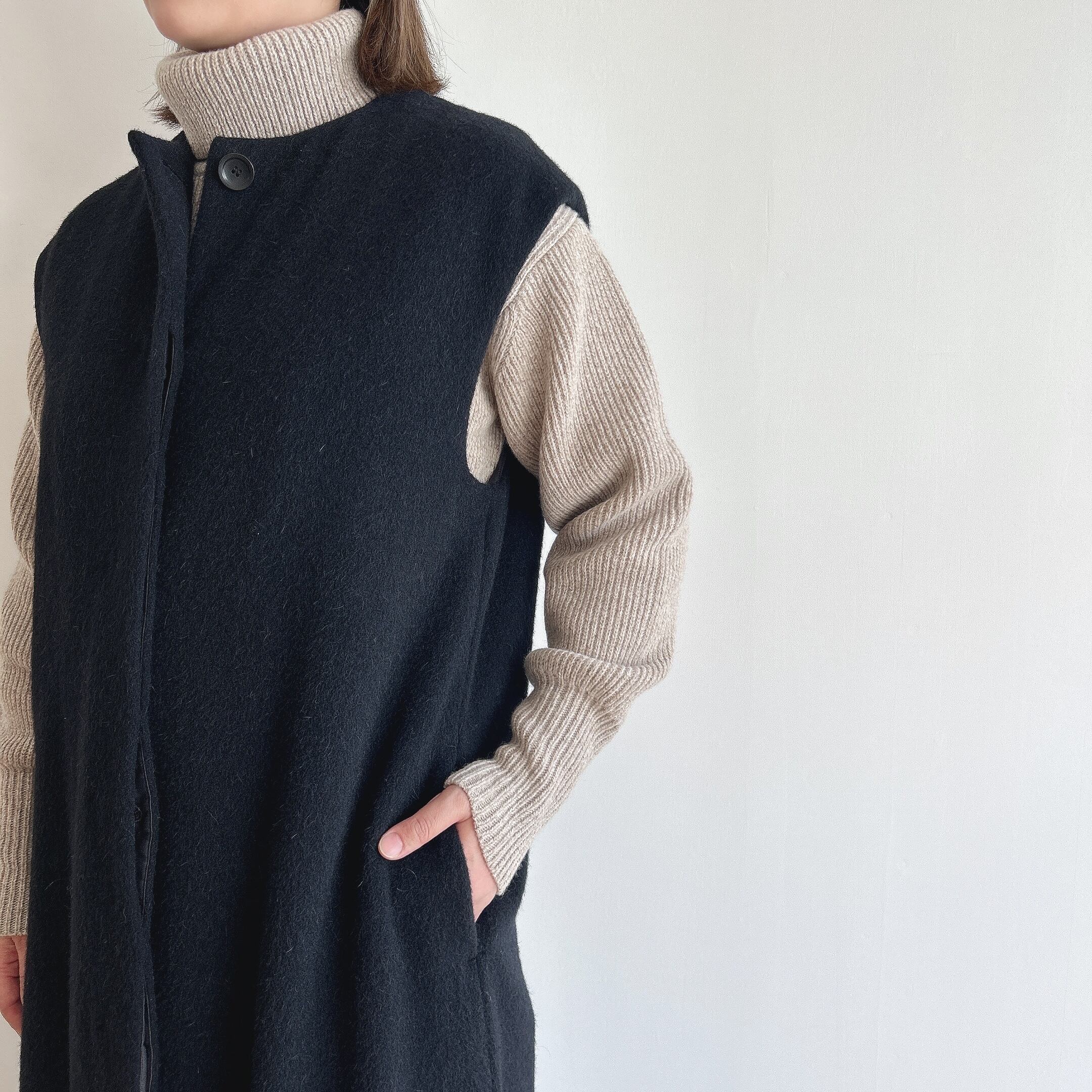 アームホールも幅を取ってあるのでニットの上にも羽織っていただけます。