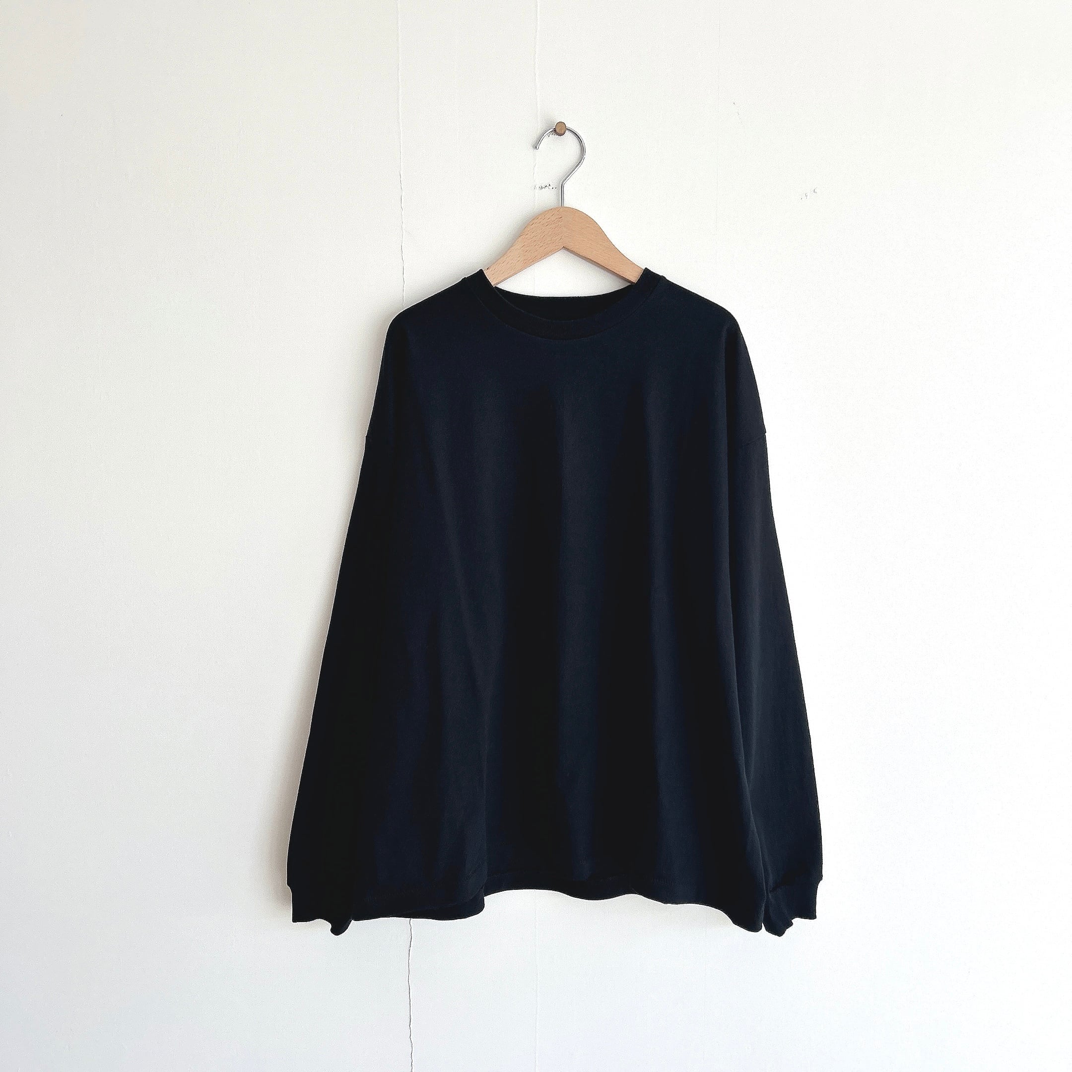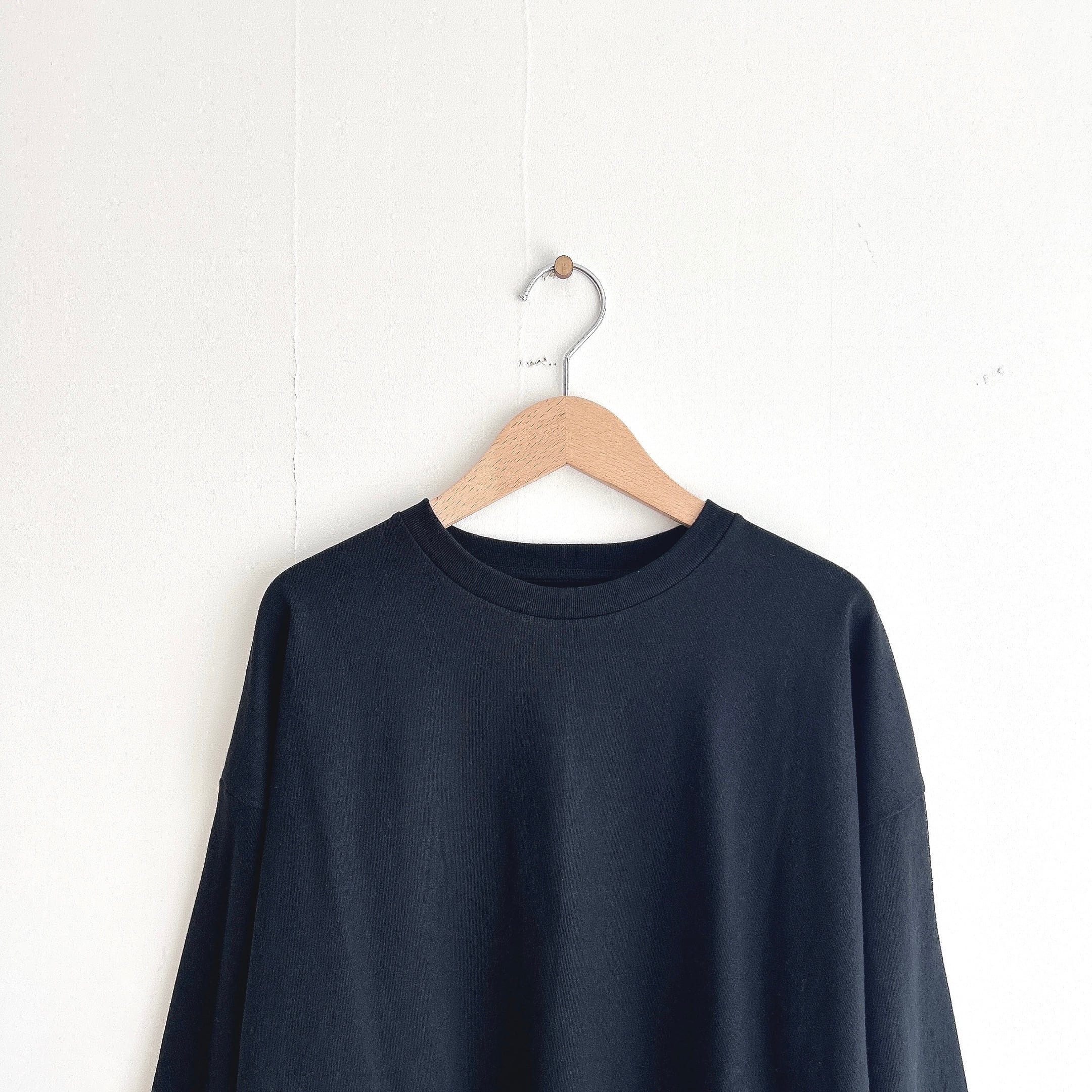 ヘビーウェイトなコットンで、Tシャツとスウェットの間くらいな肉厚感、丸胴仕様によってゆったりとリラックスして着れるようなサイズ感です。