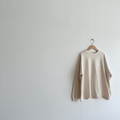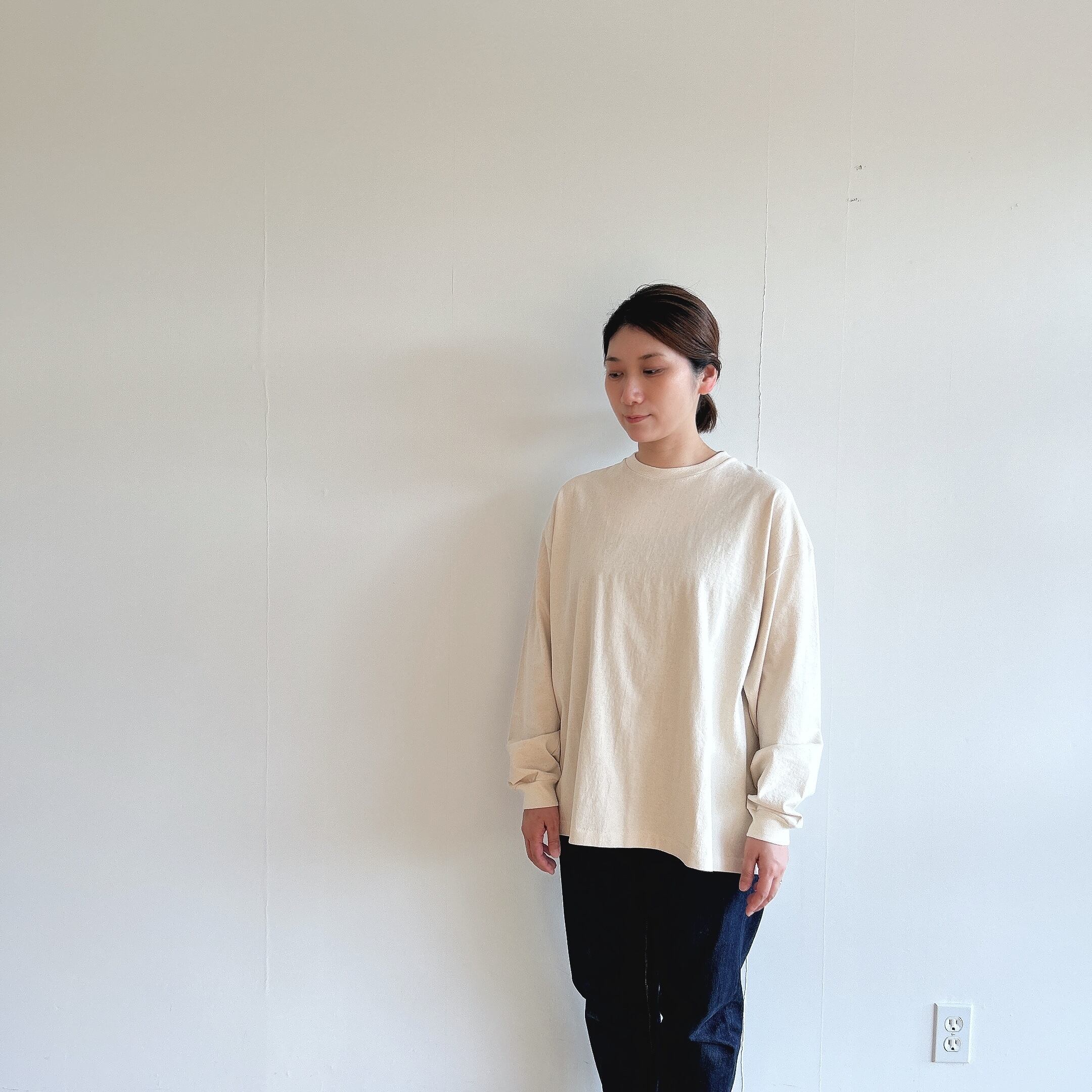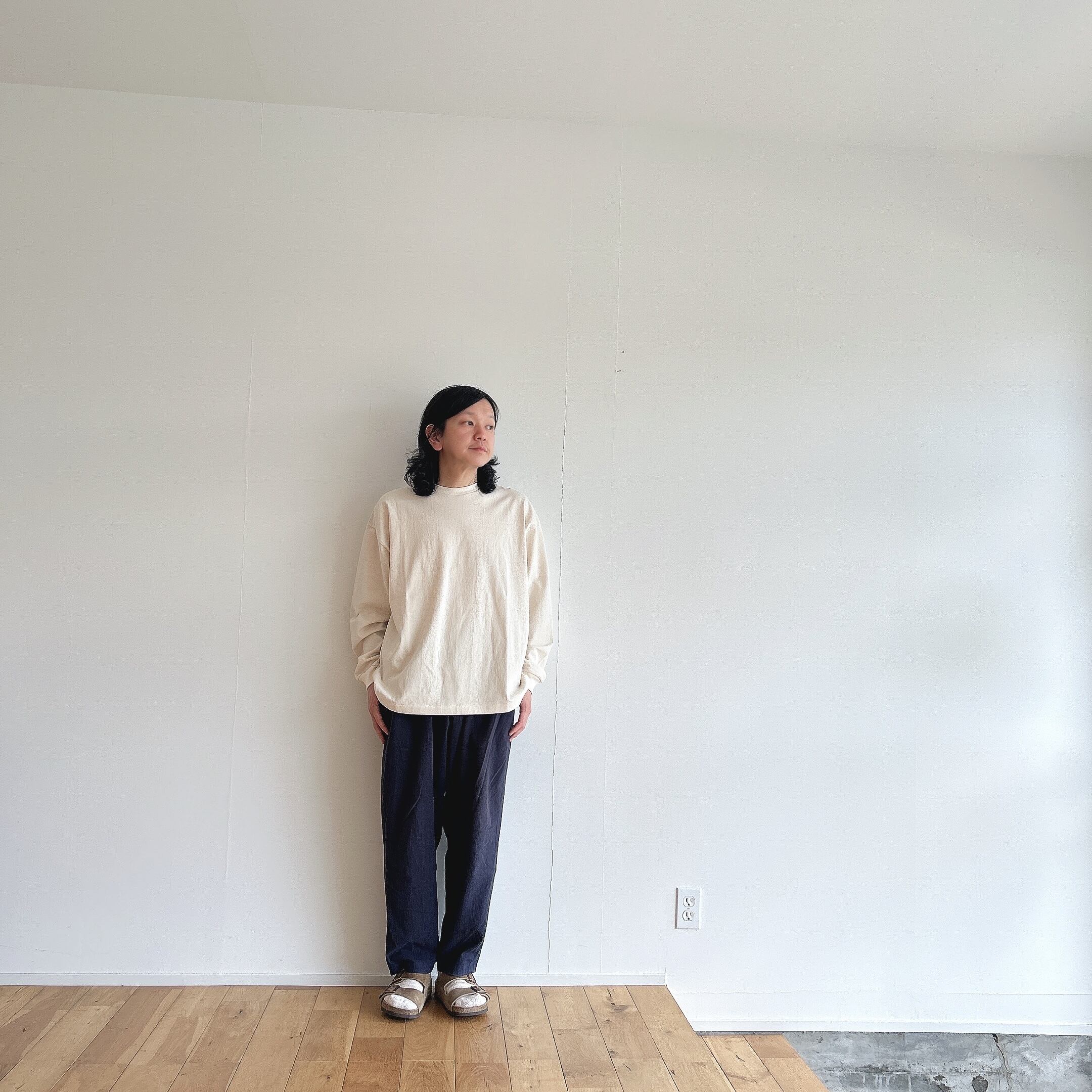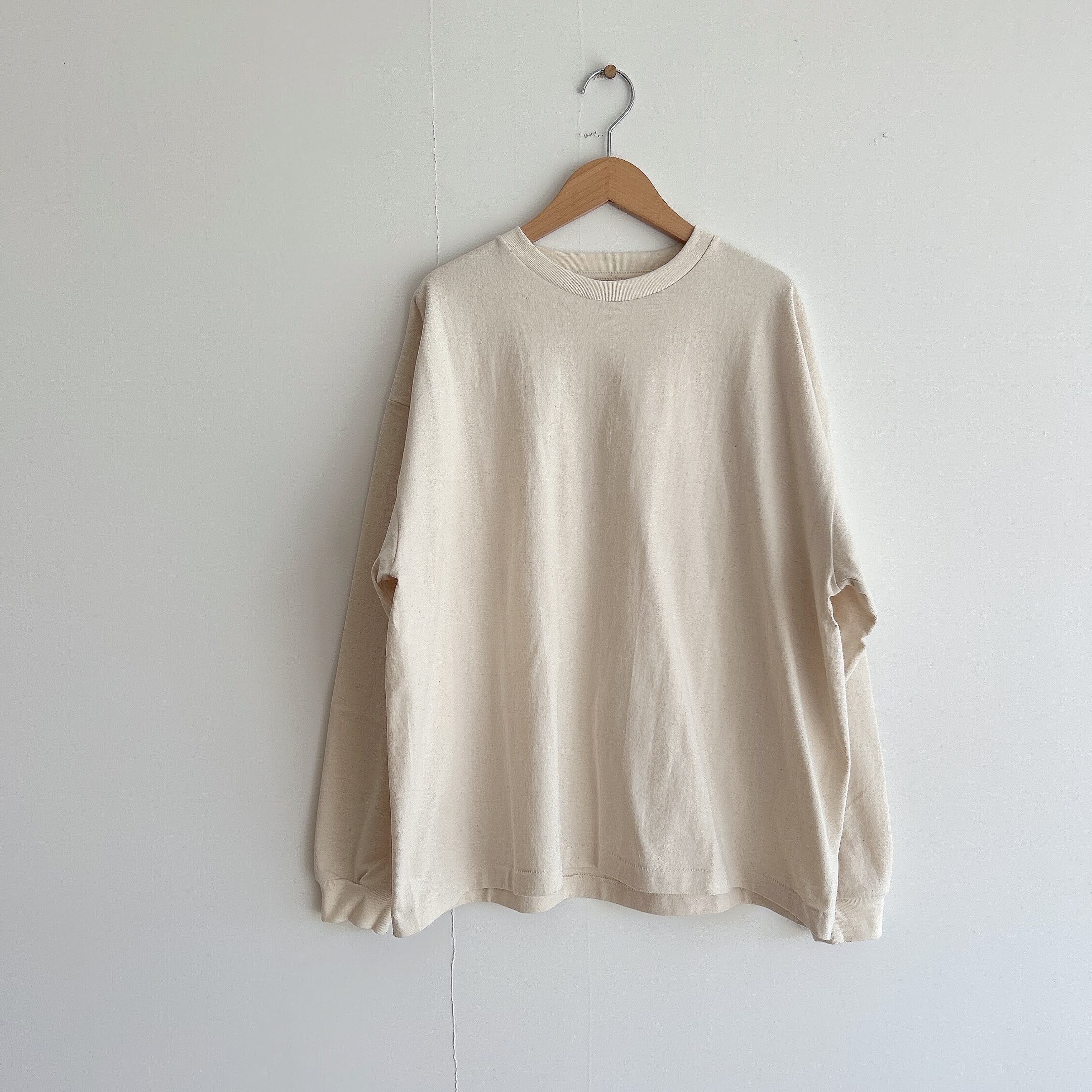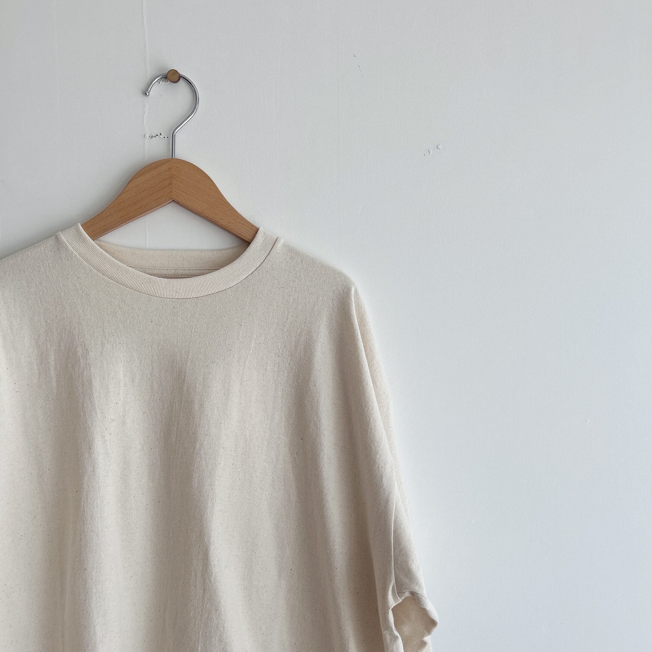 ヘビーウェイトなコットンで、Tシャツとスウェットの間くらいな肉厚感、丸胴仕様によってゆったりとリラックスして着れるようなサイズ感です。