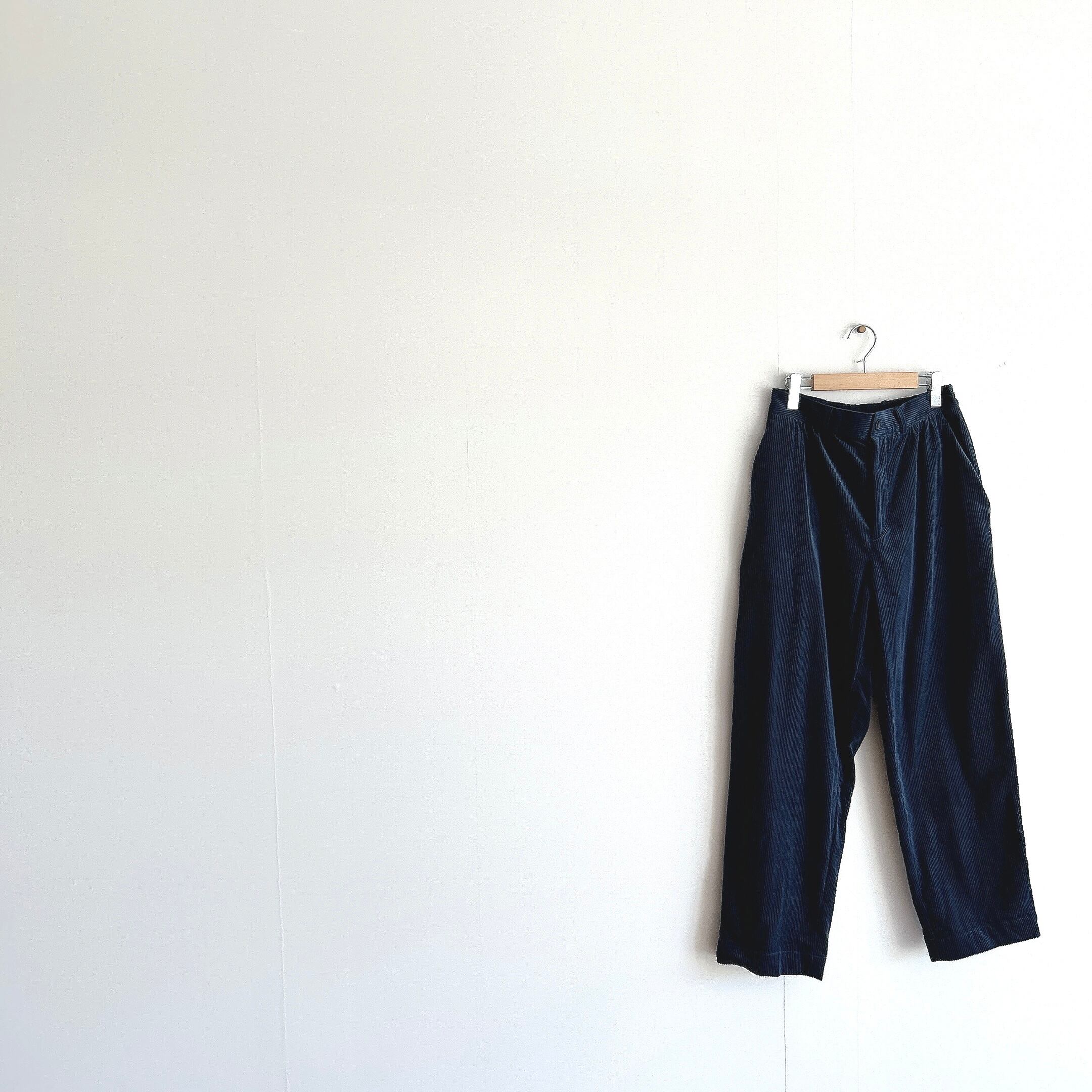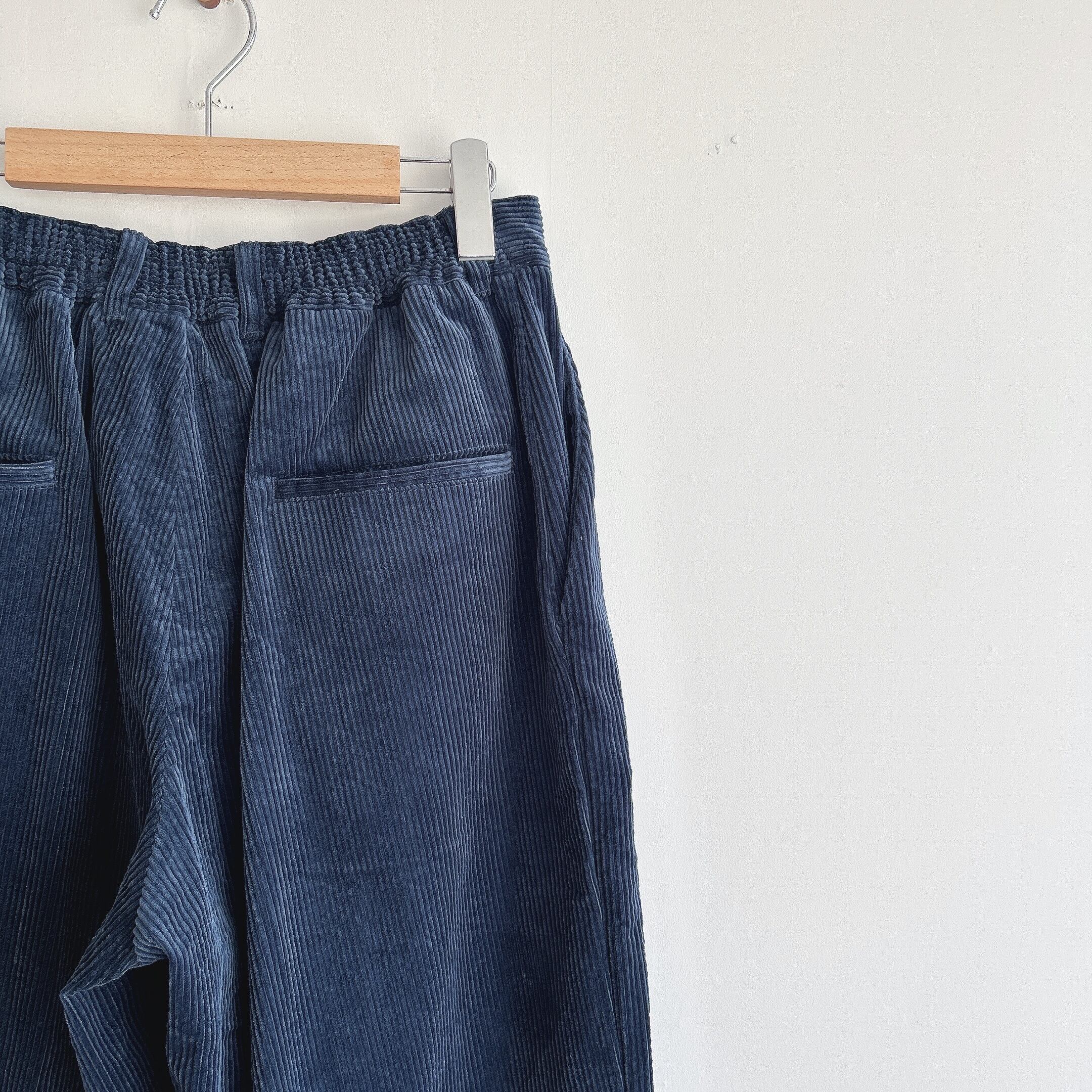 ウエスト後ろ部分はゴム仕様で楽に穿けて、ヒップ、太ももはゆったりと裾に向かって緩やかにテーパードをかけたようなシルエットです。
