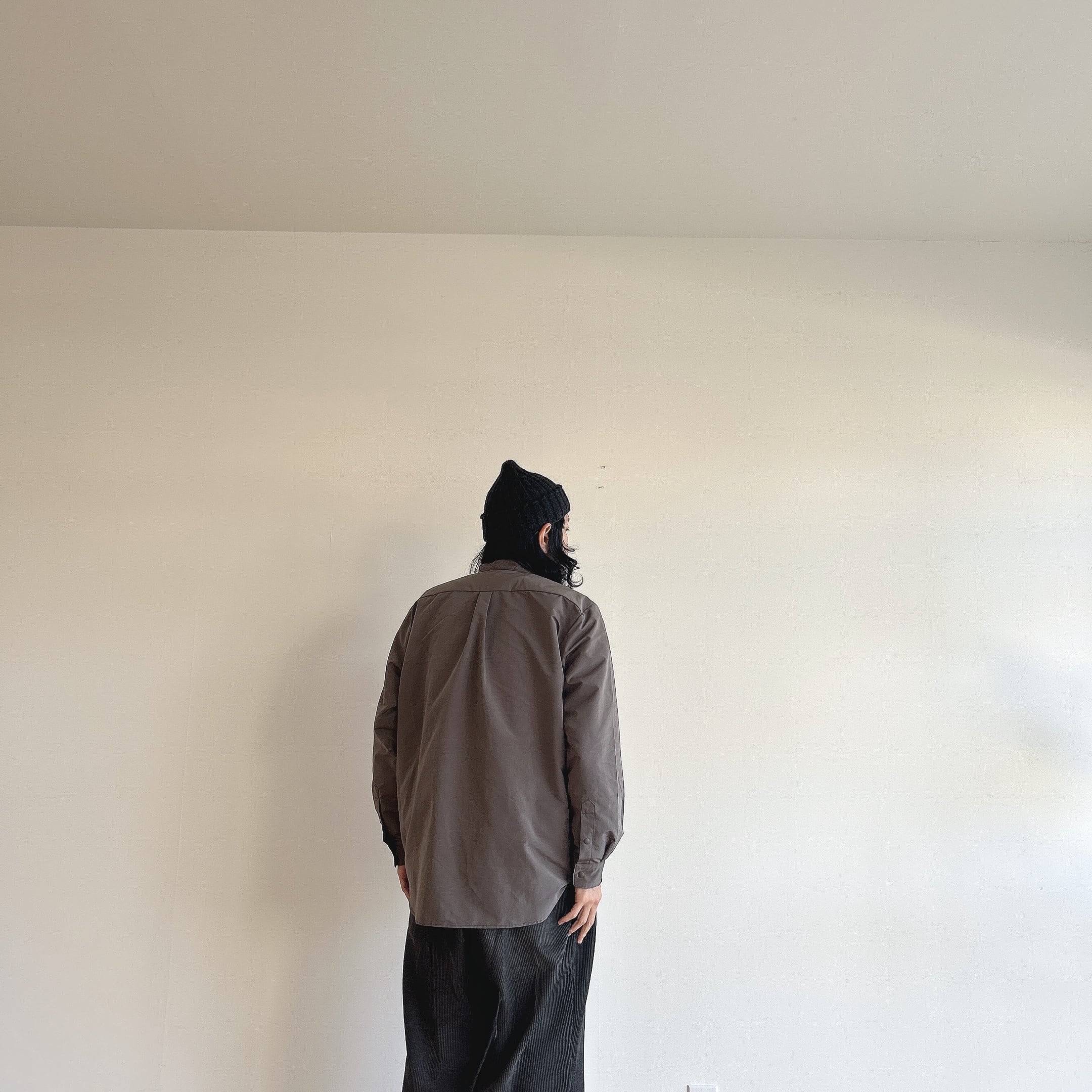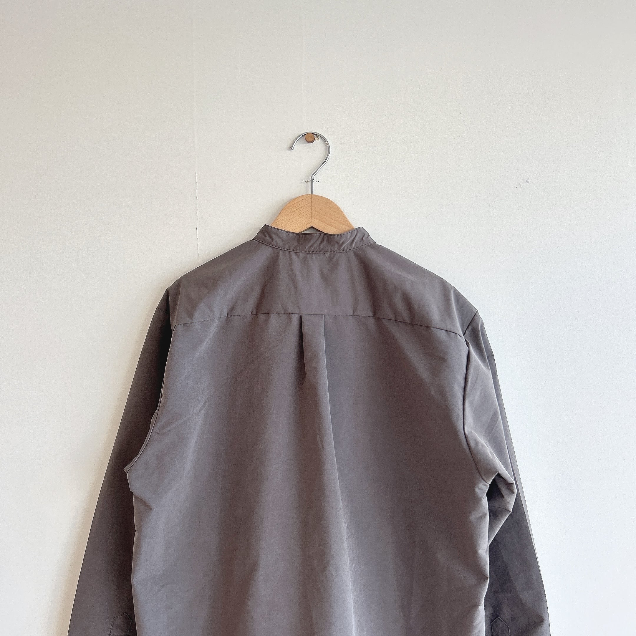 撥水機能のついたネーベルタフタのバンドカラーシャツ。